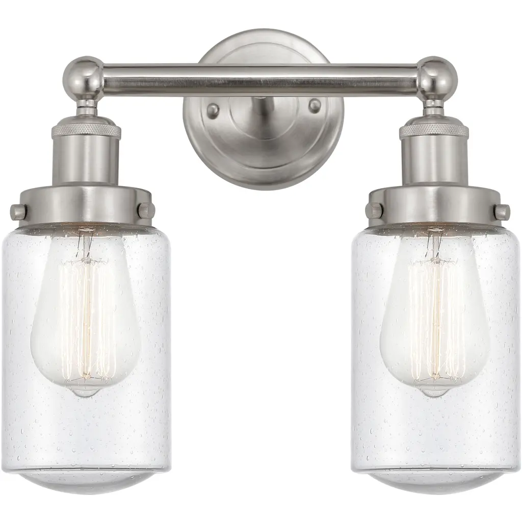 INNOVATIONS 616-2W-PN-G314 Dover 2 15.5 inch Bath Vanity Light Polished Nickel. Style: Art Nouveau, Industrial, Restoration-Vintage, Transitional . Collection Name: Edison. Metal Finish(Body): Polished Nickel. Metal Finish(Canopy/Backplate): Polished Nickel. Material: Steel, Cast Brass, Glass. Dimension(in): 11.875(H) x 13.5(W) x 6.75(Ext). Bulb: (2)60W Medium Base Incandescent(Not Included). Voltage: 120. Dimmable: Yes. Color Temperature (Kelvin): 2200. Color Rendering Index (CRI): 99.9. Lumens: 220. Life Expectancy (Hours): 2000. Glass Shade Description: Seedy Dover. Glass Type: Seedy; Ribbed. Shade Shape: Bowl. Glass or Metal Shade Color: Seedy. Shade Material: Glass. Shade Dimension(in): 4.5(W) x 6.625(H). Fitter Measurement (Glass Or Metal Shade Fitter Size): 3.25 inch Fitter. Backplate Dimension(in): 4.5(W) x 0.75(Depth). ADA Compliant: No. California Proposition 65 Warning Required: Yes. UL/ETL Certification Type: Damp Location.
