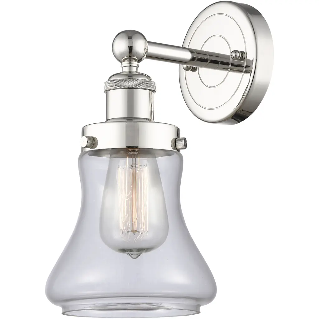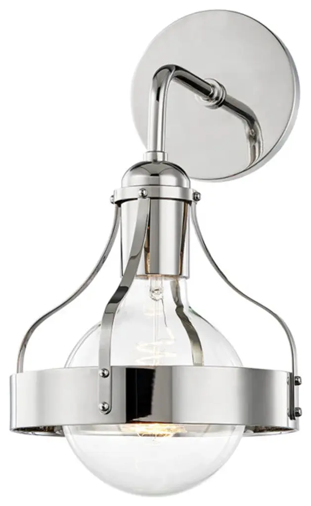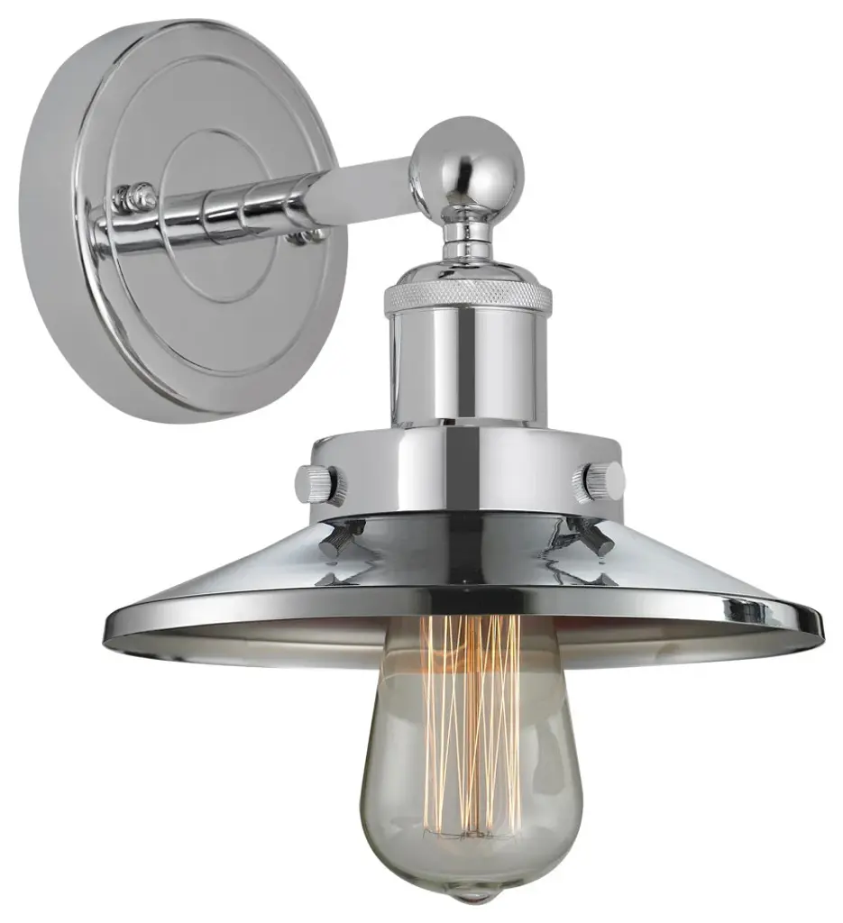 INNOVATIONS 616-1W-PN-M1-PN Edison 1 8 inch Sconce Polished Nickel. Style: Traditional, Industrial, Farmhouse, Restoration-Vintage. Collection Name: Downtown Urban. Metal Finish(Body): Polished Nickel. Metal Finish(Shade): Polished Nickel. Material: Steel, Cast Brass. Dimension(in): 7.25(H) x 8(W) x 8.5(Ext). Bulb: (1)60W Medium Base Incandescent(Not Included). Voltage: 120. Dimmable: Yes. Color Temperature (Kelvin): 2200. Color Rendering Index (CRI): 99.9. Lumens: 220. Life Expectancy (Hours): 2000. Shade Shape: Cone. Glass or Metal Shade Color: Polished Nickel. Shade Material: Metal. Metal Shade Description: Polished Nickel Railroad. Shade Dimension(in): 8(W) x 2(H). Fitter Measurement (Glass Or Metal Shade Fitter Size): 3.25 inch Fitter. ADA Compliant: No. California Proposition 65 Warning Required: Yes. UL/ETL Certification Type: Damp Location.