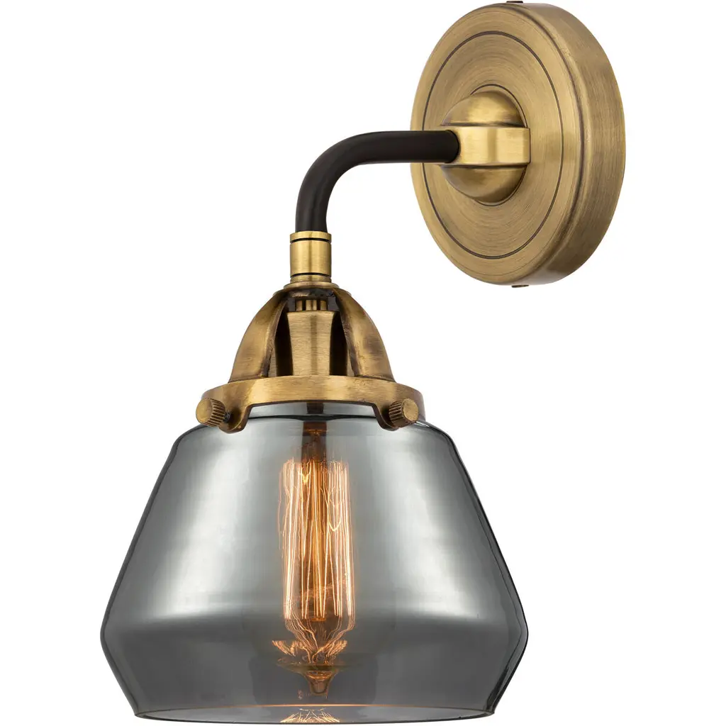 INNOVATIONS 616-1W-AC-G93 Fenton 1 6.5 inch Sconce Antique Copper. Style: Art Nouveau, Industrial, Restoration-Vintage, Transitional . Collection Name: Edison. Metal Finish(Body): Antique Copper. Metal Finish(Canopy/Backplate): Antique Copper. Material: Steel, Cast Brass, Glass. Dimension(in): 9.75(H) x 6.5(W) x 7.75(Ext). Bulb: (1)60W Medium Base Incandescent(Not Included). Voltage: 120. Dimmable: Yes. Color Temperature (Kelvin): 2200. Color Rendering Index (CRI): 99.9. Lumens: 220. Life Expectancy (Hours): 2000. Glass Shade Description: Plated Smoke Fenton. Glass Type: Colorful; Ribbed. Shade Shape: Bowl. Glass or Metal Shade Color: Plated Smoke. Shade Material: Glass. Shade Dimension(in): 6.5(W) x 4.5(H). Fitter Measurement (Glass Or Metal Shade Fitter Size): Neckless with a 1.75 inch opening. Backplate Dimension(in): 4.5(W) x 0.75(Depth). ADA Compliant: No. California Proposition 65 Warning Required: Yes. UL/ETL Certification Type: Damp Location.