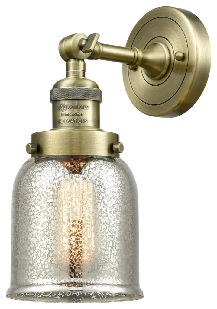 INNOVATIONS LIGHTING 203-BB-G58-LED Small Bell 1 Light Sconce part of the Franklin Restoration Collection. The Small Bell 1 Light Sconce is part of the Franklin Restoration Collection.Solid Brass 180 Degree Adjustable Swivel with internal teeth that lock in at 5 degree intervals With Engraved Cast Cup. Collection: Franklin Restoration. Material: Steel, Cast Brass, Glass. Metal Finish(Body): Brushed Brass. Metal Finish(Canopy/Backplate): Brushed Brass. Dimension(in): 5(W) x 12(H) x 7(Ext). Bulb: (1)3.5 Watt LED Vintage Medium Base Bulb Included,Dimmable. Color Temperature: 2700. Color Rendering Index(CRI): 82. Lumens): 350. Voltage: 120. Glass: Silver Plated Mercury Small Bell/Mercury. Shade Shape: Bell. Shade Material: Glass. Shade Size(in): 5 X 5.75. Shade Fitter Measurement: 3.25 inch Fitter. Canopy Dimension(in): 4.5. Backplate Dimension(in): 4.5x0.75. Solid Brass 180 Degree Adjustable Swivel with internal teeth that lock in at 5 degree intervals With Engraved Cast Cup. Fixture can be hung with bulbs facing up or down as a Wall Mount or Facing Down as a Ceiling Mount. UL/CUL Damp Rated. Warranty: 2 Year Finish, Lifetime Electrical.
