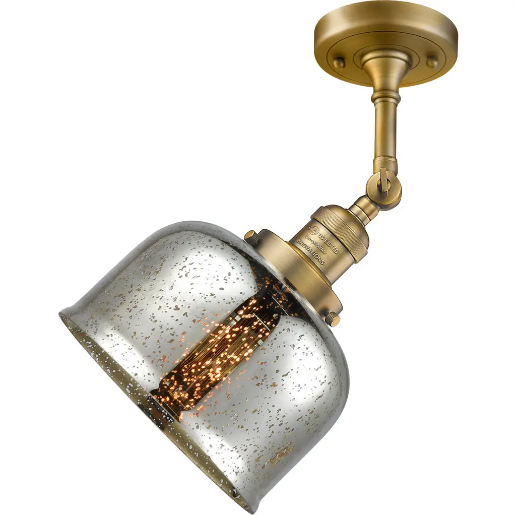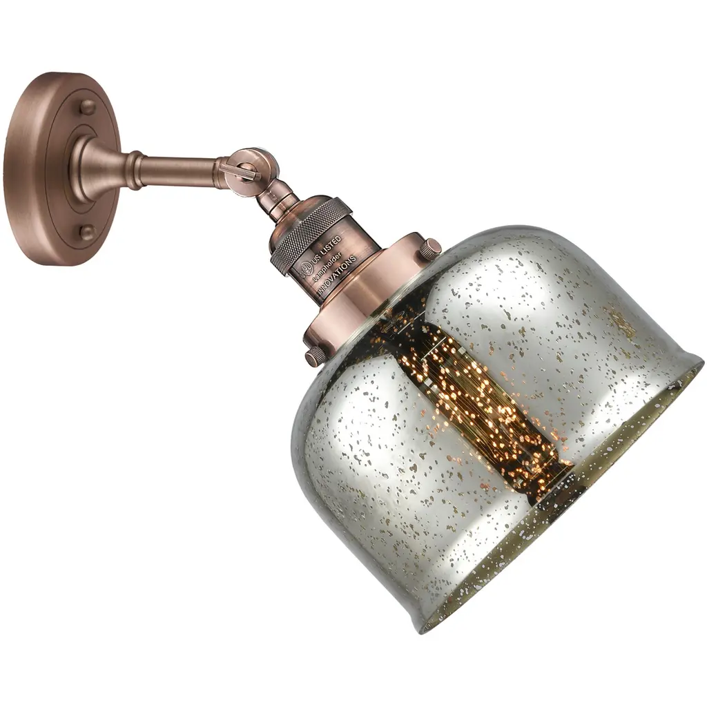 INNOVATIONS LIGHTING 203-AC-G78-LED Large Bell 1 Light Sconce part of the Franklin Restoration Collection. The Large Bell 1 Light Sconce is part of the Franklin Restoration Collection.Solid Brass 180 Degree Adjustable Swivel with internal teeth that lock in at 5 degree intervals With Engraved Cast Cup. Collection: Franklin Restoration. Material: Steel, Cast Brass, Glass. Metal Finish(Body): Antique Copper. Metal Finish(Canopy/Backplate): Antique Copper. Dimension(in): 8(W) x 12(H) x 9.375(Ext). Bulb: (1)3.5 Watt LED Vintage Medium Base Bulb Included,Dimmable. Color Temperature: 2700. Color Rendering Index(CRI): 82. Lumens): 350. Voltage: 120. Glass: Silver Plated Mercury Large Bell/Mercury. Shade Shape: Bell. Shade Material: Glass. Shade Size(in): 8 X 5.75. Shade Fitter Measurement: 3.25 inch Fitter. Canopy Dimension(in): 4.5. Backplate Dimension(in): 4.5x0.75. Solid Brass 180 Degree Adjustable Swivel with internal teeth that lock in at 5 degree intervals With Engraved Cast Cup. Fixture can be hung with bulbs facing up or down as a Wall Mount or Facing Down as a Ceiling Mount. UL/CUL Damp Rated. Warranty: 2 Year Finish, Lifetime Electrical.