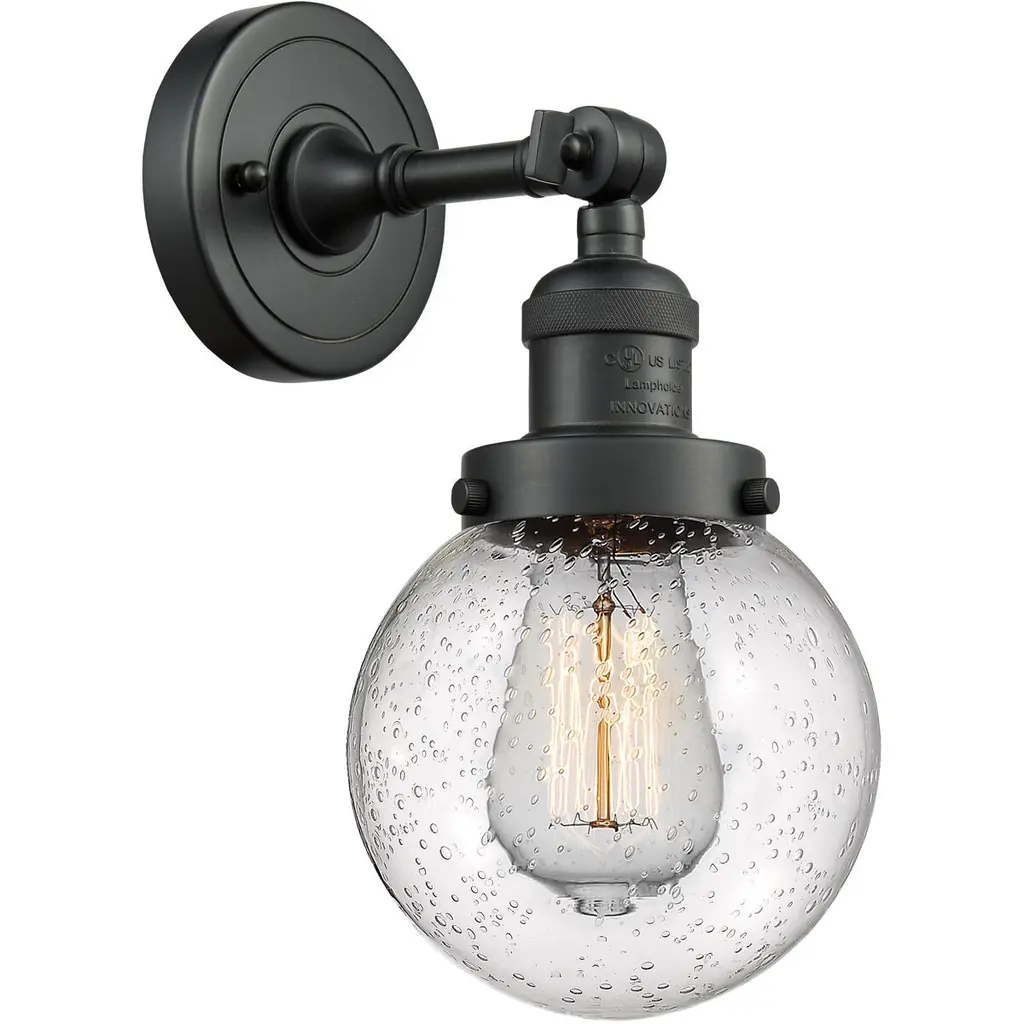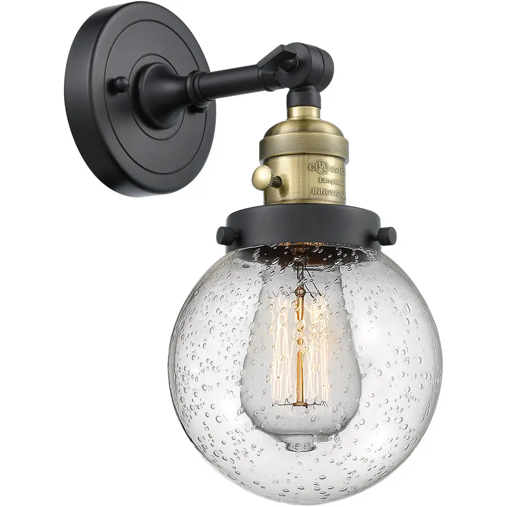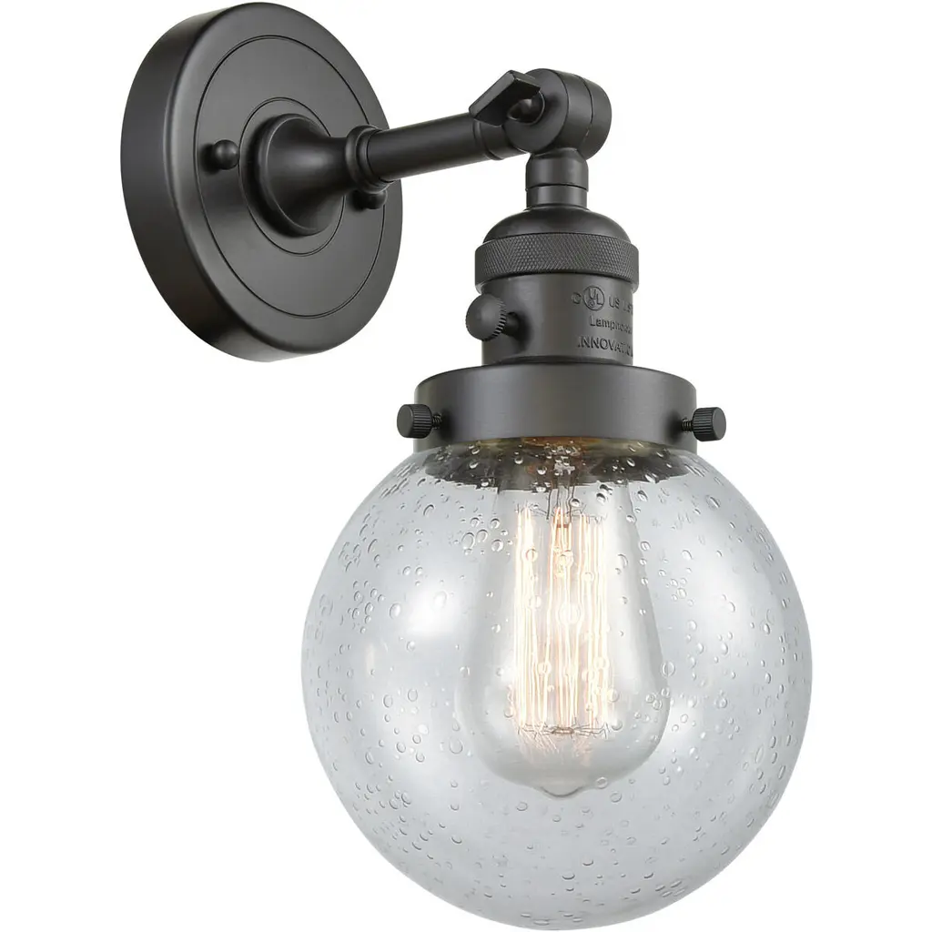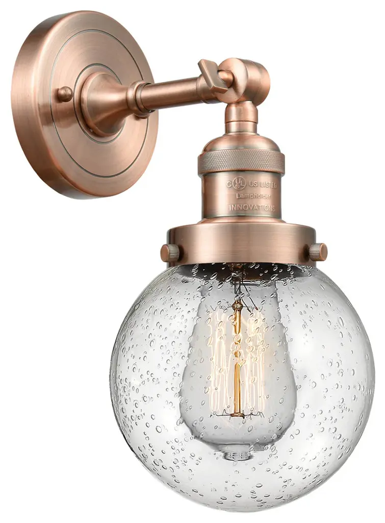 INNOVATIONS LIGHTING 203-AC-G204-8-LED Large Beacon 1 Light Sconce part of the Franklin Restoration Collection. The Large Beacon 1 Light Sconce is part of the Franklin Restoration Collection.Solid Brass 180 Degree Adjustable Swivel with internal teeth that lock in at 5 degree intervals With Engraved Cast Cup. Collection: Franklin Restoration. Material: Steel, Cast Brass, Glass. Metal Finish(Body): Antique Copper. Metal Finish(Canopy/Backplate): Antique Copper. Dimension(in): 8(W) x 14(H) x 9.125(Ext). Bulb: (1)3.5 Watt LED Vintage Medium Base Bulb Included,Dimmable. Color Temperature: 2700. Color Rendering Index(CRI): 82. Lumens): 350. Voltage: 120. Glass: Seedy Beacon/Seeded. Shade Shape: Globe. Shade Material: Glass. Shade Size(in): 8 X 7.75. Shade Fitter Measurement: 3.25 inch Fitter. Canopy Dimension(in): 4.5. Backplate Dimension(in): 4.5x0.75. Solid Brass 180 Degree Adjustable Swivel with internal teeth that lock in at 5 degree intervals With Engraved Cast Cup. Fixture can be hung with bulbs facing up or down as a Wall Mount or Facing Down as a Ceiling Mount. UL/CUL Damp Rated. Warranty: 2 Year Finish, Lifetime Electrical.