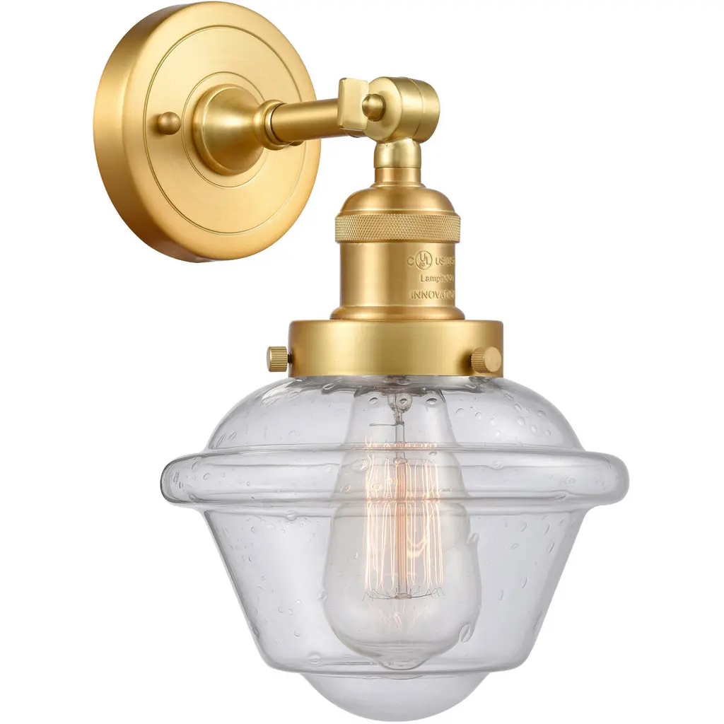 INNOVATIONS LIGHTING 203-AC-G534-LED Small Oxford 1 Light Sconce part of the Franklin Restoration Collection. The Small Oxford 1 Light Sconce is part of the Franklin Restoration Collection.Solid Brass 180 Degree Adjustable Swivel with internal teeth that lock in at 5 degree intervals With Engraved Cast Cup. Collection: Franklin Restoration. Material: Steel, Cast Brass, Glass. Metal Finish(Body): Antique Copper. Metal Finish(Canopy/Backplate): Antique Copper. Dimension(in): 7.5(W) x 12(H) x 9(Ext). Bulb: (1)3.5 Watt LED Vintage Medium Base Bulb Included,Dimmable. Color Temperature: 2700. Color Rendering Index(CRI): 82. Lumens): 350. Voltage: 120. Glass: Seedy Small Oxford/Seeded. Shade Shape: Schoolhouse. Shade Material: Glass. Shade Size(in): 7.5 X 5.75. Shade Fitter Measurement: 3.25 inch Fitter. Canopy Dimension(in): 4.5. Backplate Dimension(in): 4.5x0.75. Solid Brass 180 Degree Adjustable Swivel with internal teeth that lock in at 5 degree intervals With Engraved Cast Cup. Fixture can be hung with bulbs facing up or down as a Wall Mount or Facing Down as a Ceiling Mount. UL/CUL Damp Rated. Warranty: 2 Year Finish, Lifetime Electrical.