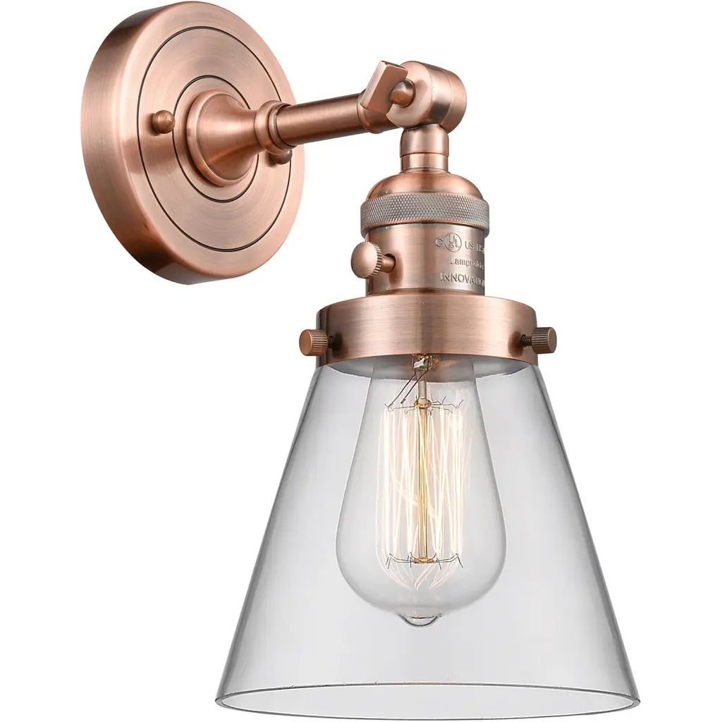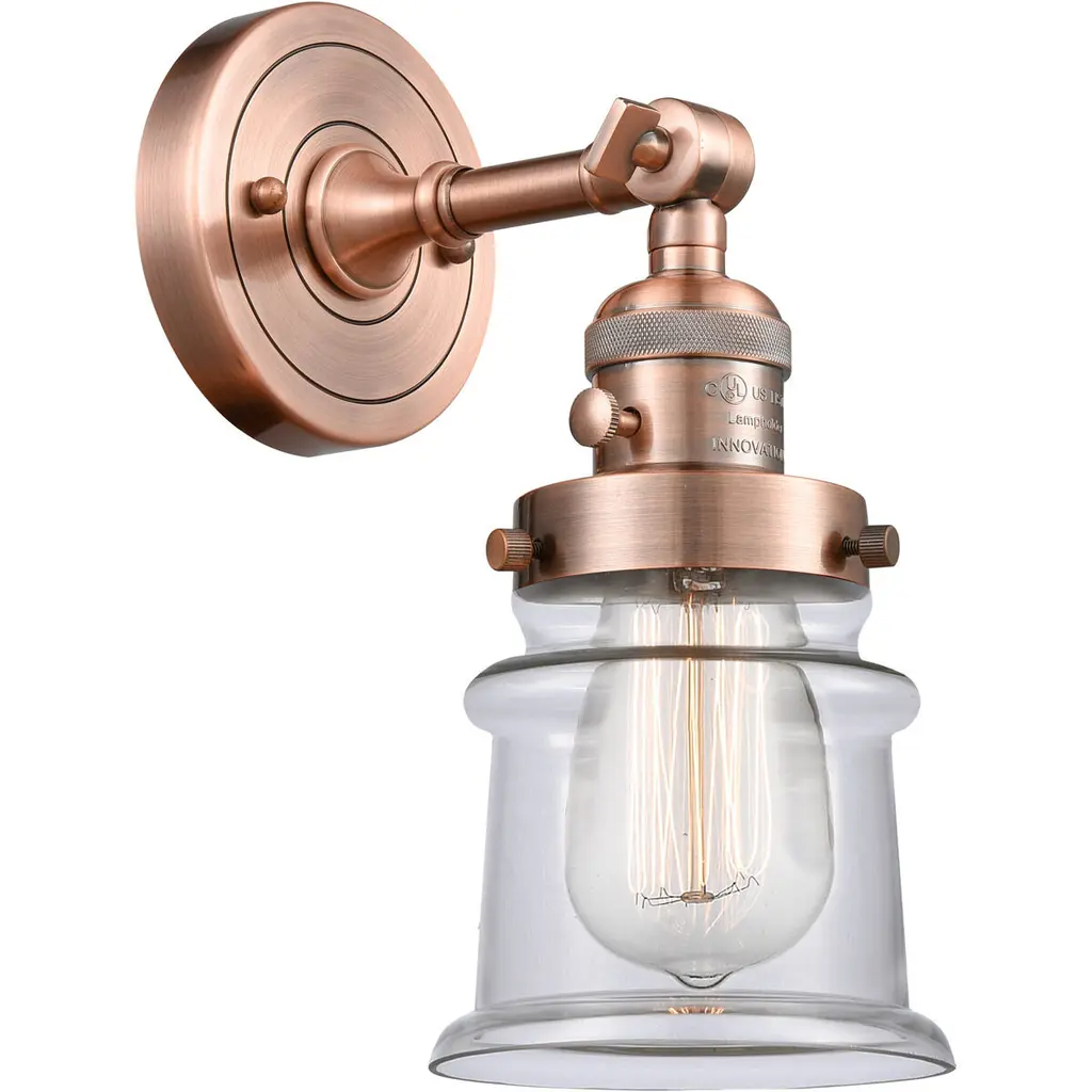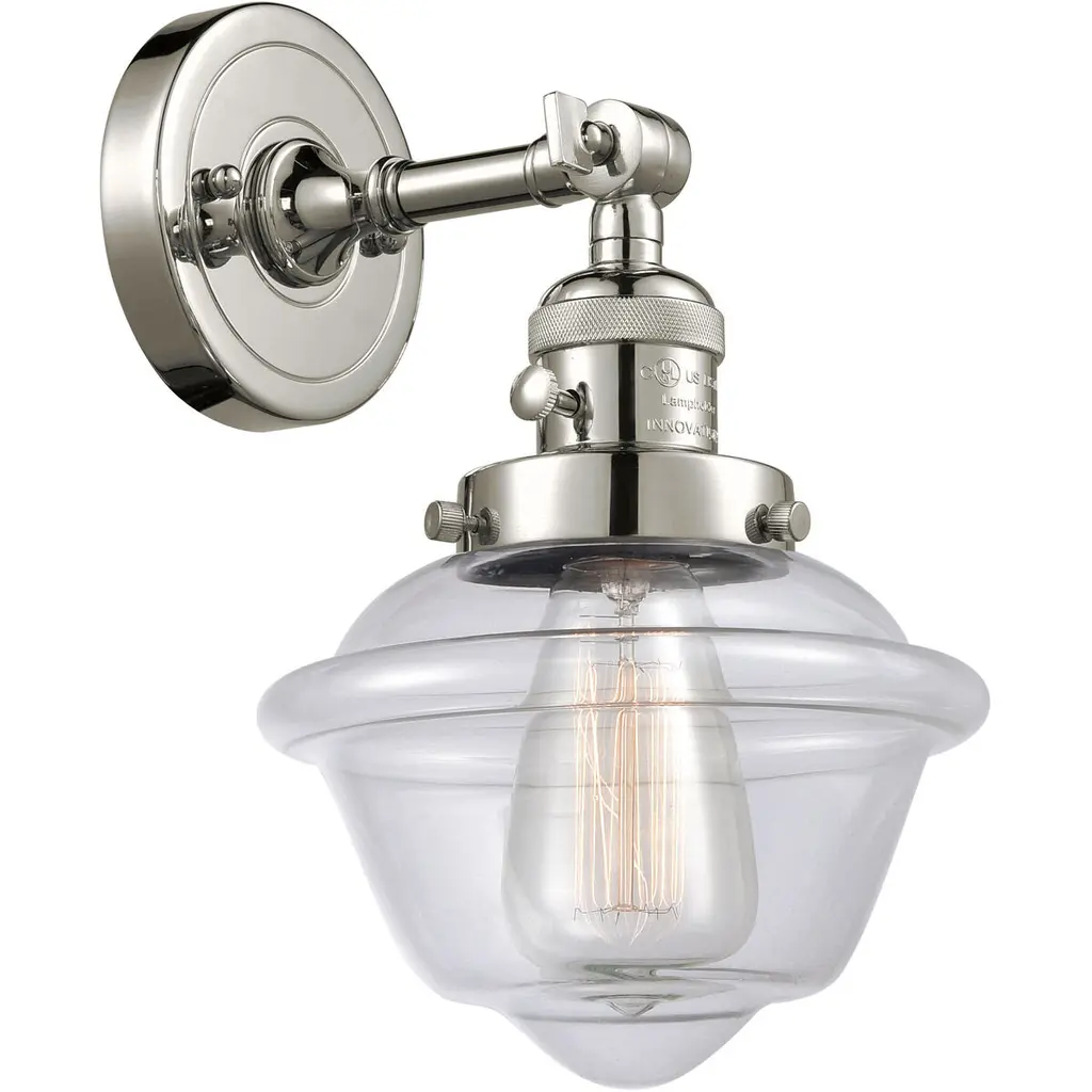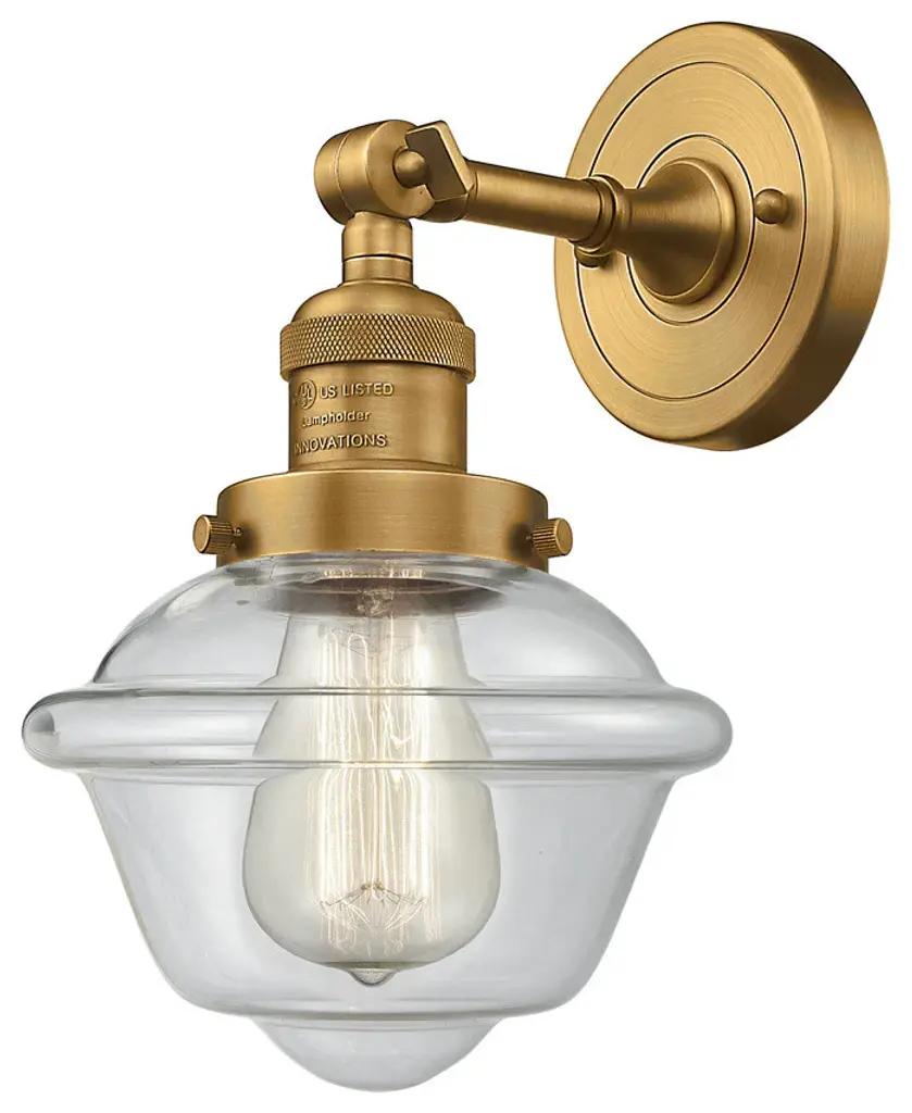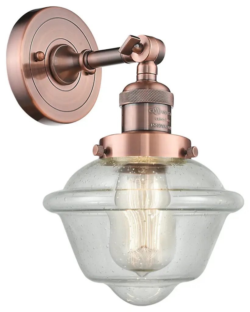 INNOVATIONS LIGHTING 203-AC-G532-LED Small Oxford 1 Light Sconce part of the Franklin Restoration Collection. The Small Oxford 1 Light Sconce is part of the Franklin Restoration Collection.Solid Brass 180 Degree Adjustable Swivel with internal teeth that lock in at 5 degree intervals With Engraved Cast Cup. Collection: Franklin Restoration. Material: Steel, Cast Brass, Glass. Metal Finish(Body): Antique Copper. Metal Finish(Canopy/Backplate): Antique Copper. Dimension(in): 7.5(W) x 12(H) x 9(Ext). Bulb: (1)3.5 Watt LED Vintage Medium Base Bulb Included,Dimmable. Color Temperature: 2700. Color Rendering Index(CRI): 82. Lumens): 350. Voltage: 120. Glass: Clear Small Oxford/Transparent. Shade Shape: Schoolhouse. Shade Material: Glass. Shade Size(in): 7.5 X 5.75. Shade Fitter Measurement: 3.25 inch Fitter. Canopy Dimension(in): 4.5. Backplate Dimension(in): 4.5x0.75. Solid Brass 180 Degree Adjustable Swivel with internal teeth that lock in at 5 degree intervals With Engraved Cast Cup. Fixture can be hung with bulbs facing up or down as a Wall Mount or Facing Down as a Ceiling Mount. UL/CUL Damp Rated. Warranty: 2 Year Finish, Lifetime Electrical.