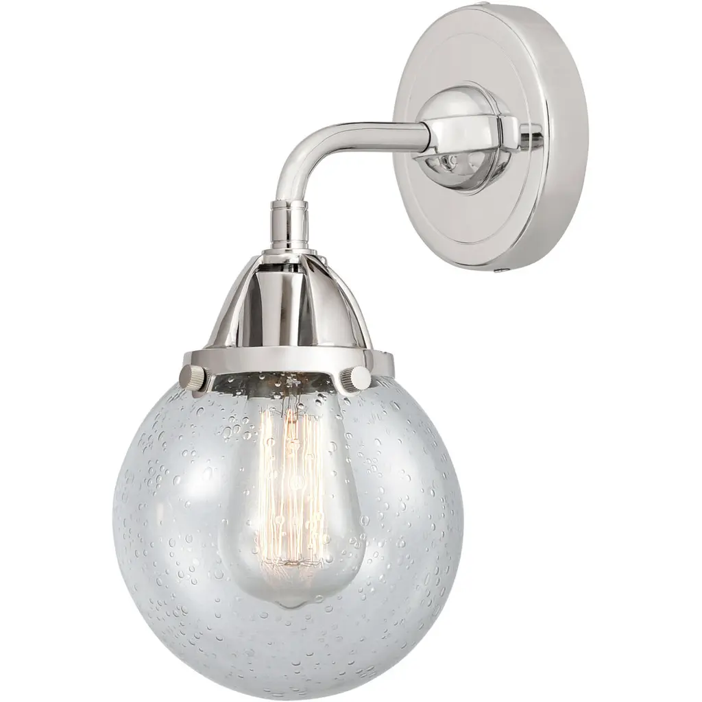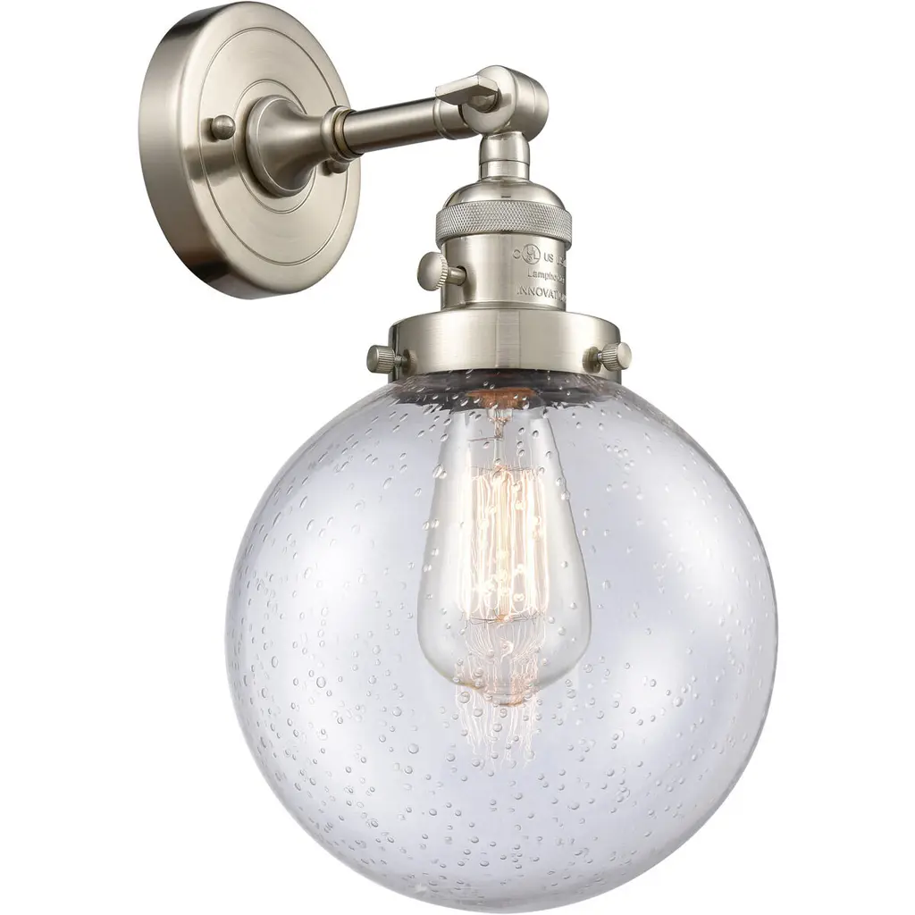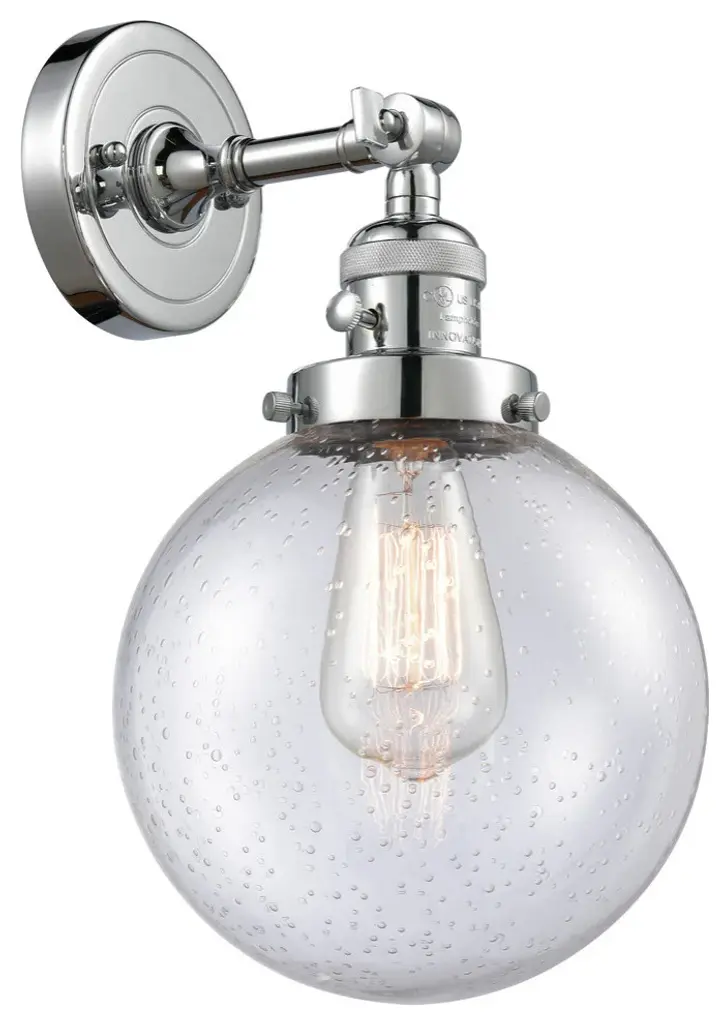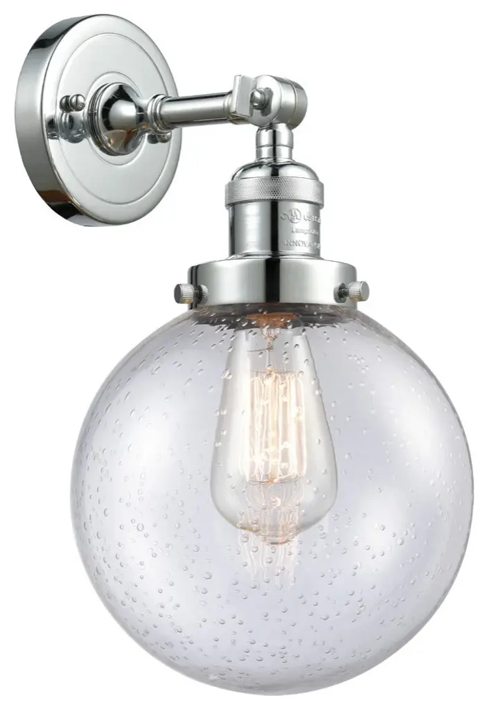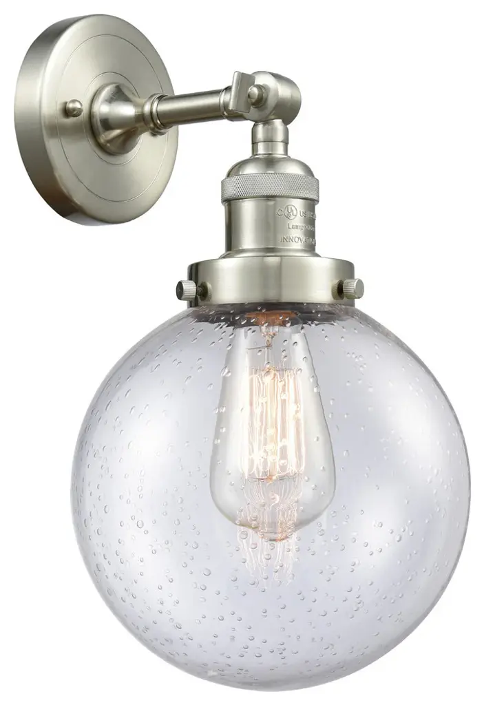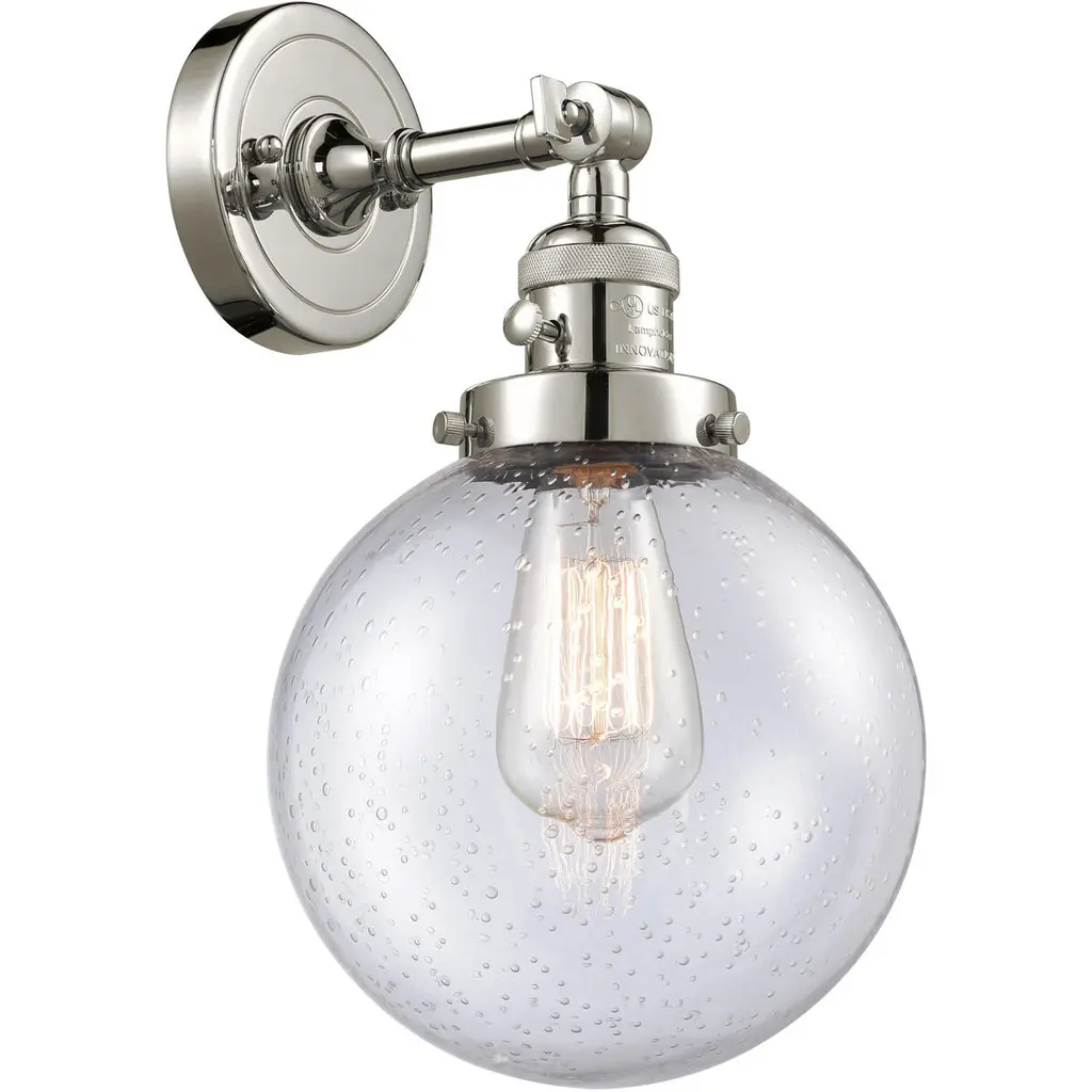 INNOVATIONS LIGHTING 203-PN-G204-8-LED Large Beacon 1 Light Sconce part of the Franklin Restoration Collection. The Large Beacon 1 Light Sconce is part of the Franklin Restoration Collection.Solid Brass 180 Degree Adjustable Swivel with internal teeth that lock in at 5 degree intervals With Engraved Cast Cup. Collection: Franklin Restoration. Material: Steel, Cast Brass, Glass. Metal Finish(Body): Polished Nickel. Metal Finish(Canopy/Backplate): Polished Nickel. Dimension(in): 8(W) x 14(H) x 9.125(Ext). Bulb: (1)3.5 Watt LED Vintage Medium Base Bulb Included,Dimmable. Color Temperature: 2700. Color Rendering Index(CRI): 82. Lumens): 350. Voltage: 120. Glass: Seedy Beacon/Seeded. Shade Shape: Globe. Shade Material: Glass. Shade Size(in): 8 X 7.75. Shade Fitter Measurement: 3.25 inch Fitter. Canopy Dimension(in): 4.5. Backplate Dimension(in): 4.5x0.75. Solid Brass 180 Degree Adjustable Swivel with internal teeth that lock in at 5 degree intervals With Engraved Cast Cup. Fixture can be hung with bulbs facing up or down as a Wall Mount or Facing Down as a Ceiling Mount. UL/CUL Damp Rated. Warranty: 2 Year Finish, Lifetime Electrical.