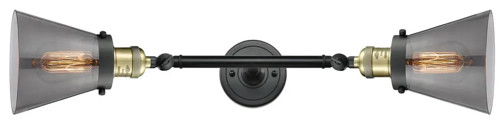 INNOVATIONS LIGHTING 208L-BAB-G44-LED Large Cone 2 Light Bath Vanity Light part of the Franklin Restoration Collection. The Large Cone 2 Light Bath Vanity Light is part of the Franklin Restoration Collection.Solid Brass 180 Degree Adjustable Swivels with internal teeth that lock in at 5 degree intervals. Collection: Franklin Restoration. Material: Steel, Cast Brass, Glass. Metal Finish(Body): Black Antique Brass. Metal Finish(Canopy/Backplate): Black Antique Brass. Dimension(in): 7.75(W) x 23.25(H) x 10(Ext). Bulb: (2)3.5 Watt LED Vintage Medium Base Bulb Included,Dimmable. Color Temperature: 2700. Color Rendering Index(CRI): 82. Lumens): 350. Voltage: 120. Glass: Seedy Large Cone/Seeded. Shade Shape: Cone. Shade Material: Glass. Shade Size(in): 7.75 X 6. Shade Fitter Measurement: 3.25 inch Fitter. Canopy Dimension(in): 4.5. Backplate Dimension(in): 4.5x0.75. Solid Brass 180 Degree Adjustable Swivels with internal teeth that lock in at 5 degree intervals. Fixtures can be hung Horizontally or Vertically. Fixture can be hung with bulbs facing up or down as a Wall Mount. UL/CUL Damp Rated. Warranty: 2 Year Finish, Lifetime Electrical.