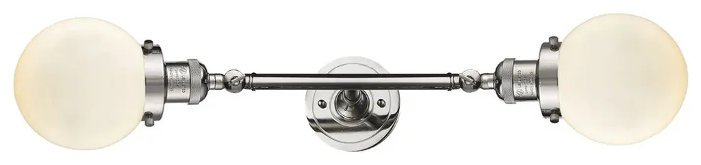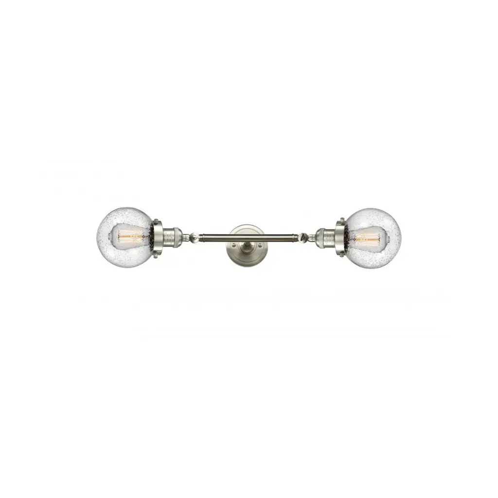 INNOVATIONS LIGHTING 208L-SN-G202-6-LED Beacon 2 Light Bath Vanity Light part of the Franklin Restoration Collection. The Beacon 2 Light Bath Vanity Light is part of the Franklin Restoration Collection.Solid Brass 180 Degree Adjustable Swivels with internal teeth that lock in at 5 degree intervals. Collection: Franklin Restoration. Material: Steel, Cast Brass, Glass. Metal Finish(Body): Brushed Satin Nickel. Metal Finish(Canopy/Backplate): Brushed Satin Nickel. Dimension(in): 6(W) x 23(H) x 8(Ext). Bulb: (2)3.5 Watt LED Vintage Medium Base Bulb Included,Dimmable. Color Temperature: 2700. Color Rendering Index(CRI): 82. Lumens): 350. Voltage: 120. Glass: Clear Beacon/Transparent. Shade Shape: Globe. Shade Material: Glass. Shade Size(in): 6 X 5.75. Shade Fitter Measurement: 3.25 inch Fitter. Canopy Dimension(in): 4.5. Backplate Dimension(in): 4.5x0.75. Solid Brass 180 Degree Adjustable Swivels with internal teeth that lock in at 5 degree intervals. Fixtures can be hung Horizontally or Vertically. Fixture can be hung with bulbs facing up or down as a Wall Mount. UL/CUL Damp Rated. Warranty: 2 Year Finish, Lifetime Electrical.