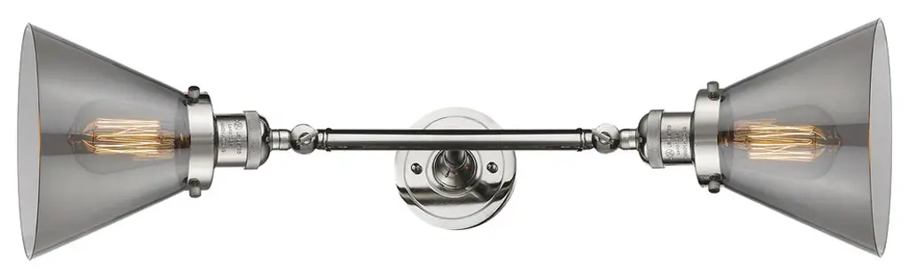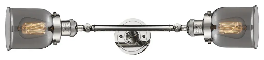 INNOVATIONS LIGHTING 208L-AB-G53-LED Small Bell 2 Light Bath Vanity Light. The Small Bell 2 Light Bath Vanity Light is part of the Franklin Restoration Collection.Solid Brass 180 Degree Adjustable Swivels with internal teeth that lock in at 5 degree intervals. Family Name: Small Bell. Collection Name: Franklin Restoration. Metal Finish(Body): Antique Brass. Metal Finish (Canopy/Backplate): Antique Brass. Material: Steel, Cast Brass, Glass. Dimension(in): 23(H) x 5(W) x 8(Ext). Glass Shade Description: Plated Smoke Small Bell. Glass Type: Colorful. Glass or Metal Shade Shape: Bell. Glass or Metal Shade Color: Plated Smoke. Shade Material: Glass. Shade Size(Diameter x Height): 5 X 5.75. Shade Dimension(in): 5(Dia) x 5.75(H). Canopy Dimensions(in): 4.5. Backplate Dimensions(in): 4.5x0.75. Bulb: (2)3.5W Medium Base LED(Included), Dimmable. Color Temperature: 2700. Lumens: 350. Color Rendering Index(CRI): 82. Life Expectancy(Hours): 15000. Voltage : 120. Warranty: 2 Year Finish, Lifetime Electrical. Solid Brass 180 Degree Adjustable Swivels with internal teeth that lock in at 5 degree intervals. Fixtures can be hung Horizontally or Vertically. Fixture can be hung with bulbs facing up or down as a Wall Mount or Facing Down as a Ceiling Mount. 4.5 inch 2mm Heavy Cast Backplate. Distance from outlet opening to top of fixture 2.25. Rated for 100 Watt Maximum per socket. UL/CUL Damp Rated. In order to maintain the finish we recommend simply using water and a cheesecloth towel. Compatible with Incandescent, LED, Fluoresent and Halogen bulbs.