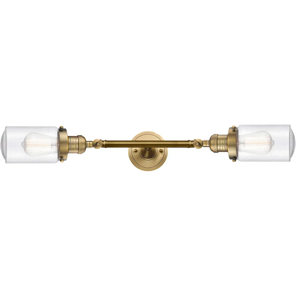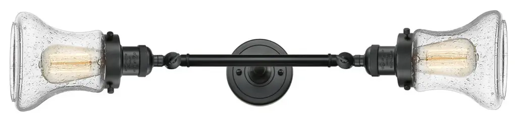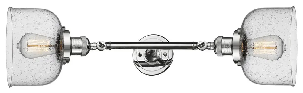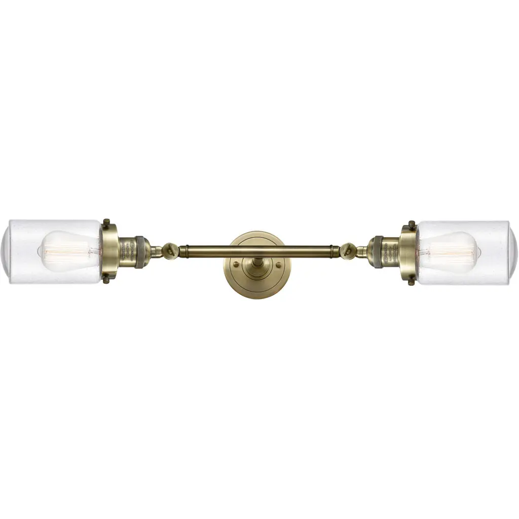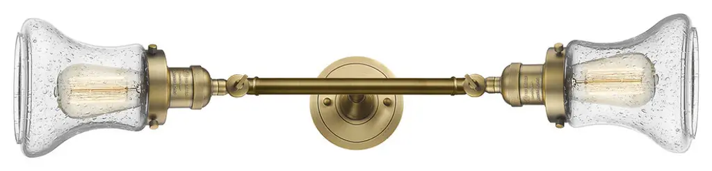INNOVATIONS LIGHTING 208L-AB-G194 Bellmont 2 Light Bath Vanity Light. The Bellmont 2 Light Bath Vanity Light is part of the Franklin Restoration Collection.Solid Brass 180 Degree Adjustable Swivels with internal teeth that lock in at 5 degree intervals. Family Name: Bellmont. Collection Name: Franklin Restoration. Metal Finish(Body): Antique Brass. Metal Finish (Canopy/Backplate): Antique Brass. Material: Steel, Cast Brass, Glass. Dimension(in): 23.75(H) x 6.25(W) x 10(Ext). Glass Shade Description: Seedy Bellmont. Glass Type: Seeded. Glass or Metal Shade Shape: Bell. Glass or Metal Shade Color: Seedy. Shade Material: Glass. Shade Size(Diameter x Height): 6 X 6.25. Shade Dimension(in): 6(Dia) x 6.25(H). Canopy Dimensions(in): 4.5. Backplate Dimensions(in): 4.5x0.75. Bulb: (2)60W Medium Base Incandescent(Not Included), Dimmable. Color Temperature: 2200. Lumens: 220. Color Rendering Index(CRI): 99.9. Life Expectancy(Hours): 2000. Voltage : 120. Warranty: 2 Year Finish, Lifetime Electrical. Solid Brass 180 Degree Adjustable Swivels with internal teeth that lock in at 5 degree intervals. Fixtures can be hung Horizontally or Vertically. Fixture can be hung with bulbs facing up or down as a Wall Mount or Facing Down as a Ceiling Mount. 4.5 inch 2mm Heavy Cast Backplate. Distance from outlet opening to top of fixture 2.25. Rated for 100 Watt Maximum per socket. UL/CUL Damp Rated. In order to maintain the finish we recommend simply using water and a cheesecloth towel. Compatible with Incandescent, LED, Fluoresent and Halogen bulbs.