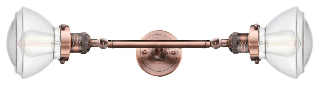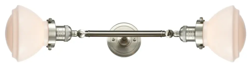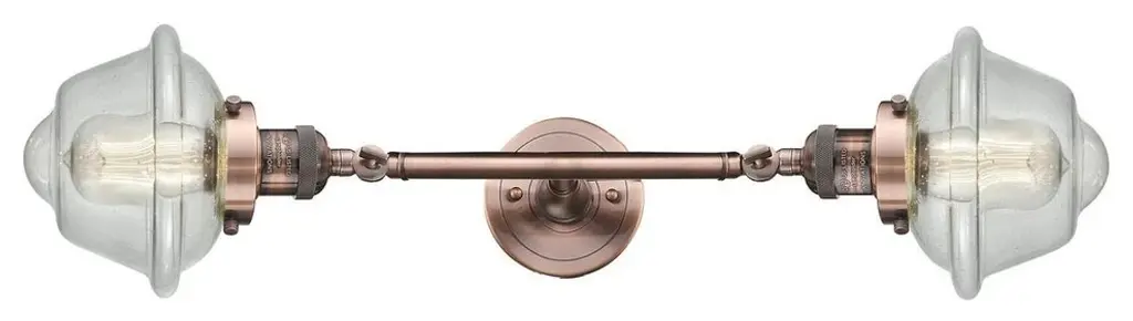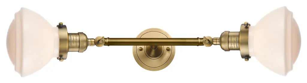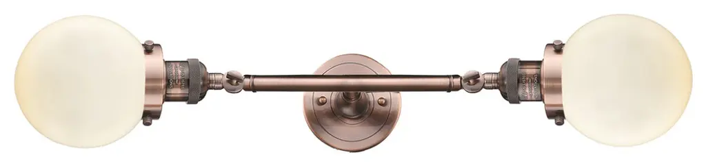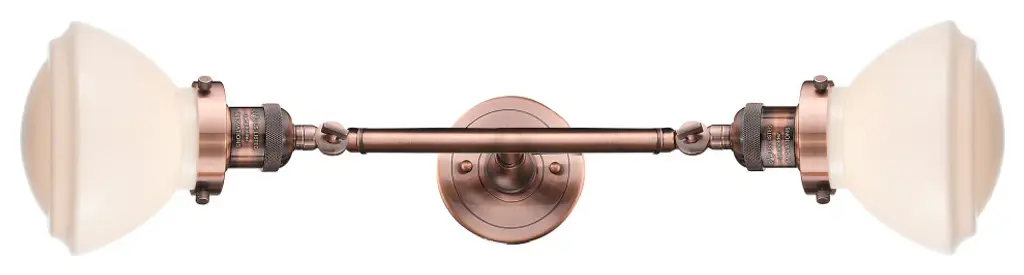 INNOVATIONS LIGHTING 208L-AC-G531 Small Oxford 2 Light Bath Vanity Light part of the Franklin Restoration Collection. The Small Oxford 2 Light Bath Vanity Light is part of the Franklin Restoration Collection.Solid Brass 180 Degree Adjustable Swivels with internal teeth that lock in at 5 degree intervals. Collection: Franklin Restoration. Material: Steel, Cast Brass, Glass. Metal Finish(Body): Antique Copper. Metal Finish(Canopy/Backplate): Antique Copper. Dimension(in): 7.5(W) x 22.25(H) x 9(Ext). Bulb: (2)100 Medium Base Vintage Bulb recommended(Not Included). Voltage: 120. Glass: Matte White Cased Small Oxford/Frosted. Shade Shape: Schoolhouse. Shade Material: Glass. Shade Size(in): 7.5 X 5.75. Shade Fitter Measurement: 3.25 inch Fitter. Canopy Dimension(in): 4.5. Backplate Dimension(in): 4.5x0.75. Solid Brass 180 Degree Adjustable Swivels with internal teeth that lock in at 5 degree intervals. Fixtures can be hung Horizontally or Vertically. Fixture can be hung with bulbs facing up or down as a Wall Mount. UL/CUL Damp Rated. Warranty: 2 Year Finish, Lifetime Electrical.