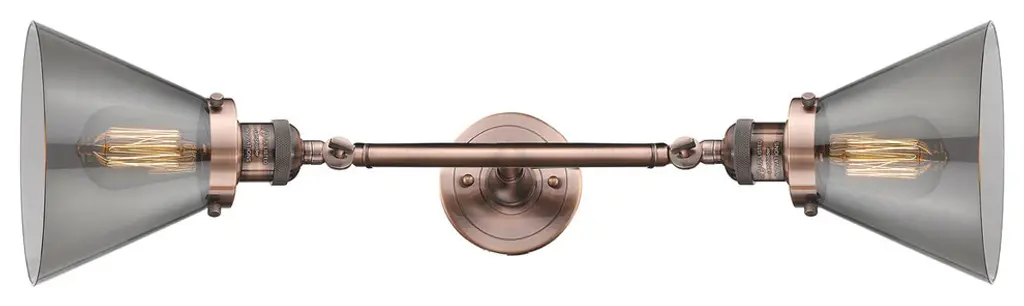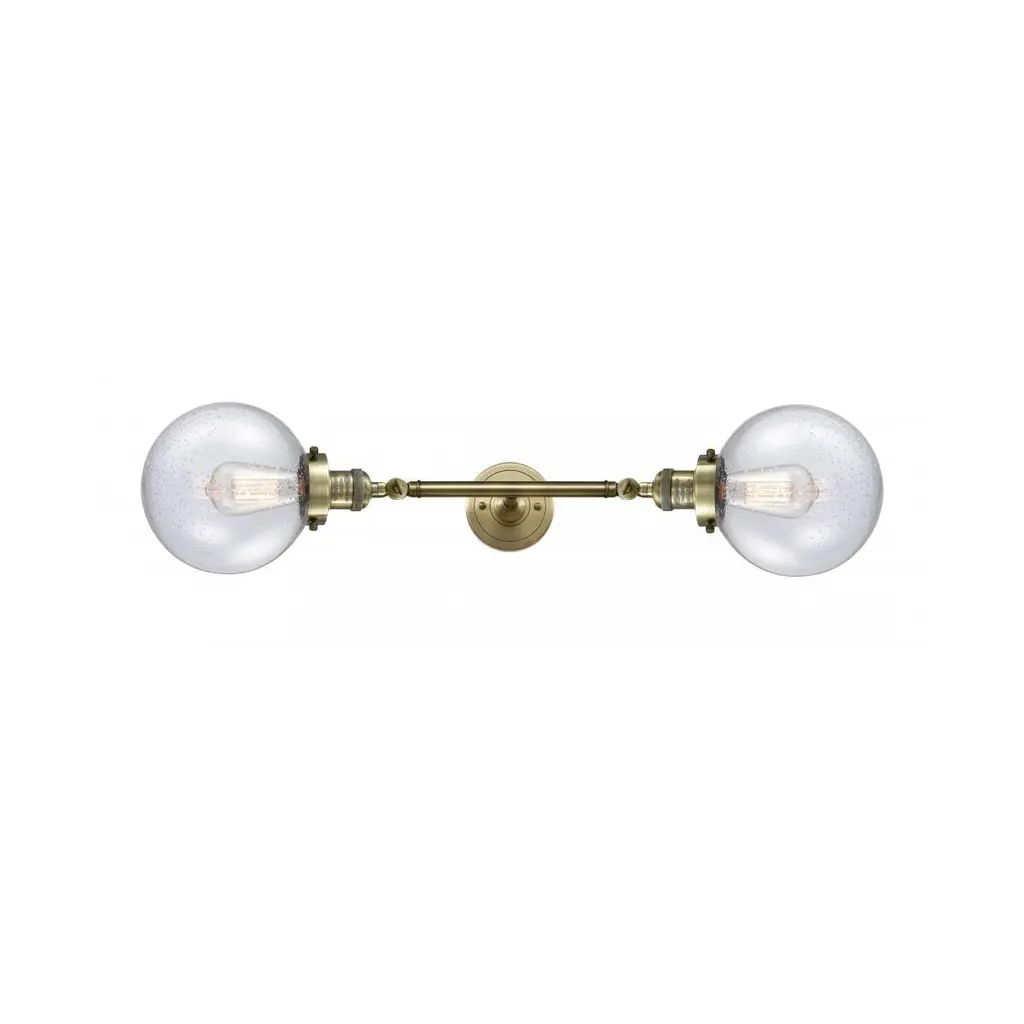 INNOVATIONS LIGHTING 208L-AC-G202-6 Beacon 2 Light Bath Vanity Light part of the Franklin Restoration Collection. The Beacon 2 Light Bath Vanity Light is part of the Franklin Restoration Collection.Solid Brass 180 Degree Adjustable Swivels with internal teeth that lock in at 5 degree intervals. Collection: Franklin Restoration. Material: Steel, Cast Brass, Glass. Metal Finish(Body): Antique Copper. Metal Finish(Canopy/Backplate): Antique Copper. Dimension(in): 6(W) x 23(H) x 8(Ext). Bulb: (2)100 Medium Base Vintage Bulb recommended(Not Included). Voltage: 120. Glass: Clear Beacon/Transparent. Shade Shape: Globe. Shade Material: Glass. Shade Size(in): 6 X 5.75. Shade Fitter Measurement: 3.25 inch Fitter. Canopy Dimension(in): 4.5. Backplate Dimension(in): 4.5x0.75. Solid Brass 180 Degree Adjustable Swivels with internal teeth that lock in at 5 degree intervals. Fixtures can be hung Horizontally or Vertically. Fixture can be hung with bulbs facing up or down as a Wall Mount. UL/CUL Damp Rated. Warranty: 2 Year Finish, Lifetime Electrical.