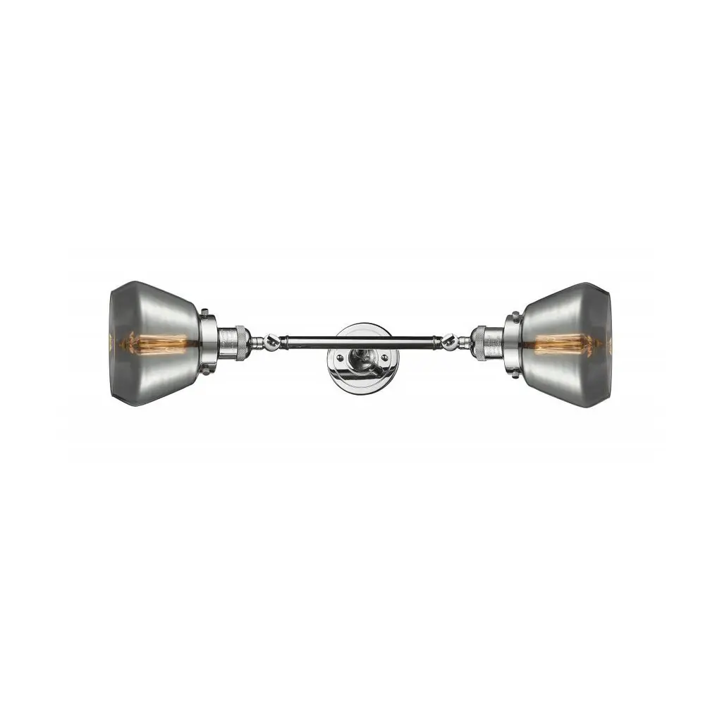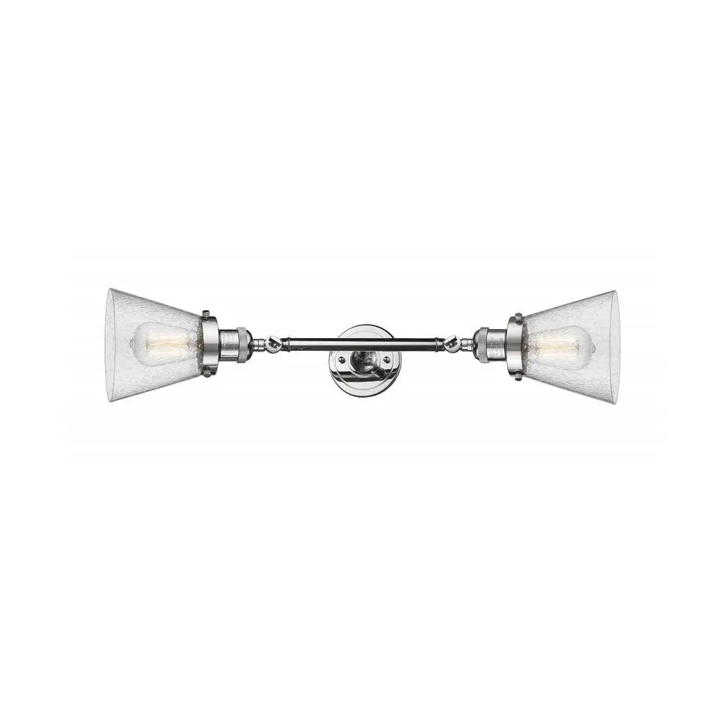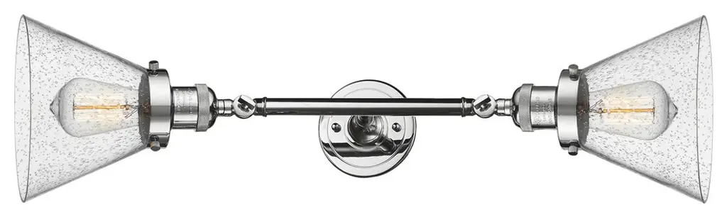 INNOVATIONS LIGHTING 208L-PC-G42 Large Cone 2 Light Bath Vanity Light part of the Franklin Restoration Collection. The Large Cone 2 Light Bath Vanity Light is part of the Franklin Restoration Collection.Solid Brass 180 Degree Adjustable Swivels with internal teeth that lock in at 5 degree intervals. Collection: Franklin Restoration. Material: Steel, Cast Brass, Glass. Metal Finish(Body): Polished Chrome. Metal Finish(Canopy/Backplate): Polished Chrome. Dimension(in): 7.75(W) x 23.25(H) x 10(Ext). Bulb: (2)100 Medium Base Vintage Bulb recommended(Not Included). Voltage: 120. Glass: Clear Large Cone/Transparent. Shade Shape: Cone. Shade Material: Glass. Shade Size(in): 7.75 X 6. Shade Fitter Measurement: 3.25 inch Fitter. Canopy Dimension(in): 4.5. Backplate Dimension(in): 4.5x0.75. Solid Brass 180 Degree Adjustable Swivels with internal teeth that lock in at 5 degree intervals. Fixtures can be hung Horizontally or Vertically. Fixture can be hung with bulbs facing up or down as a Wall Mount. UL/CUL Damp Rated. Warranty: 2 Year Finish, Lifetime Electrical.