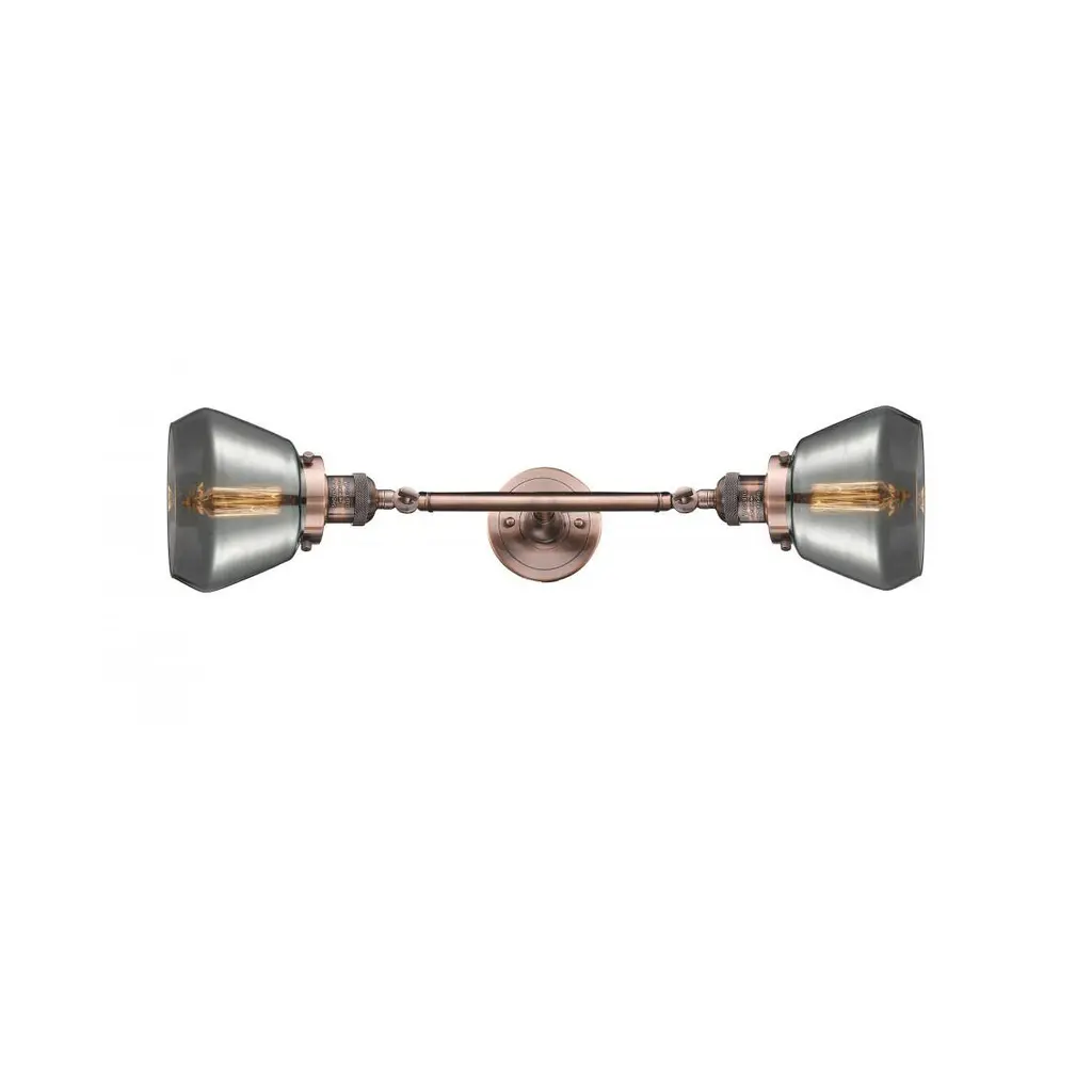 INNOVATIONS LIGHTING 208L-AC-G63-LED Small Cone 2 Light Bath Vanity Light part of the Franklin Restoration Collection. The Small Cone 2 Light Bath Vanity Light is part of the Franklin Restoration Collection.Solid Brass 180 Degree Adjustable Swivels with internal teeth that lock in at 5 degree intervals. Collection: Franklin Restoration. Material: Steel, Cast Brass, Glass. Metal Finish(Body): Antique Copper. Metal Finish(Canopy/Backplate): Antique Copper. Dimension(in): 6.25(W) x 23(H) x 8(Ext). Bulb: (2)3.5 Watt LED Vintage Medium Base Bulb Included,Dimmable. Color Temperature: 2700. Color Rendering Index(CRI): 82. Lumens): 350. Voltage: 120. Glass: Plated Smoke Small Cone/Colorful. Shade Shape: Cone. Shade Material: Glass. Shade Size(in): 6.25 X 5.75. Shade Fitter Measurement: 3.25 inch Fitter. Canopy Dimension(in): 4.5. Backplate Dimension(in): 4.5x0.75. Solid Brass 180 Degree Adjustable Swivels with internal teeth that lock in at 5 degree intervals. Fixtures can be hung Horizontally or Vertically. Fixture can be hung with bulbs facing up or down as a Wall Mount. UL/CUL Damp Rated. Warranty: 2 Year Finish, Lifetime Electrical.