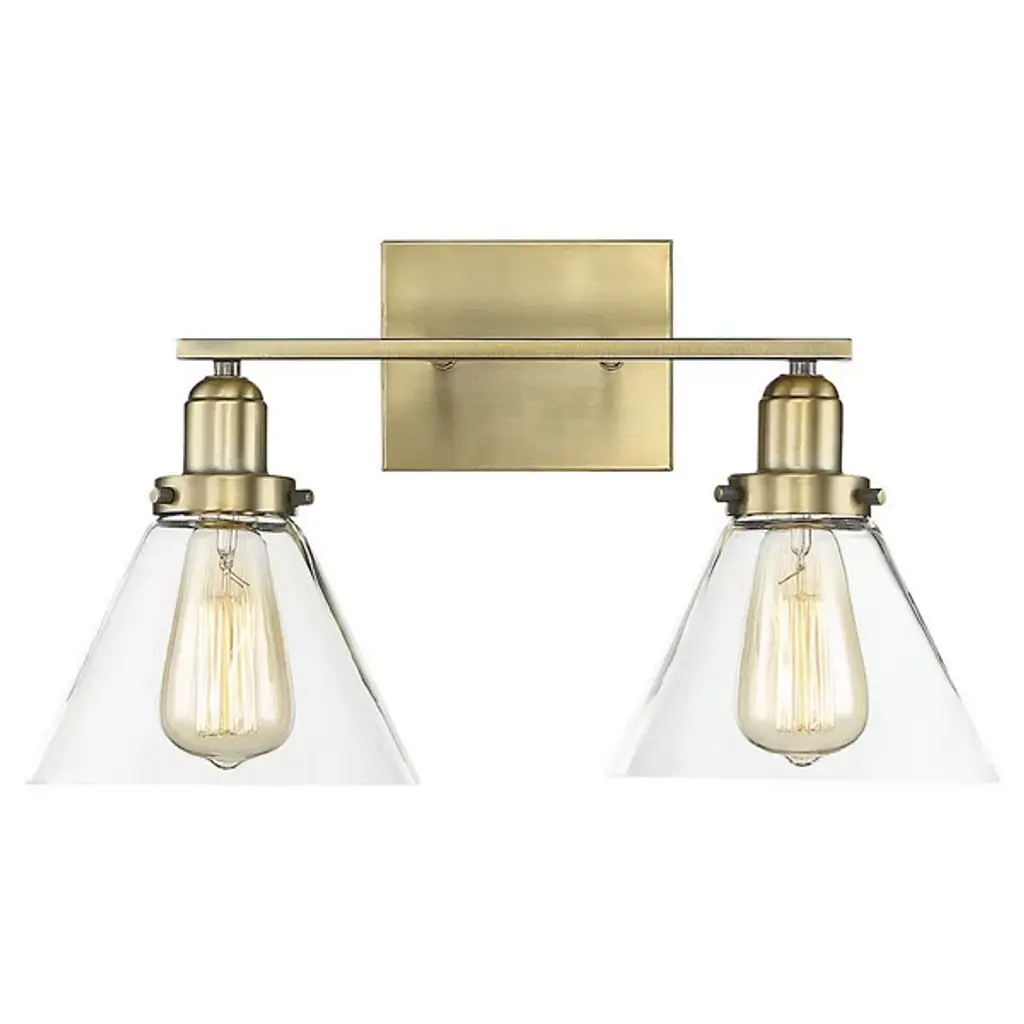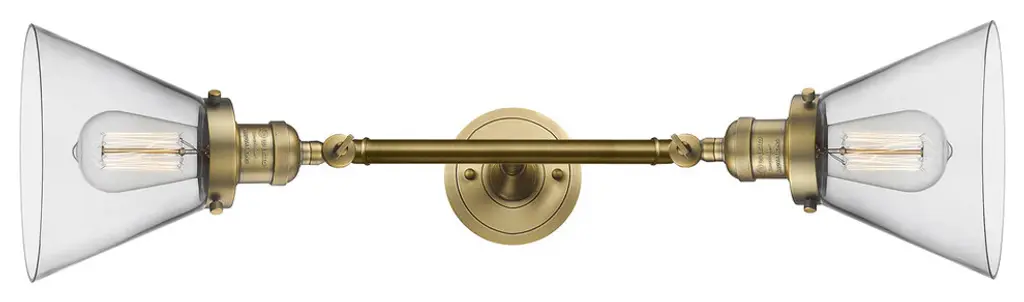 INNOVATIONS LIGHTING 208L-BB-G72 Large Bell 2 Light Bath Vanity Light part of the Franklin Restoration Collection. The Large Bell 2 Light Bath Vanity Light is part of the Franklin Restoration Collection.Solid Brass 180 Degree Adjustable Swivels with internal teeth that lock in at 5 degree intervals. Collection: Franklin Restoration. Material: Steel, Cast Brass, Glass. Metal Finish(Body): Brushed Brass. Metal Finish(Canopy/Backplate): Brushed Brass. Dimension(in): 8(W) x 23(H) x 9.875(Ext). Bulb: (2)100 Medium Base Vintage Bulb recommended(Not Included). Voltage: 120. Glass: Clear Large Bell/Transparent. Shade Shape: Bell. Shade Material: Glass. Shade Size(in): 8 X 5.75. Shade Fitter Measurement: 3.25 inch Fitter. Canopy Dimension(in): 4.5. Backplate Dimension(in): 4.5x0.75. Solid Brass 180 Degree Adjustable Swivels with internal teeth that lock in at 5 degree intervals. Fixtures can be hung Horizontally or Vertically. Fixture can be hung with bulbs facing up or down as a Wall Mount. UL/CUL Damp Rated. Warranty: 2 Year Finish, Lifetime Electrical.