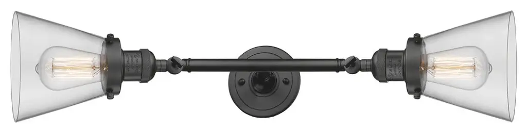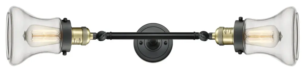 INNOVATIONS LIGHTING 208L-BAB-G52-LED Small Bell 2 Light Bath Vanity Light part of the Franklin Restoration Collection. The Small Bell 2 Light Bath Vanity Light is part of the Franklin Restoration Collection.Solid Brass 180 Degree Adjustable Swivels with internal teeth that lock in at 5 degree intervals. Collection: Franklin Restoration. Material: Steel, Cast Brass, Glass. Metal Finish(Body): Black Antique Brass. Metal Finish(Canopy/Backplate): Black Antique Brass. Dimension(in): 5(W) x 23(H) x 8(Ext). Bulb: (2)3.5 Watt LED Vintage Medium Base Bulb Included,Dimmable. Color Temperature: 2700. Color Rendering Index(CRI): 82. Lumens): 350. Voltage: 120. Glass: Clear Small Bell/Transparent. Shade Shape: Bell. Shade Material: Glass. Shade Size(in): 5 X 5.75. Shade Fitter Measurement: 3.25 inch Fitter. Canopy Dimension(in): 4.5. Backplate Dimension(in): 4.5x0.75. Solid Brass 180 Degree Adjustable Swivels with internal teeth that lock in at 5 degree intervals. Fixtures can be hung Horizontally or Vertically. Fixture can be hung with bulbs facing up or down as a Wall Mount. UL/CUL Damp Rated. Warranty: 2 Year Finish, Lifetime Electrical.