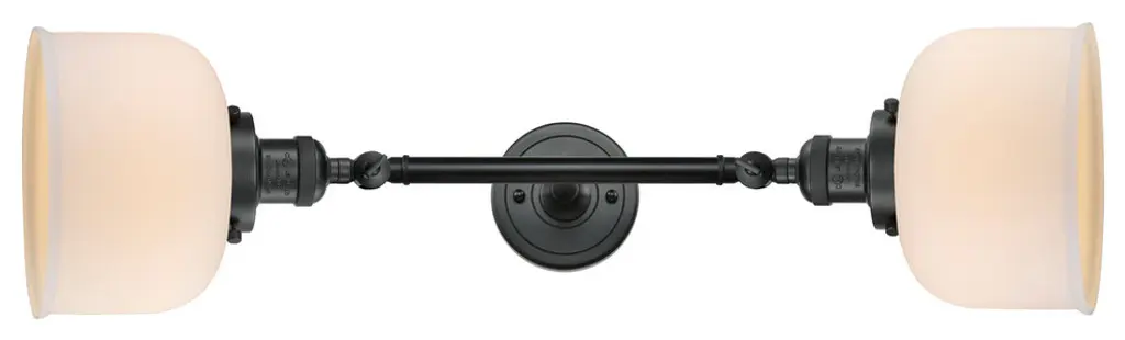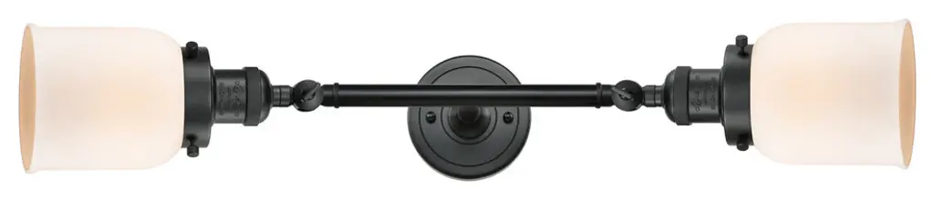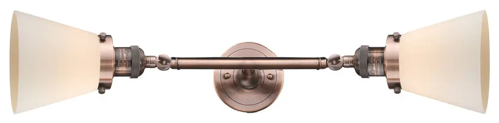 INNOVATIONS LIGHTING 208L-AC-G51 Small Bell 2 Light Bath Vanity Light part of the Franklin Restoration Collection. The Small Bell 2 Light Bath Vanity Light is part of the Franklin Restoration Collection.Solid Brass 180 Degree Adjustable Swivels with internal teeth that lock in at 5 degree intervals. Collection: Franklin Restoration. Material: Steel, Cast Brass, Glass. Metal Finish(Body): Antique Copper. Metal Finish(Canopy/Backplate): Antique Copper. Dimension(in): 5(W) x 23(H) x 8(Ext). Bulb: (2)100 Medium Base Vintage Bulb recommended(Not Included). Voltage: 120. Glass: Matte White Cased Small Bell/Frosted. Shade Shape: Bell. Shade Material: Glass. Shade Size(in): 5 X 5.75. Shade Fitter Measurement: 3.25 inch Fitter. Canopy Dimension(in): 4.5. Backplate Dimension(in): 4.5x0.75. Solid Brass 180 Degree Adjustable Swivels with internal teeth that lock in at 5 degree intervals. Fixtures can be hung Horizontally or Vertically. Fixture can be hung with bulbs facing up or down as a Wall Mount. UL/CUL Damp Rated. Warranty: 2 Year Finish, Lifetime Electrical.