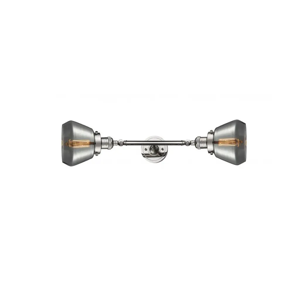 INNOVATIONS LIGHTING 208L-BAB-G173-LED Fulton 2 Light Bath Vanity Light part of the Franklin Restoration Collection. The Fulton 2 Light Bath Vanity Light is part of the Franklin Restoration Collection.Solid Brass 180 Degree Adjustable Swivels with internal teeth that lock in at 5 degree intervals. Collection: Franklin Restoration. Material: Steel, Cast Brass, Glass. Metal Finish(Body): Black Antique Brass. Metal Finish(Canopy/Backplate): Black Antique Brass. Dimension(in): 6.75(W) x 22.5(H) x 10(Ext). Bulb: (2)3.5 Watt LED Vintage Medium Base Bulb Included,Dimmable. Color Temperature: 2700. Color Rendering Index(CRI): 82. Lumens): 350. Voltage: 120. Glass: Plated Smoke Fulton/Colorful. Shade Shape: Cone. Shade Material: Glass. Shade Size(in): 6.75 X 5.25. Shade Fitter Measurement: 3.25 inch Fitter. Canopy Dimension(in): 4.5. Backplate Dimension(in): 4.5x0.75. Solid Brass 180 Degree Adjustable Swivels with internal teeth that lock in at 5 degree intervals. Fixtures can be hung Horizontally or Vertically. Fixture can be hung with bulbs facing up or down as a Wall Mount. UL/CUL Damp Rated. Warranty: 2 Year Finish, Lifetime Electrical.