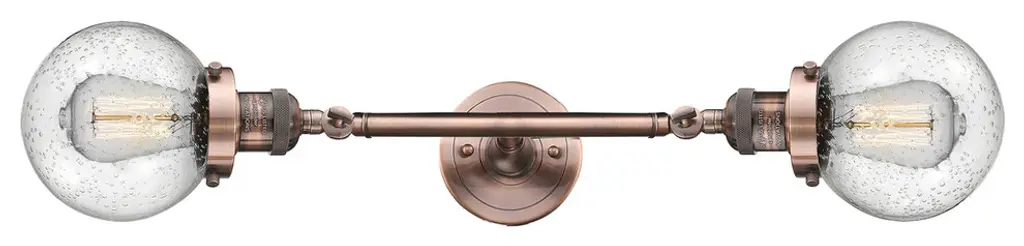 INNOVATIONS LIGHTING 208L-AB-G204-6 Beacon 2 Light Bath Vanity Light. The Beacon 2 Light Bath Vanity Light is part of the Franklin Restoration Collection.Solid Brass 180 Degree Adjustable Swivels with internal teeth that lock in at 5 degree intervals. Family Name: Beacon. Collection Name: Franklin Restoration. Metal Finish(Body): Antique Brass. Metal Finish (Canopy/Backplate): Antique Brass. Material: Steel, Cast Brass, Glass. Dimension(in): 23(H) x 6(W) x 8(Ext). Glass Shade Description: Seedy Beacon. Glass Type: Seeded. Glass or Metal Shade Shape: Globe. Glass or Metal Shade Color: Seedy. Shade Material: Glass. Shade Size(Diameter x Height): 6 X 5.75. Shade Dimension(in): 6(Dia) x 5.75(H). Canopy Dimensions(in): 4.5. Backplate Dimensions(in): 4.5x0.75. Bulb: (2)60W Medium Base Incandescent(Not Included), Dimmable. Color Temperature: 2200. Lumens: 220. Color Rendering Index(CRI): 99.9. Life Expectancy(Hours): 2000. Voltage : 120. Warranty: 2 Year Finish, Lifetime Electrical. Solid Brass 180 Degree Adjustable Swivels with internal teeth that lock in at 5 degree intervals. Fixtures can be hung Horizontally or Vertically. Fixture can be hung with bulbs facing up or down as a Wall Mount or Facing Down as a Ceiling Mount. 4.5 inch 2mm Heavy Cast Backplate. Distance from outlet opening to top of fixture 2.25. Rated for 100 Watt Maximum per socket. UL/CUL Damp Rated. In order to maintain the finish we recommend simply using water and a cheesecloth towel. Compatible with Incandescent, LED, Fluoresent and Halogen bulbs.