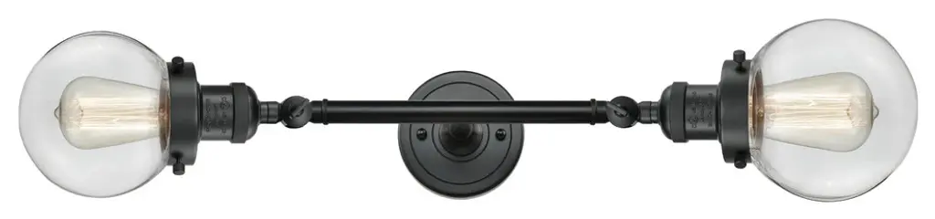 INNOVATIONS LIGHTING 208L-BK-G72-LED Large Bell 2 Light Bath Vanity Light part of the Franklin Restoration Collection. The Large Bell 2 Light Bath Vanity Light is part of the Franklin Restoration Collection.Solid Brass 180 Degree Adjustable Swivels with internal teeth that lock in at 5 degree intervals. Collection: Franklin Restoration. Material: Steel, Cast Brass, Glass. Metal Finish(Body): Matte Black. Metal Finish(Canopy/Backplate): Matte Black. Dimension(in): 8(W) x 23(H) x 9.875(Ext). Bulb: (2)3.5 Watt LED Vintage Medium Base Bulb Included,Dimmable. Color Temperature: 2700. Color Rendering Index(CRI): 82. Lumens): 350. Voltage: 120. Glass: Clear Large Bell/Transparent. Shade Shape: Bell. Shade Material: Glass. Shade Size(in): 8 X 5.75. Shade Fitter Measurement: 3.25 inch Fitter. Canopy Dimension(in): 4.5. Backplate Dimension(in): 4.5x0.75. Solid Brass 180 Degree Adjustable Swivels with internal teeth that lock in at 5 degree intervals. Fixtures can be hung Horizontally or Vertically. Fixture can be hung with bulbs facing up or down as a Wall Mount. UL/CUL Damp Rated. Warranty: 2 Year Finish, Lifetime Electrical.