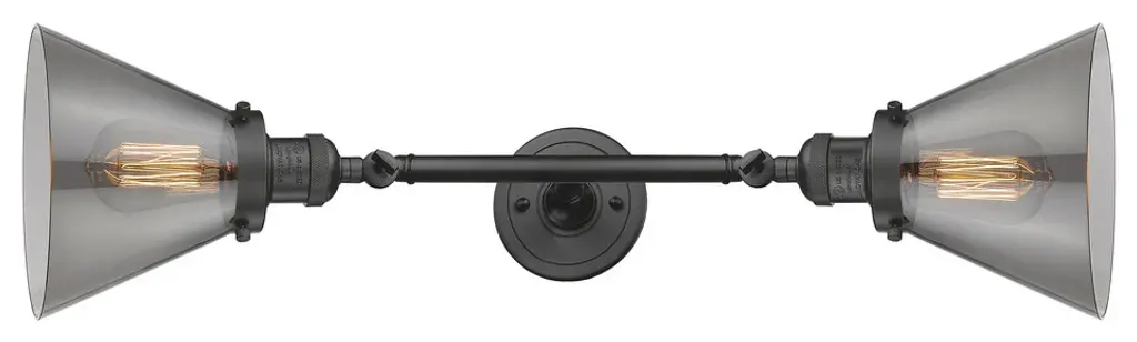 INNOVATIONS LIGHTING 208L-BK-G43-LED Large Cone 2 Light Bath Vanity Light part of the Franklin Restoration Collection. The Large Cone 2 Light Bath Vanity Light is part of the Franklin Restoration Collection.Solid Brass 180 Degree Adjustable Swivels with internal teeth that lock in at 5 degree intervals. Collection: Franklin Restoration. Material: Steel, Cast Brass, Glass. Metal Finish(Body): Matte Black. Metal Finish(Canopy/Backplate): Matte Black. Dimension(in): 7.75(W) x 23.25(H) x 10(Ext). Bulb: (2)3.5 Watt LED Vintage Medium Base Bulb Included,Dimmable. Color Temperature: 2700. Color Rendering Index(CRI): 82. Lumens): 350. Voltage: 120. Glass: Plated Smoke Large Cone/Colorful. Shade Shape: Cone. Shade Material: Glass. Shade Size(in): 7.75 X 6. Shade Fitter Measurement: 3.25 inch Fitter. Canopy Dimension(in): 4.5. Backplate Dimension(in): 4.5x0.75. Solid Brass 180 Degree Adjustable Swivels with internal teeth that lock in at 5 degree intervals. Fixtures can be hung Horizontally or Vertically. Fixture can be hung with bulbs facing up or down as a Wall Mount. UL/CUL Damp Rated. Warranty: 2 Year Finish, Lifetime Electrical.