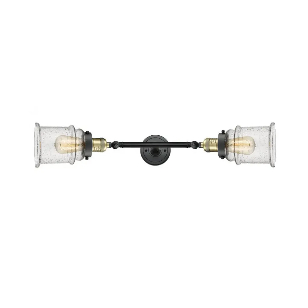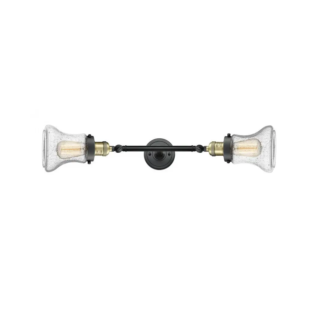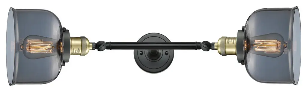 INNOVATIONS LIGHTING 208L-BAB-G74 Large Bell 2 Light Bath Vanity Light part of the Franklin Restoration Collection. The Large Bell 2 Light Bath Vanity Light is part of the Franklin Restoration Collection.Solid Brass 180 Degree Adjustable Swivels with internal teeth that lock in at 5 degree intervals. Collection: Franklin Restoration. Material: Steel, Cast Brass, Glass. Metal Finish(Body): Black Antique Brass. Metal Finish(Canopy/Backplate): Black Antique Brass. Dimension(in): 8(W) x 23(H) x 9.875(Ext). Bulb: (2)100 Medium Base Vintage Bulb recommended(Not Included). Voltage: 120. Glass: Seedy Large Bell/Seeded. Shade Shape: Bell. Shade Material: Glass. Shade Size(in): 8 X 5.75. Shade Fitter Measurement: 3.25 inch Fitter. Canopy Dimension(in): 4.5. Backplate Dimension(in): 4.5x0.75. Solid Brass 180 Degree Adjustable Swivels with internal teeth that lock in at 5 degree intervals. Fixtures can be hung Horizontally or Vertically. Fixture can be hung with bulbs facing up or down as a Wall Mount. UL/CUL Damp Rated. Warranty: 2 Year Finish, Lifetime Electrical.