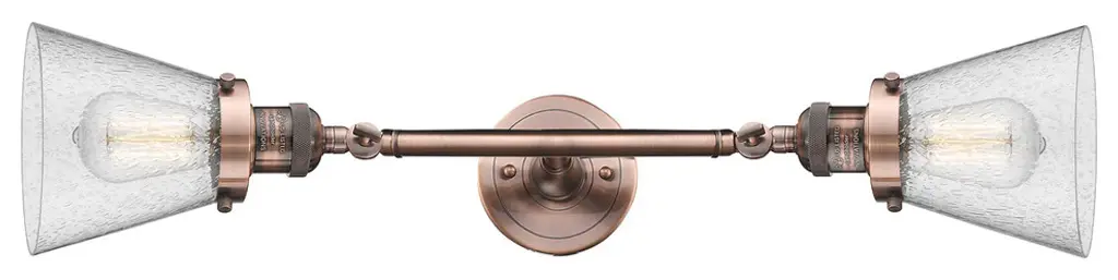 INNOVATIONS LIGHTING 208L-AC-G41 Large Cone 2 Light Bath Vanity Light part of the Franklin Restoration Collection. The Large Cone 2 Light Bath Vanity Light is part of the Franklin Restoration Collection.Solid Brass 180 Degree Adjustable Swivels with internal teeth that lock in at 5 degree intervals. Collection: Franklin Restoration. Material: Steel, Cast Brass, Glass. Metal Finish(Body): Antique Copper. Metal Finish(Canopy/Backplate): Antique Copper. Dimension(in): 7.75(W) x 23.25(H) x 10(Ext). Bulb: (2)100 Medium Base Vintage Bulb recommended(Not Included). Voltage: 120. Glass: Matte White Cased Large Cone/Frosted. Shade Shape: Cone. Shade Material: Glass. Shade Size(in): 7.75 X 6. Shade Fitter Measurement: 3.25 inch Fitter. Canopy Dimension(in): 4.5. Backplate Dimension(in): 4.5x0.75. Solid Brass 180 Degree Adjustable Swivels with internal teeth that lock in at 5 degree intervals. Fixtures can be hung Horizontally or Vertically. Fixture can be hung with bulbs facing up or down as a Wall Mount. UL/CUL Damp Rated. Warranty: 2 Year Finish, Lifetime Electrical.