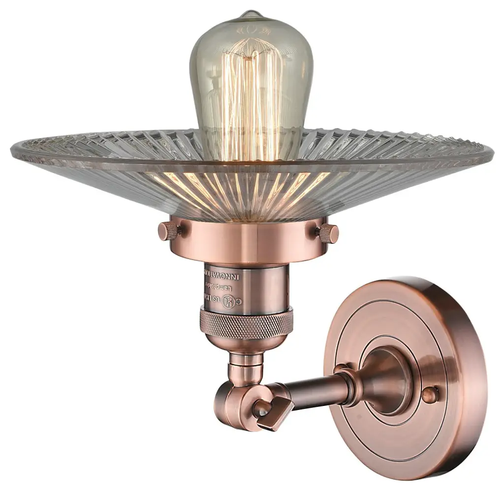 INNOVATIONS LIGHTING 203-AC-G2 Halophane 1 Light Sconce part of the Franklin Restoration Collection. The Halophane 1 Light Sconce is part of the Franklin Restoration Collection.Solid Brass 180 Degree Adjustable Swivel with internal teeth that lock in at 5 degree intervals With Engraved Cast Cup. Collection: Franklin Restoration. Material: Steel, Cast Brass, Glass. Metal Finish(Body): Antique Copper. Metal Finish(Canopy/Backplate): Antique Copper. Dimension(in): 8.5(W) x 8(H) x 11(Ext). Bulb: (1)100 Medium Base Vintage Bulb recommended(Not Included). Voltage: 120. Glass: Clear Halophane/Transparent. Shade Shape: Cone. Shade Material: Glass. Shade Size(in): 9 X 2. Shade Fitter Measurement: 3.25 inch Fitter. Canopy Dimension(in): 4.5. Backplate Dimension(in): 4.5x0.75. Solid Brass 180 Degree Adjustable Swivel with internal teeth that lock in at 5 degree intervals With Engraved Cast Cup. Fixture can be hung with bulbs facing up or down as a Wall Mount or Facing Down as a Ceiling Mount. UL/CUL Damp Rated. Warranty: 2 Year Finish, Lifetime Electrical.