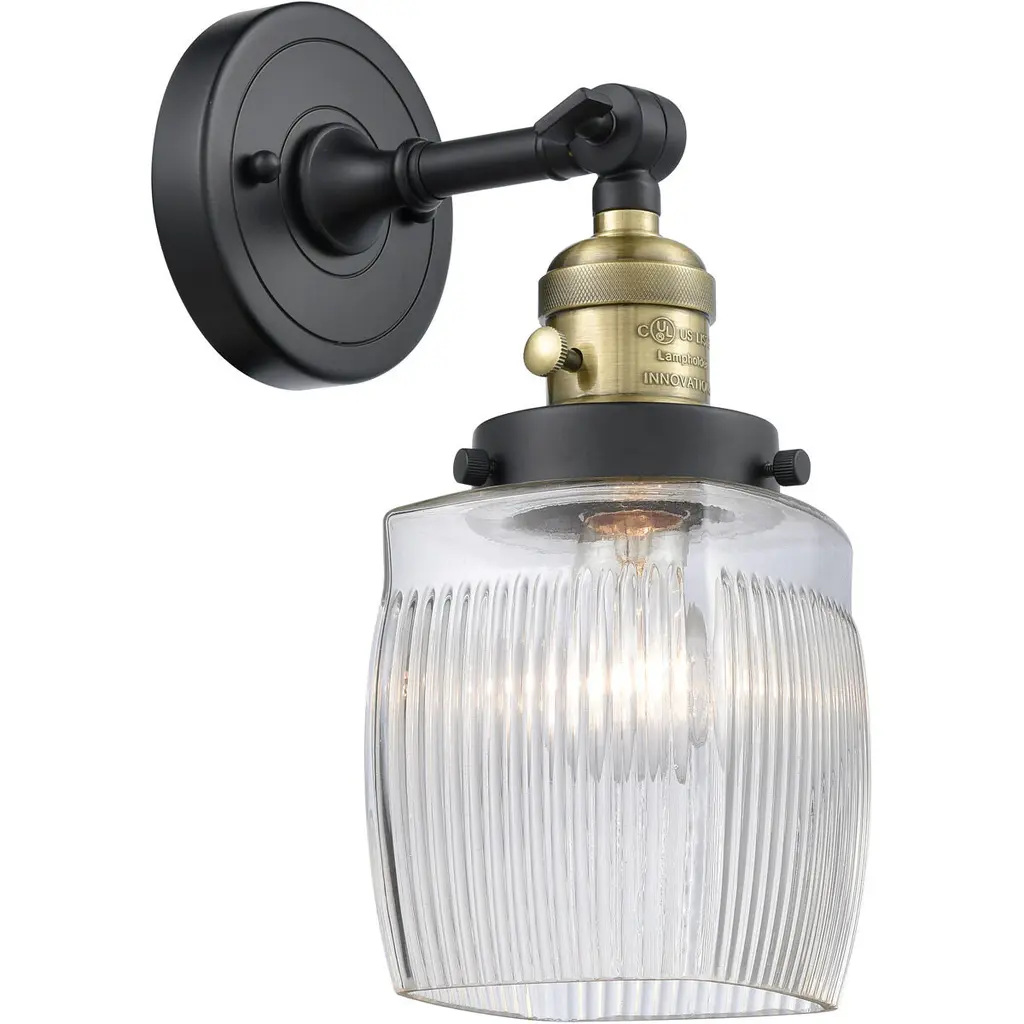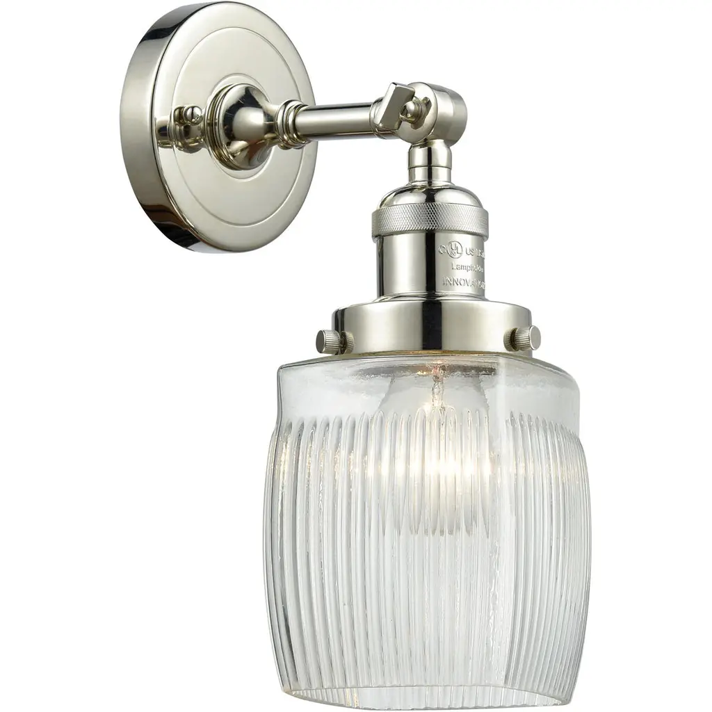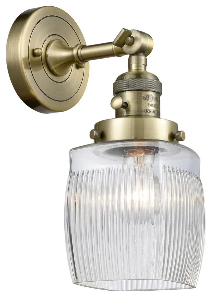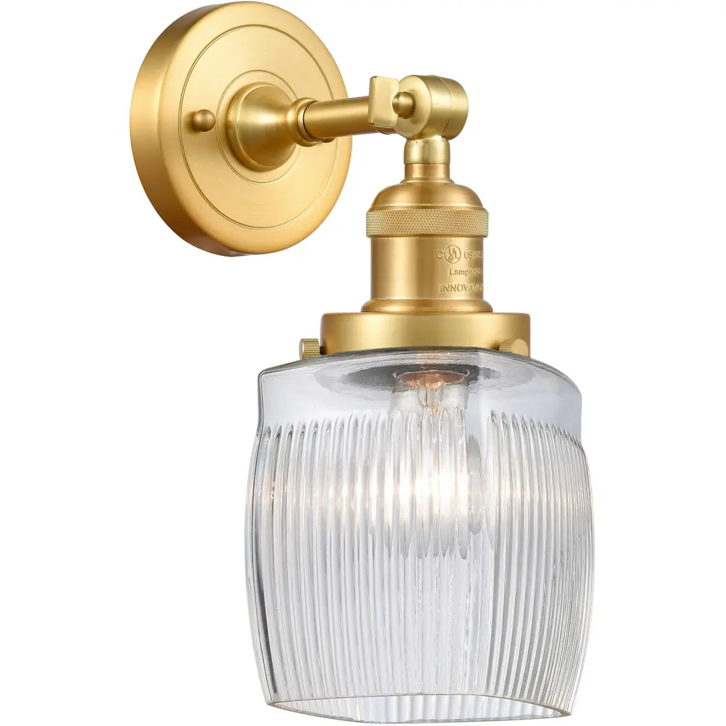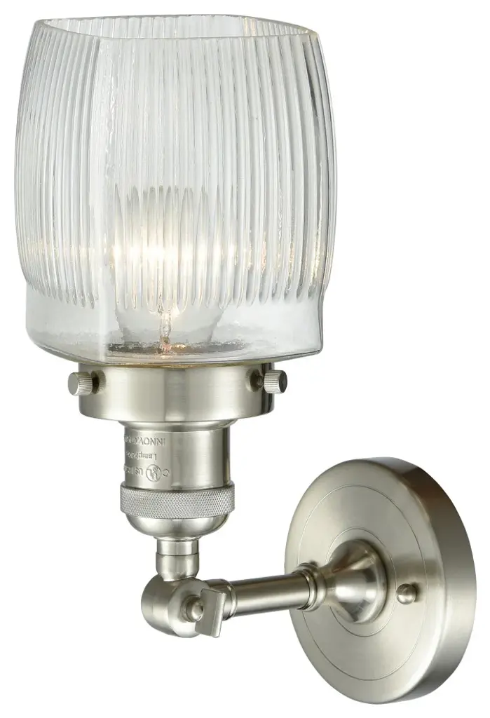 INNOVATIONS LIGHTING 203-SN-G302 Colton 1 Light Sconce part of the Franklin Restoration Collection. The Colton 1 Light Sconce is part of the Franklin Restoration Collection.Solid Brass 180 Degree Adjustable Swivel with internal teeth that lock in at 5 degree intervals With Engraved Cast Cup. Collection: Franklin Restoration. Material: Steel, Cast Brass, Glass. Metal Finish(Body): Brushed Satin Nickel. Metal Finish(Canopy/Backplate): Brushed Satin Nickel. Dimension(in): 5.5(W) x 11(H) x 7(Ext). Bulb: (1)100 Medium Base Vintage Bulb recommended(Not Included). Voltage: 120. Glass: Thick Clear Halophane Colton/Transparent; Ribbed. Shade Shape: Cube. Shade Material: Glass. Shade Size(in): 5.5 X 6. Shade Fitter Measurement: 3.25 inch Fitter. Canopy Dimension(in): 4.5. Backplate Dimension(in): 4.5x0.75. Solid Brass 180 Degree Adjustable Swivel with internal teeth that lock in at 5 degree intervals With Engraved Cast Cup. Fixture can be hung with bulbs facing up or down as a Wall Mount or Facing Down as a Ceiling Mount. UL/CUL Damp Rated. Warranty: 2 Year Finish, Lifetime Electrical.