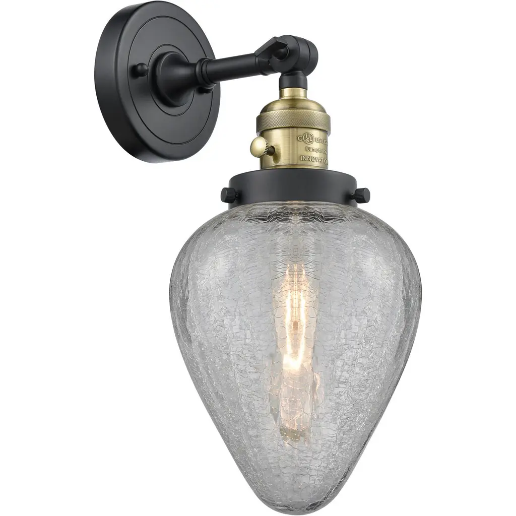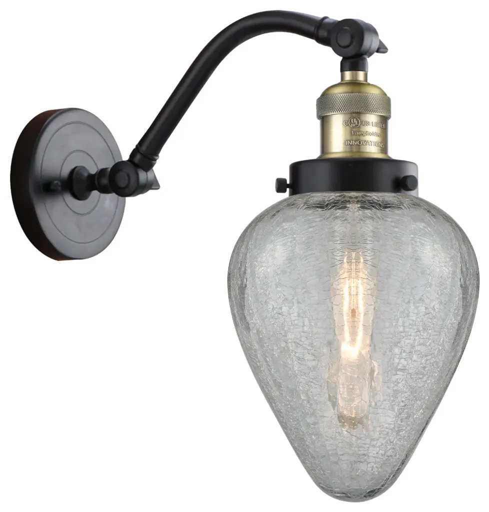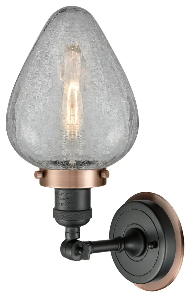 INNOVATIONS LIGHTING 203BK-BPAC-HRAC-G165 Geneseo 1 Light Mixed Metals Sconce part of the Franklin Restoration Collection. Style: Industrial, Restoration-Vintage. Collection: Franklin Restoration. Material: Steel, Cast Brass, Glass. Metal Finish(Body): Matte Black. Metal Finish(Canopy/Backplate): Matte Black. Accent Color: Antique Copper Fitter. Dimension(in): 14(H) x 6.5(W) x 9(Ext). Bulb: (1)60W Medium Base Vintage Bulb recommended(Not Included). Voltage: 120. Dimmable: Yes. Color Temperature: 2200. CRI: 99.9. Lumens: 220. Maximum Wattage Per Socket: 100. Glass Shade Description: Clear Crackle Geneseo. Shade Material: Glass. Glass or Metal Shade Color: Clear Crackled. Glass Type: Crackled. Shade Size Dimension(in): 6.5(Dia) x 8.75(H). Shade Fitter Measurement: 3.25 inch Fitter. Backplate Dimenison(in): 5.5(Dia) x 1(Depth). ADA Compliant: No. UL & ETL Certification: Damp Location.