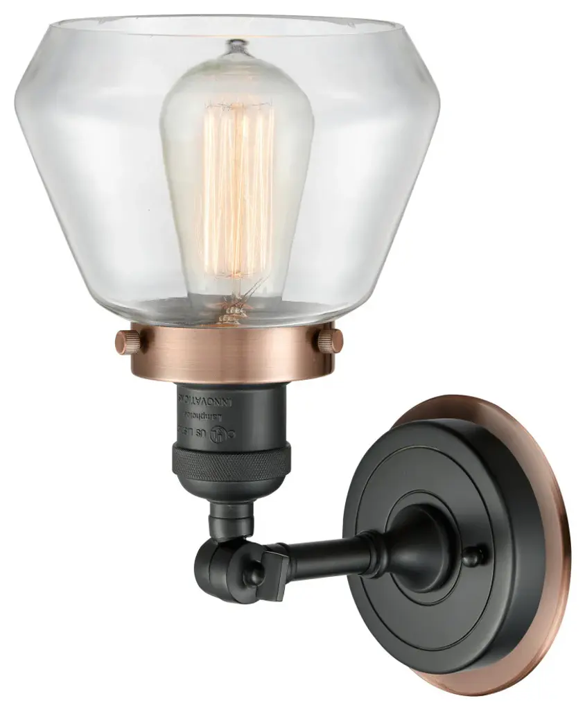 INNOVATIONS LIGHTING 203BK-BPAC-HRAC-G172 Fulton 1 Light Mixed Metals Sconce part of the Franklin Restoration Collection. Style: Industrial, Farmhouse, Modern Contempo, Restoration-Vintage. Collection: Franklin Restoration. Material: Steel, Cast Brass, Glass. Metal Finish(Body): Matte Black. Metal Finish(Canopy/Backplate): Matte Black. Accent Color: Antique Copper Fitter. Dimension(in): 11(H) x 7(W) x 9(Ext). Bulb: (1)60W Medium Base Vintage Bulb recommended(Not Included). Voltage: 120. Dimmable: Yes. Color Temperature: 2200. CRI: 99.9. Lumens: 220. Maximum Wattage Per Socket: 100. Glass Shade Description: Clear Fulton. Shade Material: Glass. Glass or Metal Shade Color: Clear. Glass Type: Transparent . Shade Size Dimension(in): 6.75(Dia) x 5.25(H). Shade Fitter Measurement: 3.25 inch Fitter. Backplate Dimenison(in): 5.5(Dia) x 1(Depth). ADA Compliant: No. UL & ETL Certification: Damp Location.