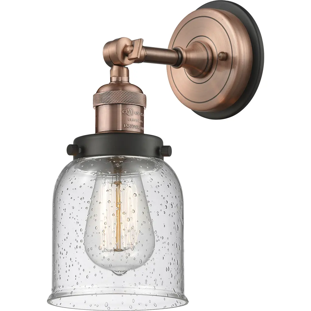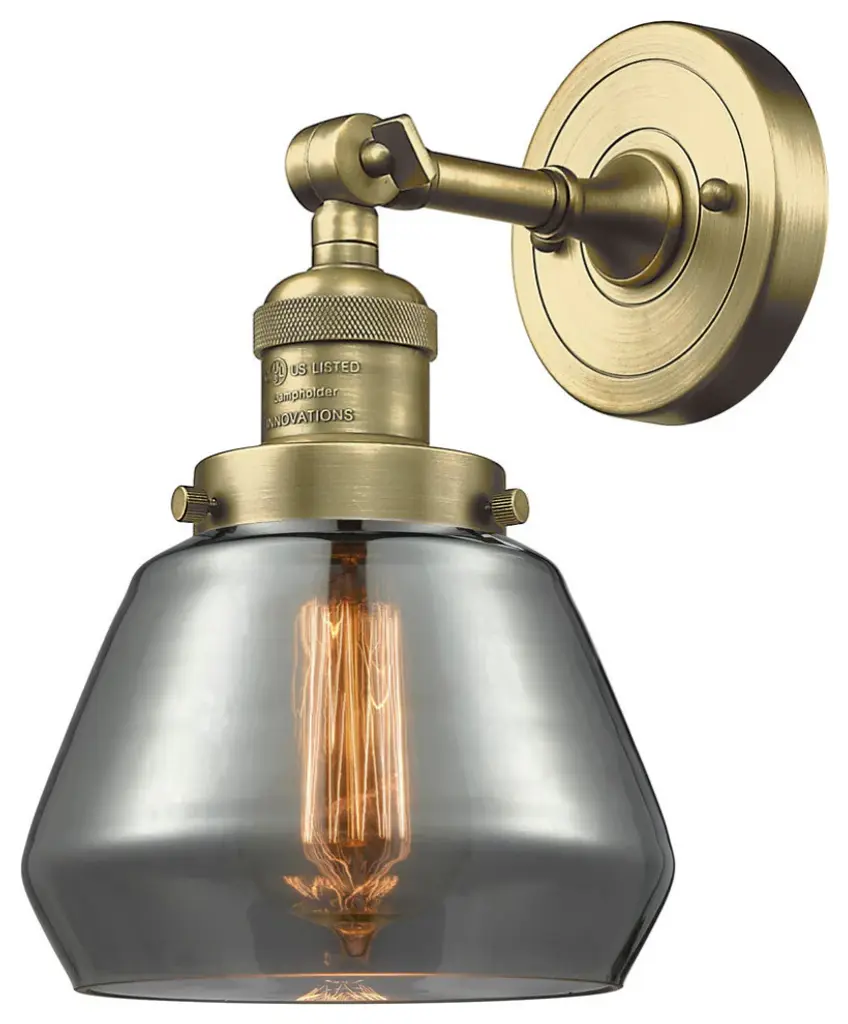 INNOVATIONS LIGHTING 203BK-BPAC-HRAC-G2 Halophane 1 Light Mixed Metals Sconce part of the Franklin Restoration Collection. Style: Industrial, Restoration-Vintage, Traditional. Collection: Franklin Restoration. Material: Steel, Cast Brass, Glass. Metal Finish(Body): Matte Black. Metal Finish(Canopy/Backplate): Matte Black. Accent Color: Antique Copper Fitter. Dimension(in): 8(H) x 8.5(W) x 11(Ext). Bulb: (1)60W Medium Base Vintage Bulb recommended(Not Included). Voltage: 120. Dimmable: Yes. Color Temperature: 2200. CRI: 99.9. Lumens: 220. Maximum Wattage Per Socket: 100. Glass Shade Description: Clear Halophane. Shade Material: Glass. Glass or Metal Shade Color: Clear Halophane. Glass Type: Transparent . Shade Size Dimension(in): 9(Dia) x 2(H). Shade Fitter Measurement: 3.25 inch Fitter. Backplate Dimenison(in): 5.5(Dia) x 1(Depth). ADA Compliant: No. UL & ETL Certification: Damp Location.