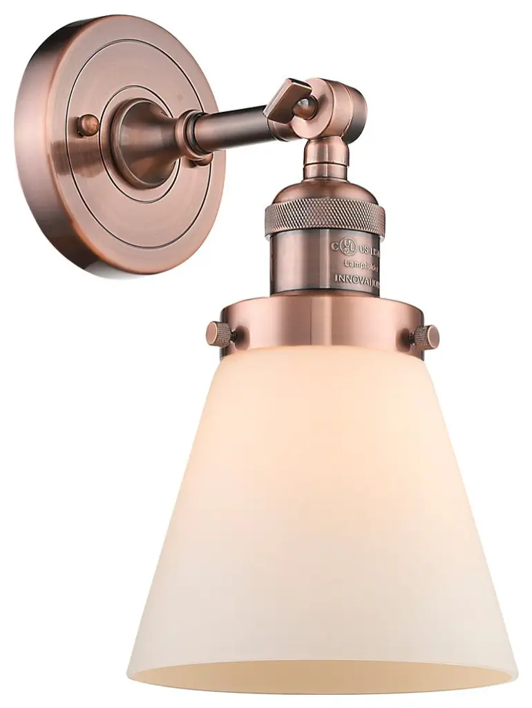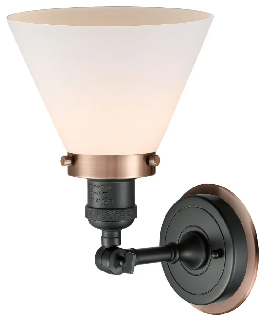 INNOVATIONS LIGHTING 203BK-BPAC-HRAC-G41 Large Cone 1 Light Mixed Metals Sconce part of the Franklin Restoration Collection. Style: Industrial, Farmhouse, Restoration-Vintage, Transitional . Collection: Franklin Restoration. Material: Steel, Cast Brass, Glass. Metal Finish(Body): Matte Black. Metal Finish(Canopy/Backplate): Matte Black. Accent Color: Antique Copper Fitter. Dimension(in): 10.5(H) x 8(W) x 9(Ext). Bulb: (1)60W Medium Base Vintage Bulb recommended(Not Included). Voltage: 120. Dimmable: Yes. Color Temperature: 2200. CRI: 99.9. Lumens: 220. Maximum Wattage Per Socket: 100. Glass Shade Description: Matte White Cased Large Cone. Shade Material: Glass. Glass or Metal Shade Color: Matte White. Glass Type: Frosted. Shade Size Dimension(in): 7.75(Dia) x 6(H). Shade Fitter Measurement: 3.25 inch Fitter. Backplate Dimenison(in): 5.5(Dia) x 1(Depth). ADA Compliant: No. UL & ETL Certification: Damp Location.