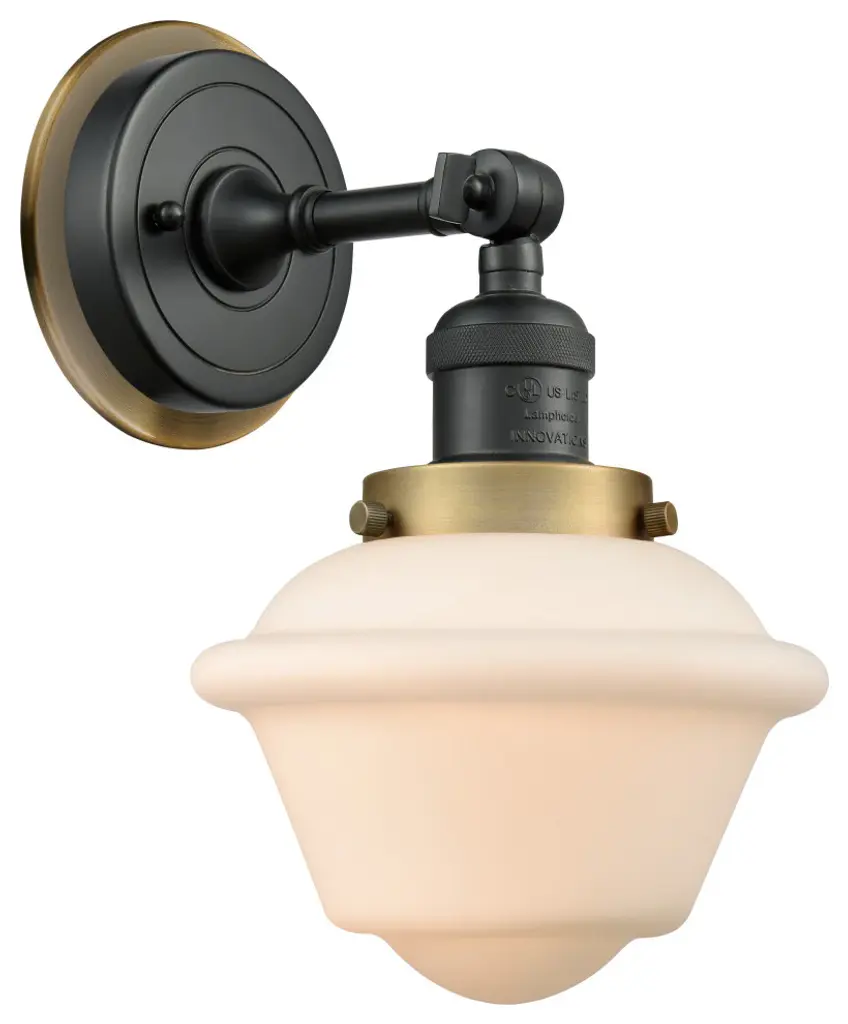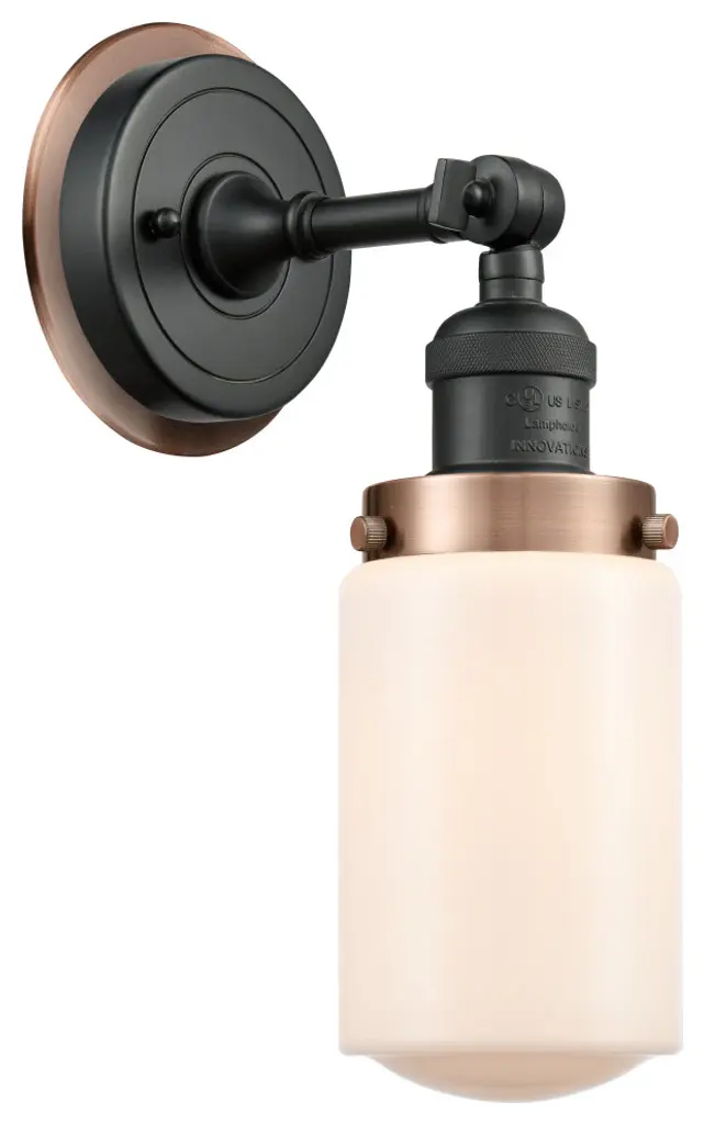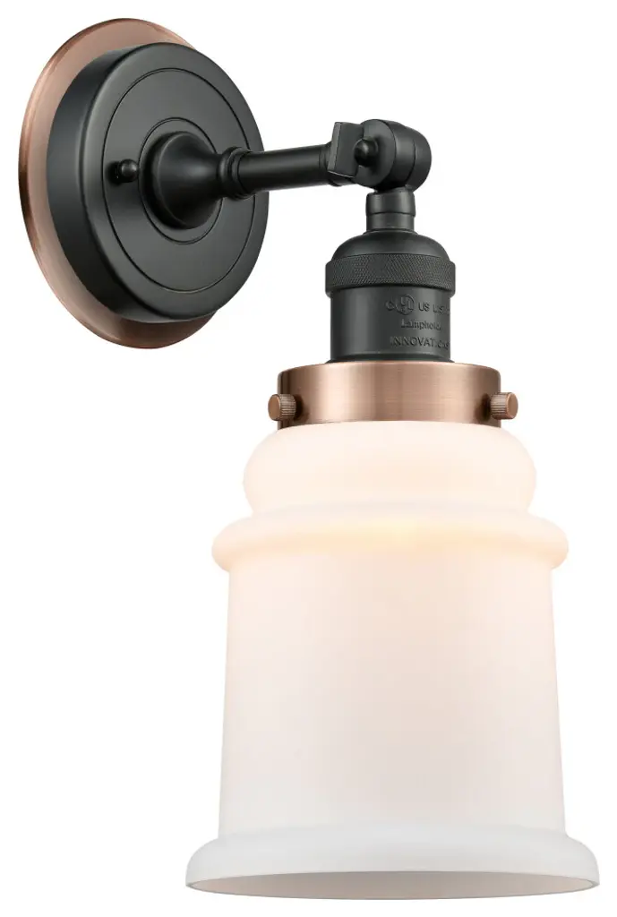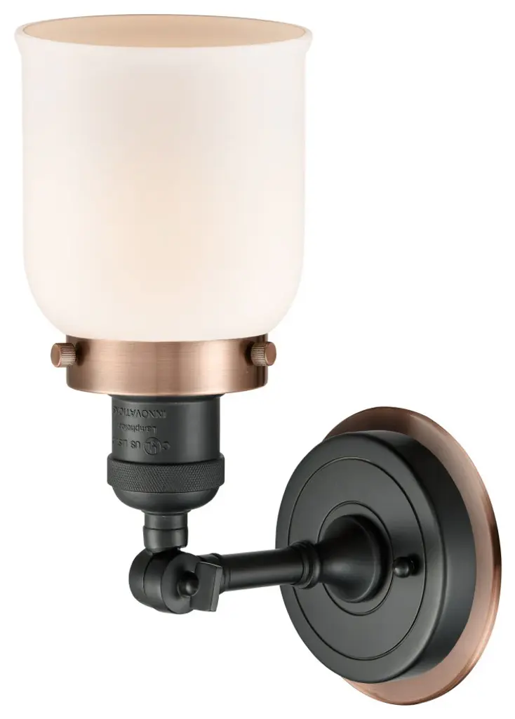 INNOVATIONS LIGHTING 203BK-BPAC-HRAC-G51 Small Bell 1 Light Mixed Metals Sconce part of the Franklin Restoration Collection. Style: Industrial, Farmhouse, Restoration-Vintage, Traditional. Collection: Franklin Restoration. Material: Steel, Cast Brass, Glass. Metal Finish(Body): Matte Black. Metal Finish(Canopy/Backplate): Matte Black. Accent Color: Antique Copper Fitter. Dimension(in): 10(H) x 5(W) x 7(Ext). Bulb: (1)60W Medium Base Vintage Bulb recommended(Not Included). Voltage: 120. Dimmable: Yes. Color Temperature: 2200. CRI: 99.9. Lumens: 220. Maximum Wattage Per Socket: 100. Glass Shade Description: Matte White Cased Small Bell. Shade Material: Glass. Glass or Metal Shade Color: Matte White. Glass Type: Frosted. Shade Size Dimension(in): 5(Dia) x 5.75(H). Shade Fitter Measurement: 3.25 inch Fitter. Backplate Dimenison(in): 5.5(Dia) x 1(Depth). ADA Compliant: No. UL & ETL Certification: Damp Location.