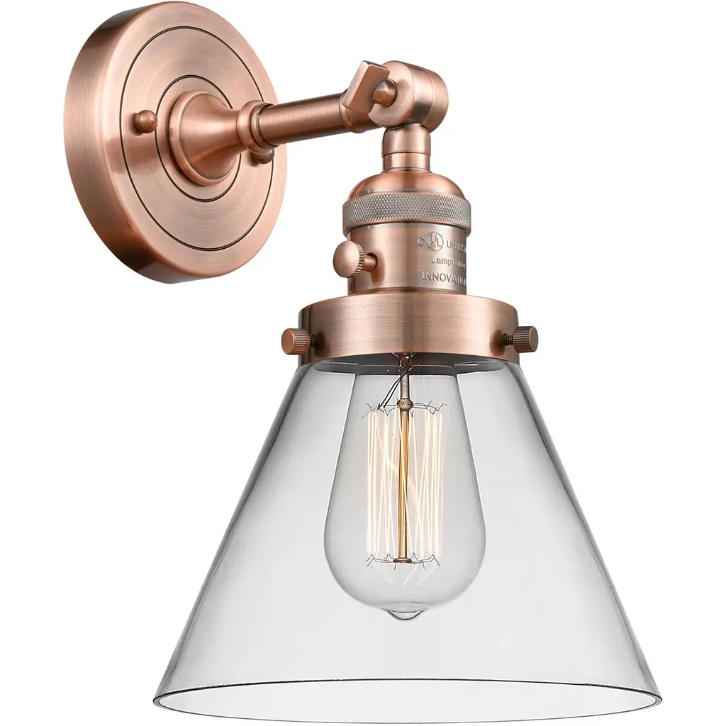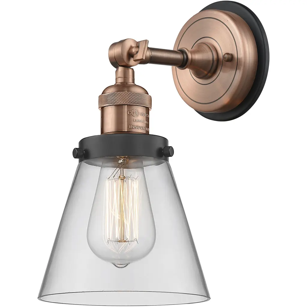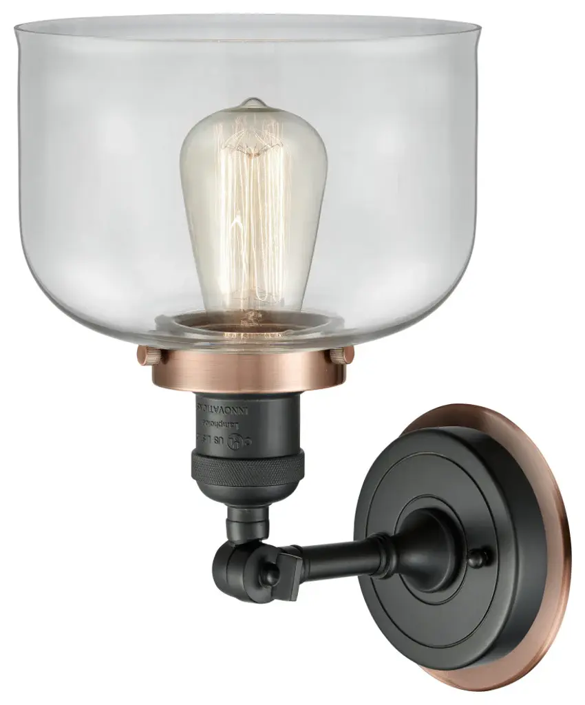 INNOVATIONS LIGHTING 203BK-BPAC-HRAC-G72 Large Bell 1 Light Mixed Metals Sconce part of the Franklin Restoration Collection. Style: Industrial, Farmhouse, Restoration-Vintage, Traditional. Collection: Franklin Restoration. Material: Steel, Cast Brass, Glass. Metal Finish(Body): Matte Black. Metal Finish(Canopy/Backplate): Matte Black. Accent Color: Antique Copper Fitter. Dimension(in): 12(H) x 8(W) x 9.375(Ext). Bulb: (1)60W Medium Base Vintage Bulb recommended(Not Included). Voltage: 120. Dimmable: Yes. Color Temperature: 2200. CRI: 99.9. Lumens: 220. Maximum Wattage Per Socket: 100. Glass Shade Description: Clear Large Bell. Shade Material: Glass. Glass or Metal Shade Color: Clear. Glass Type: Transparent . Shade Size Dimension(in): 8(Dia) x 5.75(H). Shade Fitter Measurement: 3.25 inch Fitter. Backplate Dimenison(in): 5.5(Dia) x 1(Depth). ADA Compliant: No. UL & ETL Certification: Damp Location.