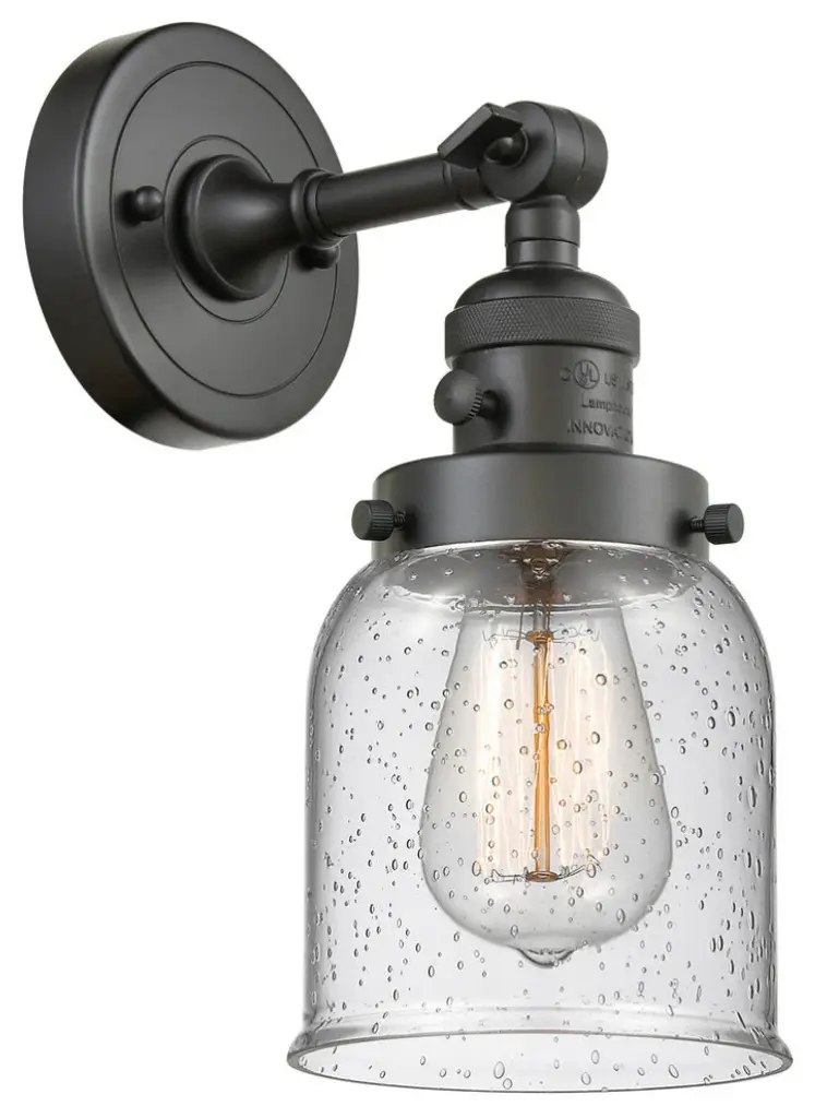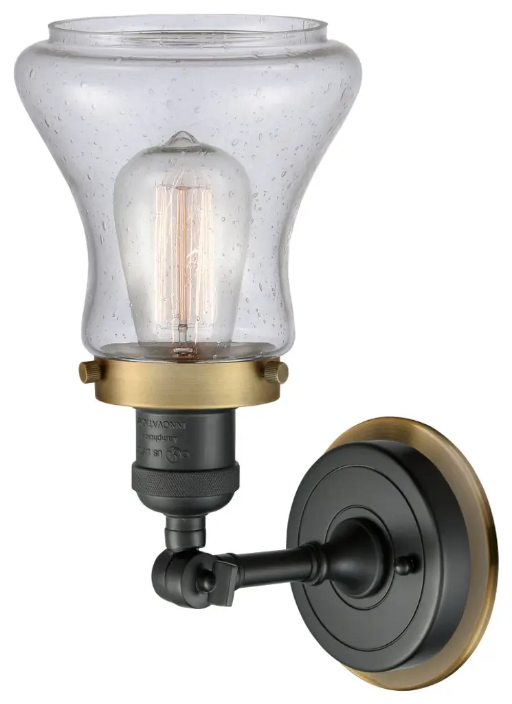INNOVATIONS LIGHTING 203BK-BPBB-HRBB-G194 Bellmont 1 Light Mixed Metals Sconce part of the Franklin Restoration Collection. Style: Industrial, Farmhouse, Seaside, Restoration-Vintage, Traditional. Collection: Franklin Restoration. Material: Steel, Cast Brass, Glass. Metal Finish(Body): Matte Black. Metal Finish(Canopy/Backplate): Matte Black. Accent Color: Brushed Brass Fitter. Dimension(in): 11(H) x 6.5(W) x 9(Ext). Bulb: (1)60W Medium Base Vintage Bulb recommended(Not Included). Voltage: 120. Dimmable: Yes. Color Temperature: 2200. CRI: 99.9. Lumens: 220. Maximum Wattage Per Socket: 100. Glass Shade Description: Seedy Bellmont. Shade Material: Glass. Glass or Metal Shade Color: Seedy. Glass Type: Seeded. Shade Size Dimension(in): 6(Dia) x 6.25(H). Shade Fitter Measurement: 3.25 inch Fitter. Backplate Dimenison(in): 5.5(Dia) x 1(Depth). ADA Compliant: No. UL & ETL Certification: Damp Location.