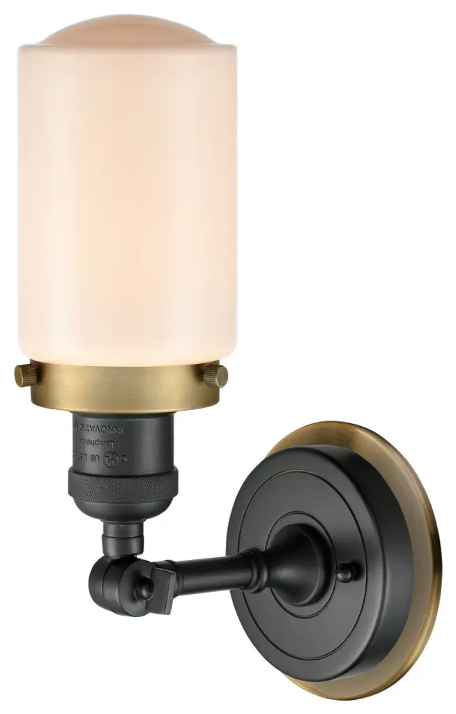 INNOVATIONS LIGHTING 203BK-BPBB-HRBB-G311 Dover 1 Light Mixed Metals Sconce part of the Franklin Restoration Collection. Style: Traditional. Collection: Franklin Restoration. Material: Steel, Cast Brass, Glass. Metal Finish(Body): Matte Black. Metal Finish(Canopy/Backplate): Matte Black. Accent Color: Brushed Brass Fitter. Dimension(in): 12.75(H) x 4.5(W) x 7.5(Ext). Bulb: (1)60W Medium Base Vintage Bulb recommended(Not Included). Voltage: 120. Dimmable: Yes. Color Temperature: 2200. CRI: 99.9. Lumens: 220. Maximum Wattage Per Socket: 100. Glass Shade Description: Matte White Cased Dover. Shade Material: Glass. Glass or Metal Shade Color: Matte White. Glass Type: Frosted. Shade Size Dimension(in): 4.5(Dia) x 6.5(H). Shade Fitter Measurement: 3.25 inch Fitter. Backplate Dimenison(in): 5.5(Dia) x 1(Depth). ADA Compliant: No. UL & ETL Certification: Damp Location.