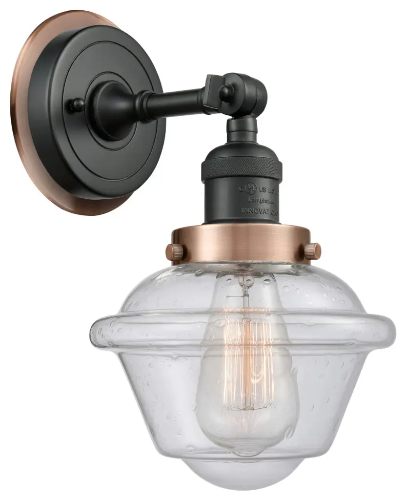 INNOVATIONS LIGHTING 203BK-BPBB-HRBB-G534 Small Oxford 1 Light Mixed Metals Sconce part of the Franklin Restoration Collection. Style: Traditional. Collection: Franklin Restoration. Material: Steel, Cast Brass, Glass. Metal Finish(Body): Matte Black. Metal Finish(Canopy/Backplate): Matte Black. Accent Color: Brushed Brass Fitter. Dimension(in): 12(H) x 7.5(W) x 9(Ext). Bulb: (1)60W Medium Base Vintage Bulb recommended(Not Included). Voltage: 120. Dimmable: Yes. Color Temperature: 2200. CRI: 99.9. Lumens: 220. Maximum Wattage Per Socket: 100. Glass Shade Description: Seedy Small Oxford. Shade Material: Glass. Glass or Metal Shade Color: Seedy. Glass Type: Seeded. Shade Size Dimension(in): 7.5(Dia) x 5.75(H). Shade Fitter Measurement: 3.25 inch Fitter. Backplate Dimenison(in): 5.5(Dia) x 1(Depth). ADA Compliant: No. UL & ETL Certification: Damp Location.