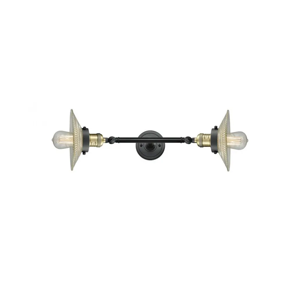 INNOVATIONS LIGHTING 208L-BAB-G2-LED Halophane 2 Light Bath Vanity Light part of the Franklin Restoration Collection. The Halophane 2 Light Bath Vanity Light is part of the Franklin Restoration Collection.Solid Brass 180 Degree Adjustable Swivels with internal teeth that lock in at 5 degree intervals. Collection: Franklin Restoration. Material: Steel, Cast Brass, Glass. Metal Finish(Body): Black Antique Brass. Metal Finish(Canopy/Backplate): Black Antique Brass. Dimension(in): 8.5(W) x 19.75(H) x 11(Ext). Bulb: (2)3.5 Watt LED Vintage Medium Base Bulb Included,Dimmable. Color Temperature: 2700. Color Rendering Index(CRI): 82. Lumens): 350. Voltage: 120. Glass: Clear Halophane/Transparent. Shade Shape: Cone. Shade Material: Glass. Shade Size(in): 9 X 2. Shade Fitter Measurement: 3.25 inch Fitter. Canopy Dimension(in): 4.5. Backplate Dimension(in): 4.5x0.75. Solid Brass 180 Degree Adjustable Swivels with internal teeth that lock in at 5 degree intervals. Fixtures can be hung Horizontally or Vertically. Fixture can be hung with bulbs facing up or down as a Wall Mount. UL/CUL Damp Rated. Warranty: 2 Year Finish, Lifetime Electrical.