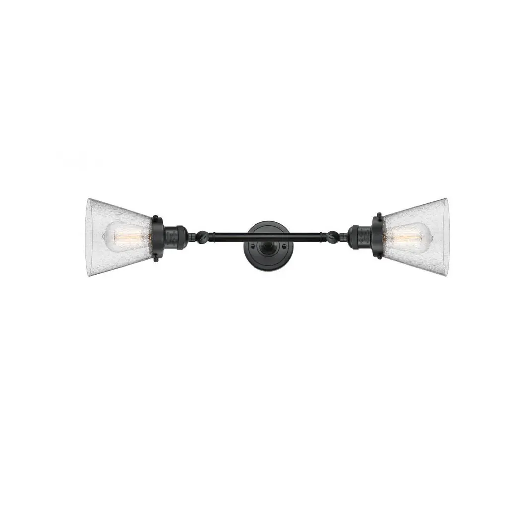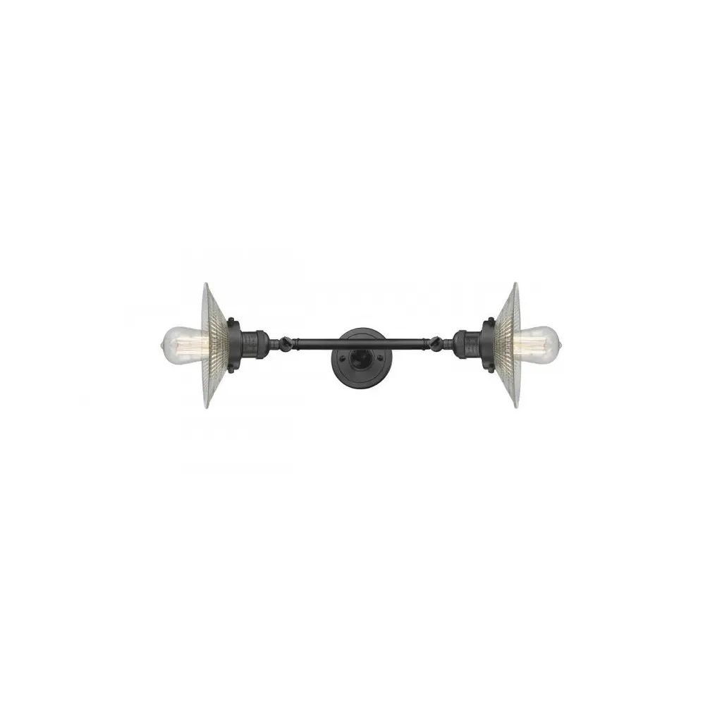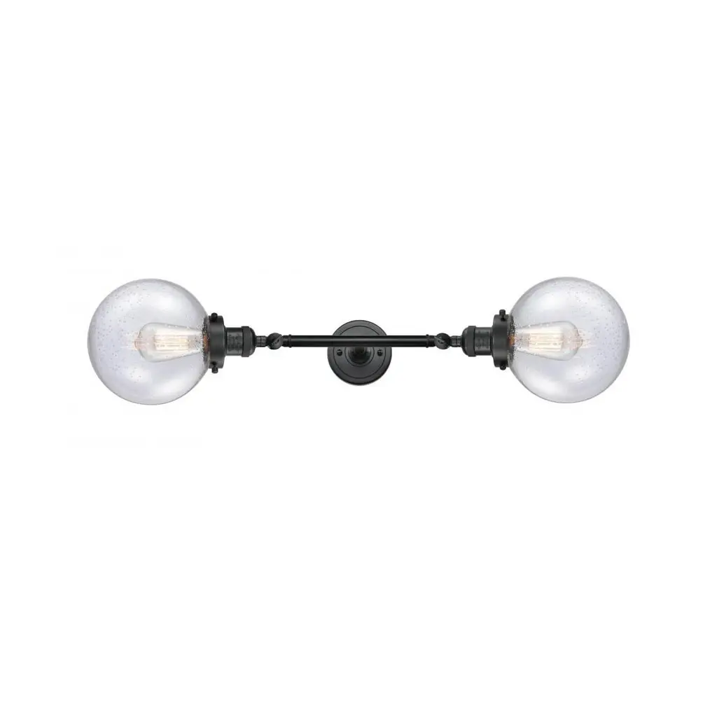 INNOVATIONS LIGHTING 208L-BK-G262-LED Stanton 2 Light Bath Vanity Light part of the Franklin Restoration Collection. The Stanton 2 Light Bath Vanity Light is part of the Franklin Restoration Collection.Solid Brass 180 Degree Adjustable Swivels with internal teeth that lock in at 5 degree intervals. Collection: Franklin Restoration. Material: Steel, Cast Brass, Glass. Metal Finish(Body): Matte Black. Metal Finish(Canopy/Backplate): Matte Black. Dimension(in): 6(W) x 25(H) x 8(Ext). Bulb: (2)3.5 Watt LED Vintage Medium Base Bulb Included,Dimmable. Color Temperature: 2700. Color Rendering Index(CRI): 82. Lumens): 350. Voltage: 120. Glass: Vintage Wire Mesh Stanton/Transparent. Shade Shape: Cylinder. Shade Material: Glass. Shade Size(in): 6 X 7.75. Shade Fitter Measurement: 3.25 inch Fitter. Canopy Dimension(in): 4.5. Backplate Dimension(in): 4.5x0.75. Solid Brass 180 Degree Adjustable Swivels with internal teeth that lock in at 5 degree intervals. Fixtures can be hung Horizontally or Vertically. Fixture can be hung with bulbs facing up or down as a Wall Mount. UL/CUL Damp Rated. Warranty: 2 Year Finish, Lifetime Electrical.