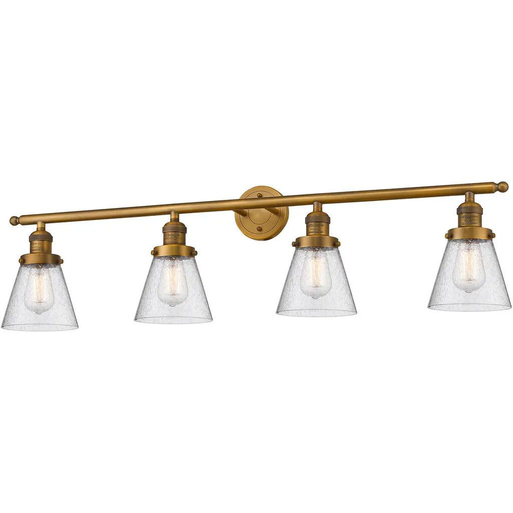 INNOVATIONS LIGHTING 215-BB-G44 Large Cone 4 Light Bath Vanity Light part of the Franklin Restoration Collection. The Large Cone 4 Light Bath Vanity Light is part of the Franklin Restoration Collection.Solid Brass 180 Degree Adjustable Swivels with internal teeth that lock in at 5 degree intervals With Engraved Cast Cup. Collection: Franklin Restoration. Material: Steel, Cast Brass, Glass. Metal Finish(Body): Brushed Brass. Metal Finish(Canopy/Backplate): Brushed Brass. Dimension(in): 43.75(W) x 10(H) x 8.375(Ext). Bulb: (4)100 Medium Base Vintage Bulb recommended(Not Included). Voltage: 120. Glass: Seedy Large Cone/Seeded. Shade Shape: Cone. Shade Material: Glass. Shade Size(in): 7.75 X 6. Shade Fitter Measurement: 3.25 inch Fitter. Canopy Dimension(in): 4.5. Backplate Dimension(in): 4.5x0.75. Solid Brass 180 Degree Adjustable Swivels with internal teeth that lock in at 5 degree intervals With Engraved Cast Cup. UL/CUL Damp Rated. Warranty: 2 Year Finish, Lifetime Electrical.