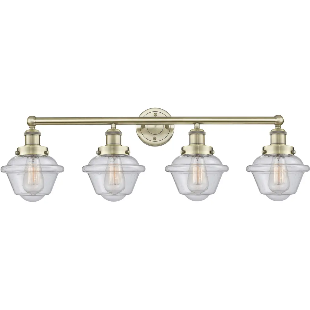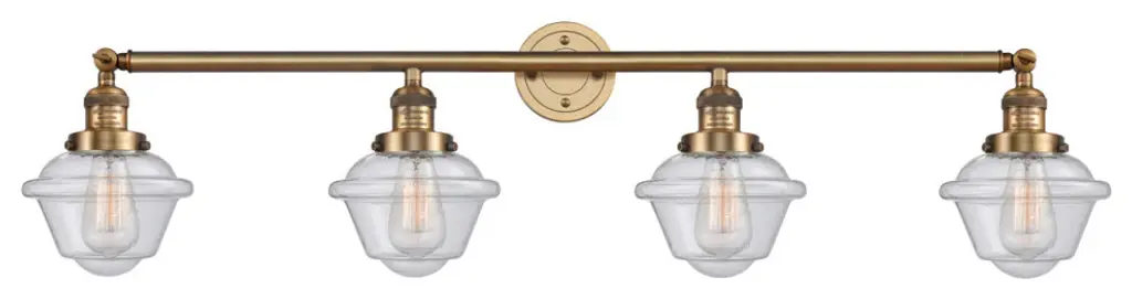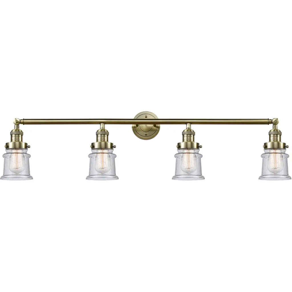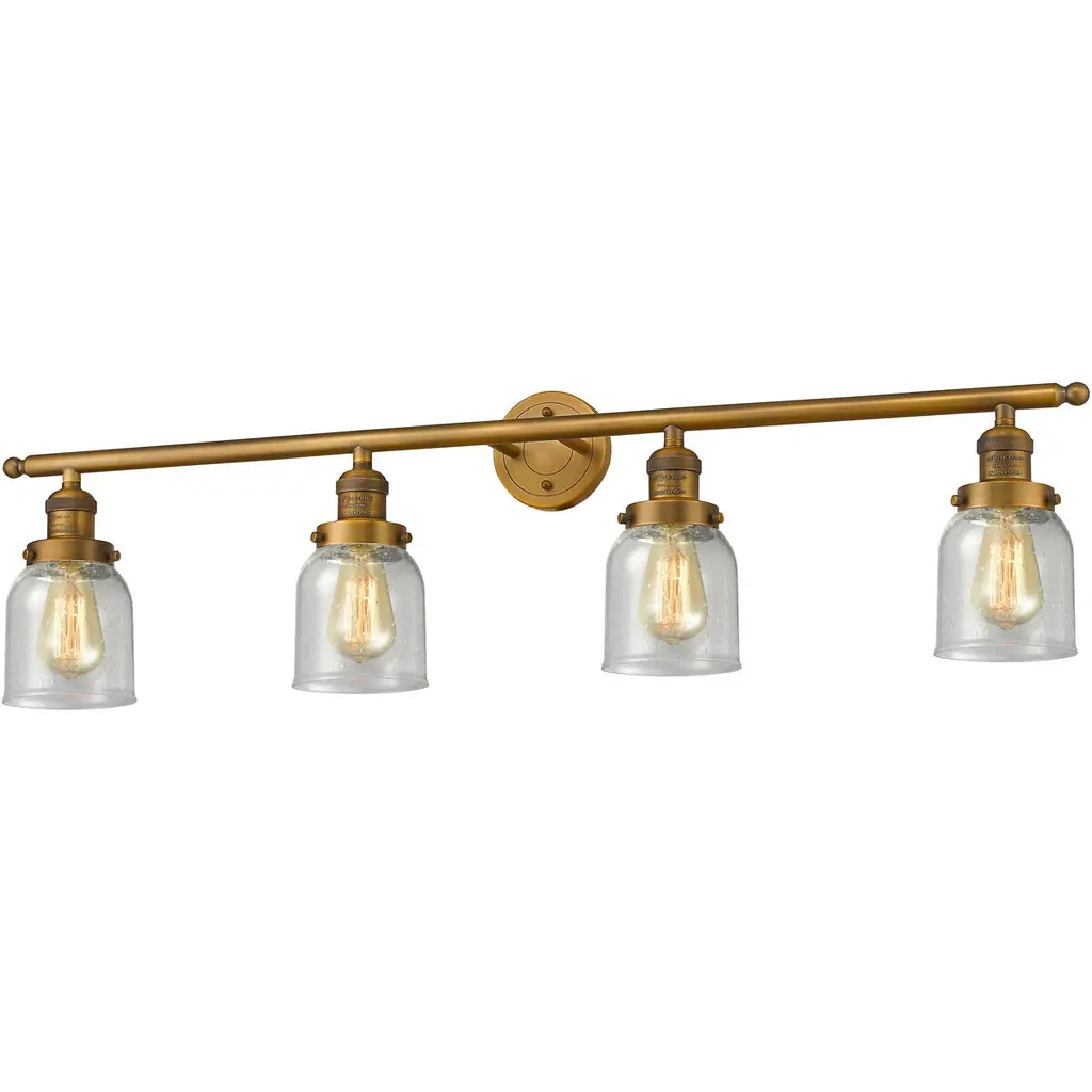 INNOVATIONS LIGHTING 215-BB-G54 Small Bell 4 Light Bath Vanity Light part of the Franklin Restoration Collection. The Small Bell 4 Light Bath Vanity Light is part of the Franklin Restoration Collection.Solid Brass 180 Degree Adjustable Swivels with internal teeth that lock in at 5 degree intervals With Engraved Cast Cup. Collection: Franklin Restoration. Material: Steel, Cast Brass, Glass. Metal Finish(Body): Brushed Brass. Metal Finish(Canopy/Backplate): Brushed Brass. Dimension(in): 42(W) x 9.75(H) x 7(Ext). Bulb: (4)100 Medium Base Vintage Bulb recommended(Not Included). Voltage: 120. Glass: Seedy Small Bell/Seeded. Shade Shape: Bell. Shade Material: Glass. Shade Size(in): 5 X 5.75. Shade Fitter Measurement: 3.25 inch Fitter. Canopy Dimension(in): 4.5. Backplate Dimension(in): 4.5x0.75. Solid Brass 180 Degree Adjustable Swivels with internal teeth that lock in at 5 degree intervals With Engraved Cast Cup. UL/CUL Damp Rated. Warranty: 2 Year Finish, Lifetime Electrical.