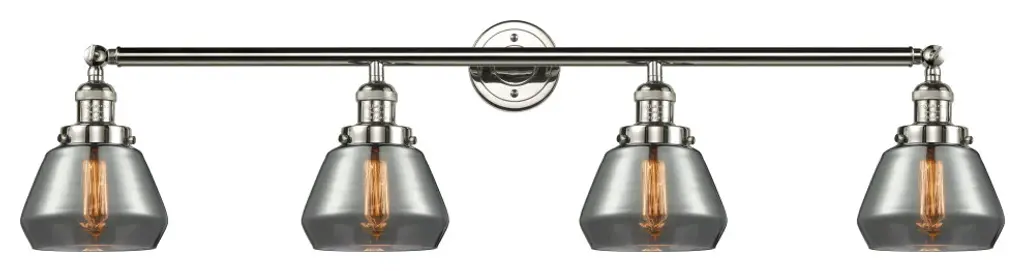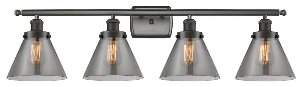 INNOVATIONS LIGHTING 215-OB-G173 4 Light Bathroom FixtureFulton 4-100 watt 42.75 inch Oiled Rubbed Bronze Bathroom Fixture with Smoked glassCollection: FultonMetal Finish: Oiled Rubbed BronzeMaterial: Cast Brass, GlassGlass Color: Oiled Rubbed BronzeGlass/Metal Shade Color: Plated SmokedGlass/Shade Description: Plated Smoked FultonDimension(in): 42.75(W) x 9.25(H) x 7.875(Ext)Glass Shade Dimension(in): 6.75 X 5.25Shade Fitter Size: 3.25 inch FitterCanopy Dimension(in): 4.5(Dia)Backplate Dimension(in): 4.5(Dia) x 0.75(Depth)Bulb: (4)Medium Base Vintage Bulb(Not Included)Max Watts Per Socket: 100UL Certification Type: Damp LocationETL Certification Type: Damp LocationReversible(can be hung with bulbs facing up or down): Yes