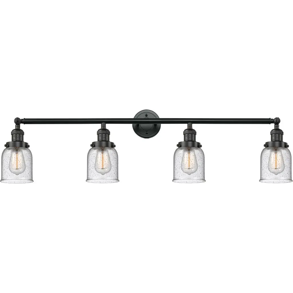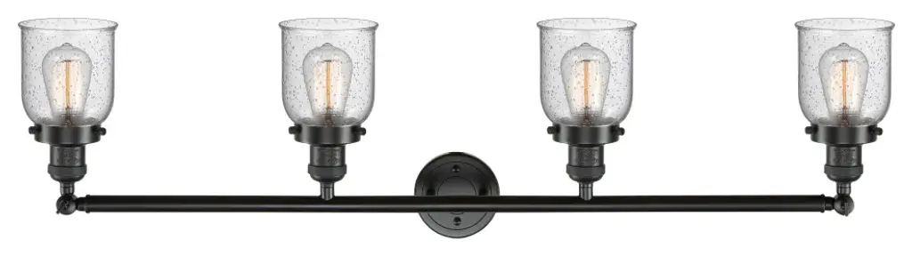 INNOVATIONS LIGHTING 215-OB-G54 4 Light Bathroom FixtureSmall Bell 4-100 watt 42 inch Oiled Rubbed Bronze Bathroom Fixture with Seedy glassCollection: Small BellMetal Finish: Oiled Rubbed BronzeMaterial: Cast Brass, GlassGlass Color: Oiled Rubbed BronzeGlass/Metal Shade Color: SeedyGlass/Shade Description: Seedy Small BellDimension(in): 42(W) x 9.75(H) x 7(Ext)Glass Shade Dimension(in): 5 X 5.75Shade Fitter Size: 3.25 inch FitterCanopy Dimension(in): 4.5(Dia)Backplate Dimension(in): 4.5(Dia) x 0.75(Depth)Bulb: (4)Medium Base Vintage Bulb(Not Included)Max Watts Per Socket: 100UL Certification Type: Damp LocationETL Certification Type: Damp LocationReversible(can be hung with bulbs facing up or down): Yes