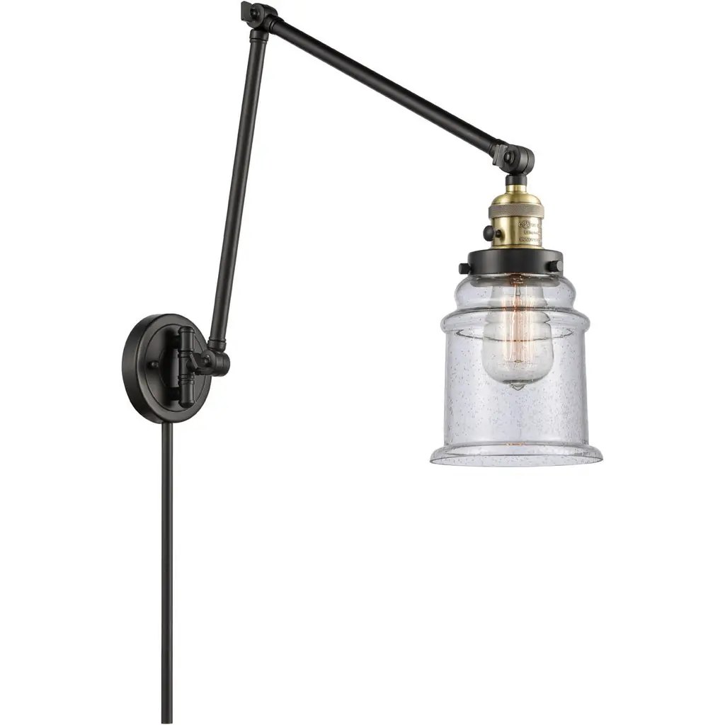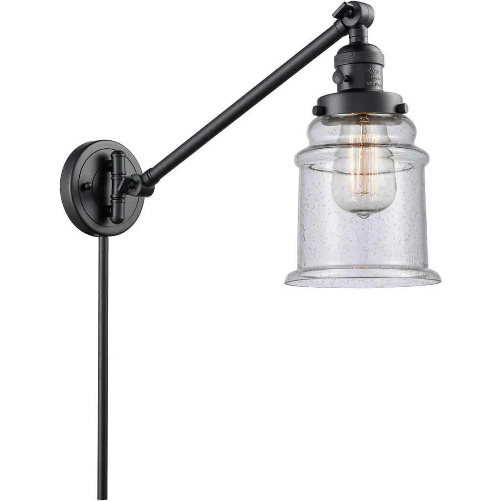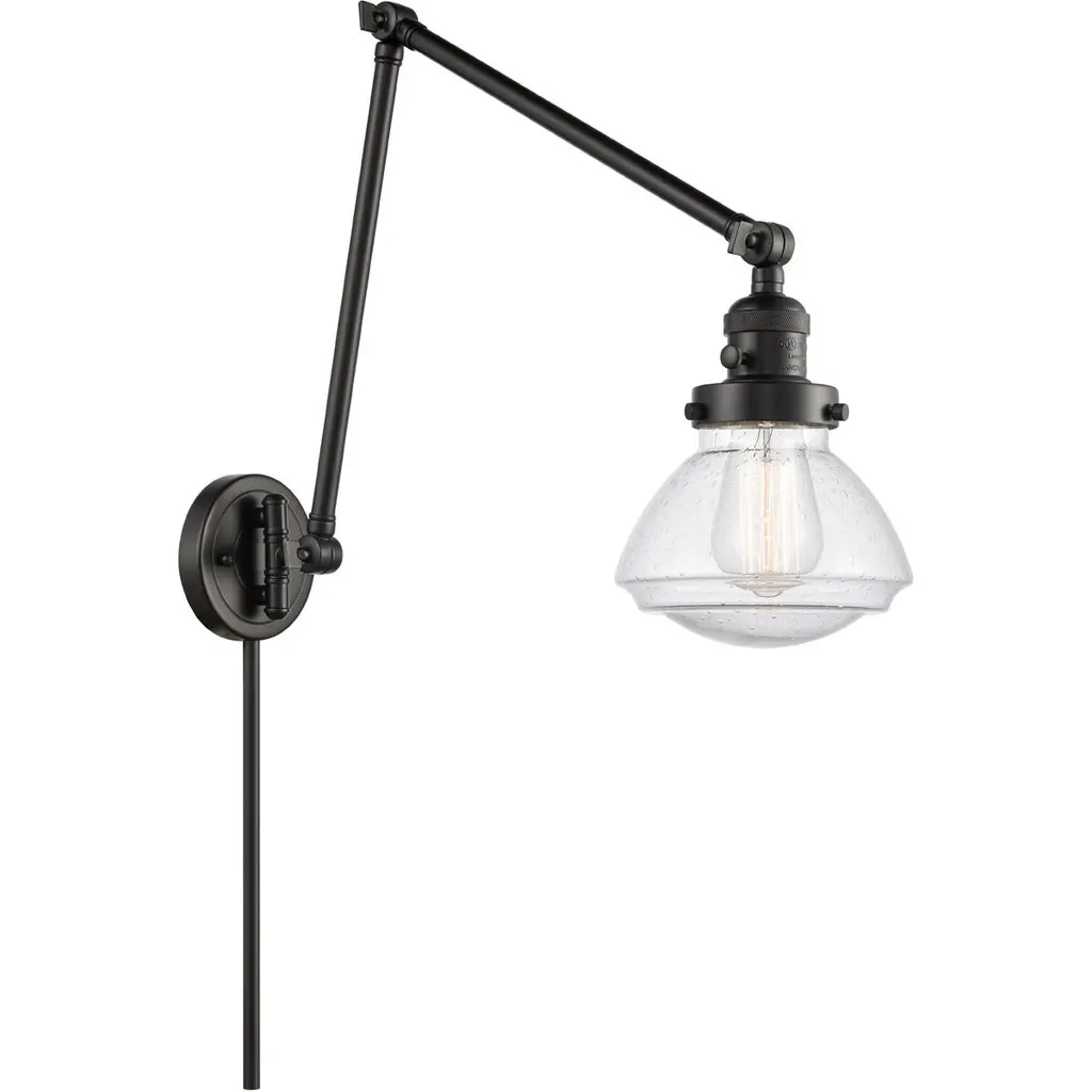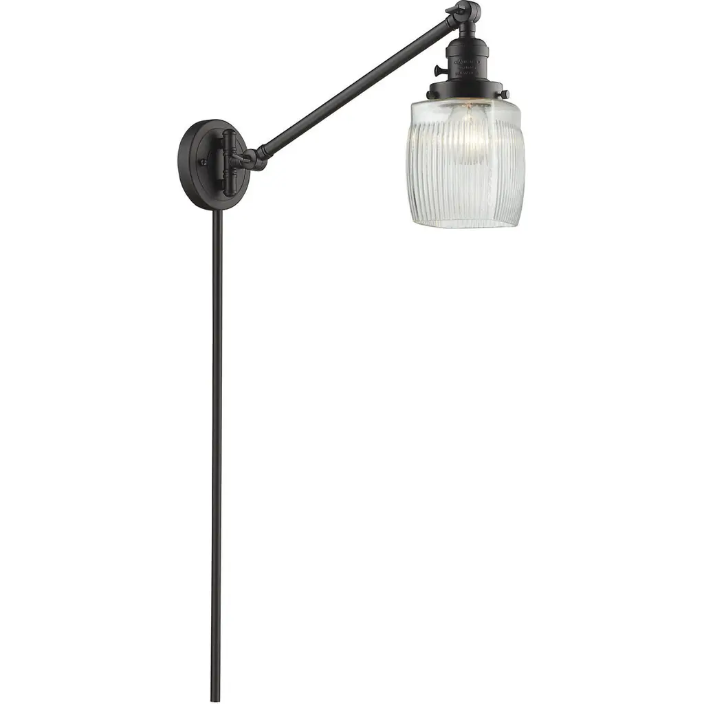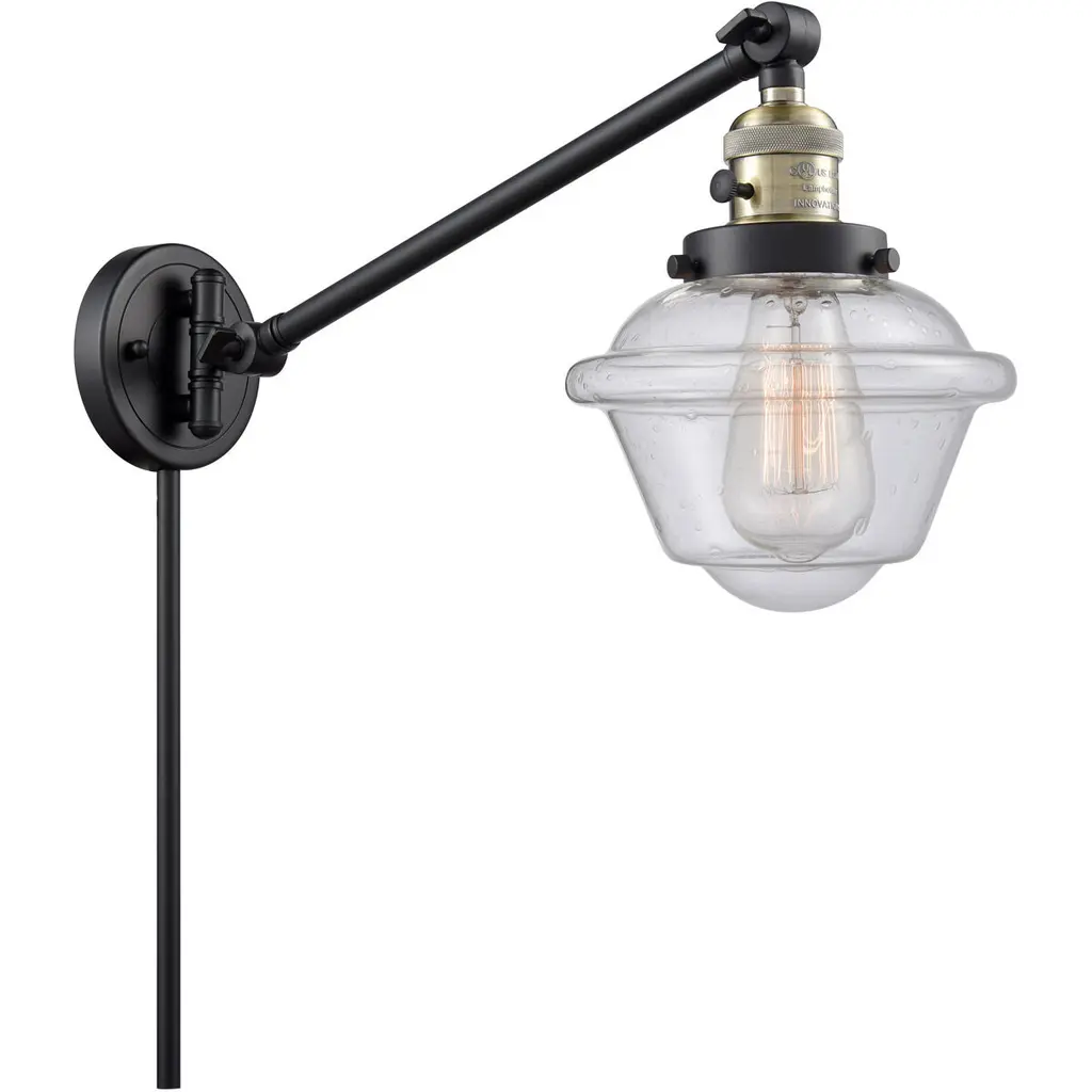 INNOVATIONS LIGHTING 237-BK-G532-LED Small Oxford 1 Light Swing Arm. The Small Oxford 1 Light Swing Arm is part of the Franklin Restoration Collection.3 Way (High-Low-Off) Switch Included on Socket. Family Name: Small Oxford. Collection Name: Franklin Restoration. Metal Finish(Body): Matte Black. Metal Finish (Canopy/Backplate): Matte Black. Material: Steel, Cast Brass, Glass. Dimension(in): 25(H) x 8(W) x 30(Ext). Glass Shade Description: Clear Small Oxford. Glass Type: Transparent. Glass or Metal Shade Shape: Schoolhouse. Glass or Metal Shade Color: Clear. Shade Material: Glass. Shade Size(Diameter x Height): 7.5 X 5.75. Shade Dimension(in): 7.5(Dia) x 5.75(H). Canopy Dimensions(in): 4.5. Backplate Dimensions(in): 4.5x0.75. Cord: Molded plug with 7 Feet Of Wire. Stem Specs: 2-12 inch solid tube cord covers. Bulb: (1)3.5W Medium Base LED(Included), Dimmable. Color Temperature: 2700. Lumens: 350. Color Rendering Index(CRI): 82. Life Expectancy(Hours): 15000. Switch Type : High-Low-Off. Voltage : 120. Warranty: 2 Year Finish, Lifetime Electrical. 3 Way (High-Low-Off) Switch Included on Socket. Fixture can be hung with bulbs facing up or down as a Wall Mount or Facing Down as a Ceiling Mount. Rated for 100 Watt Maximum. UL/CUL Damp Rated. In order to maintain the finish we recommend simply using water and a cheesecloth towel. Compatible with Incandescent, LED, Fluoresent and Halogen bulbs.