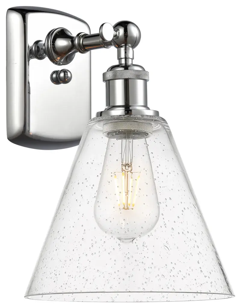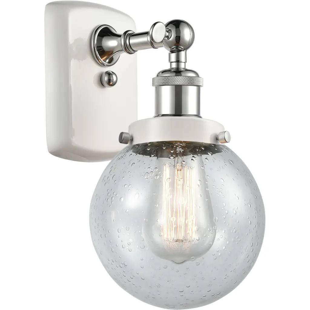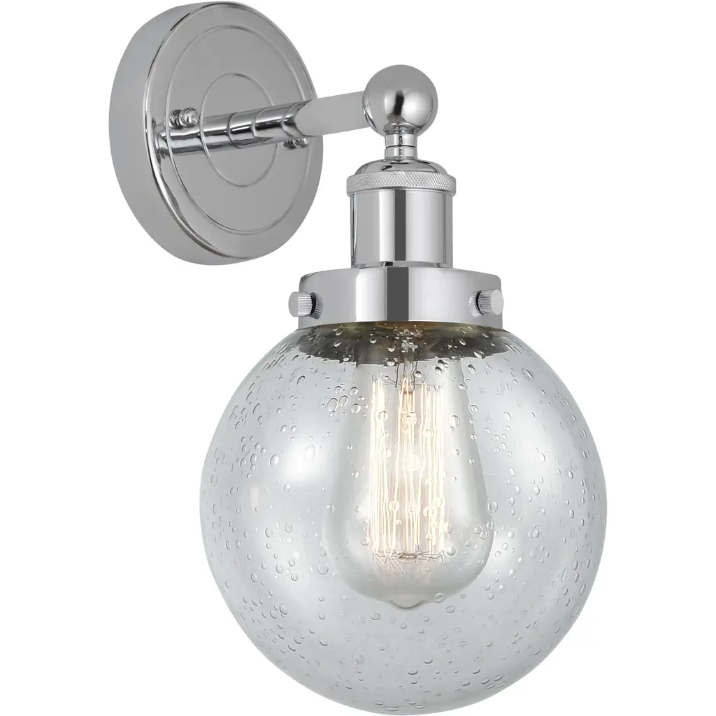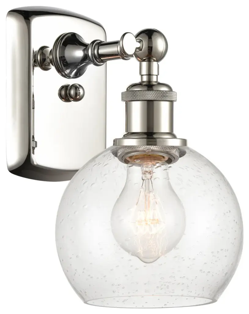 INNOVATIONS LIGHTING 284-1W-BPN-G204-6-LED Beacon 1 Light Sconce part of the Nouveau Collection. The Beacon 1 Light Sconce is part of the Nouveau Collection. Collection: Nouveau. Material: Steel, Cast Brass, Glass. Accent Color: Polished Nickel. Metal Finish(Body): Black Polished Nickel. Metal Finish(Canopy/Backplate): Polished Nickel. Dimension(in): 6(W) x 9(H) x 7.25(Ext). Bulb: (1)3.5 Watt LED Vintage Medium Base Bulb Included,Dimmable. Color Temperature: 2700. Color Rendering Index(CRI): 82. Lumens): 350. Voltage: 120. Glass: Seedy Globe/Seeded. Shade Shape: Globe. Shade Material: Glass. Shade Size(in): 6 X 5.75. Shade Fitter Measurement: 3.25 inch Fitter. Canopy Dimension(in): 4.5. Backplate Dimension(in): 4.5x0.75. Fixture can be hung with bulbs facing up or down. UL/CUL Damp Rated. Warranty: 2 Year Finish, Lifetime Electrical.
