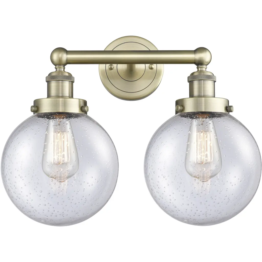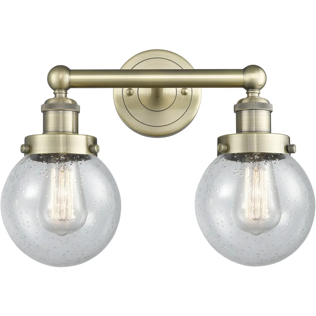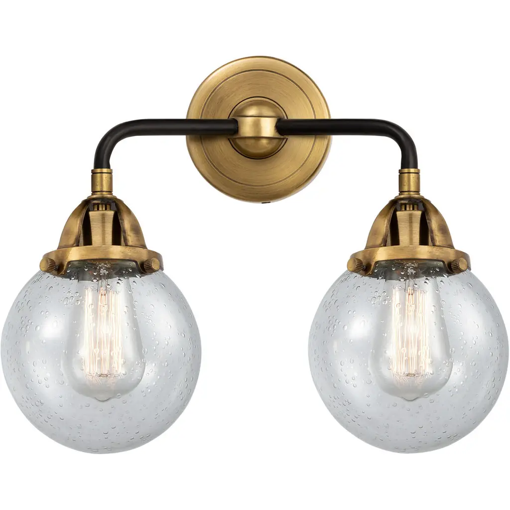 INNOVATIONS LIGHTING 284-2W-BAB-G204-6 Beacon 2 Light Bath Vanity Light part of the Nouveau Collection. The Beacon 2 Light Bath Vanity Light is part of the Nouveau Collection. Collection: Nouveau. Material: Steel, Cast Brass, Glass. Accent Color: Matte Black. Metal Finish(Body): Black Antique Brass. Metal Finish(Canopy/Backplate): Black Antique Brass. Dimension(in): 14(W) x 11(H) x 7.25(Ext). Bulb: (2)100 Medium Base Vintage Bulb recommended(Not Included). Voltage: 120. Glass: Seedy Globe/Seeded. Shade Shape: Globe. Shade Material: Glass. Shade Size(in): 6 X 5.75. Shade Fitter Measurement: 3.25 inch Fitter. Canopy Dimension(in): 4.5. Backplate Dimension(in): 4.5x0.75. Fixture can be hung with bulbs facing up or down. UL/CUL Damp Rated. Warranty: 2 Year Finish, Lifetime Electrical.