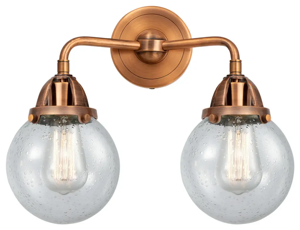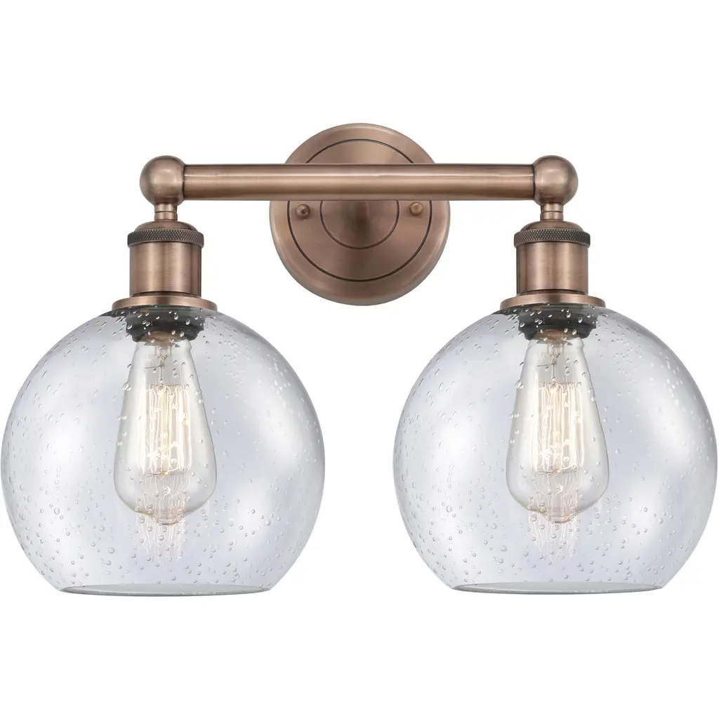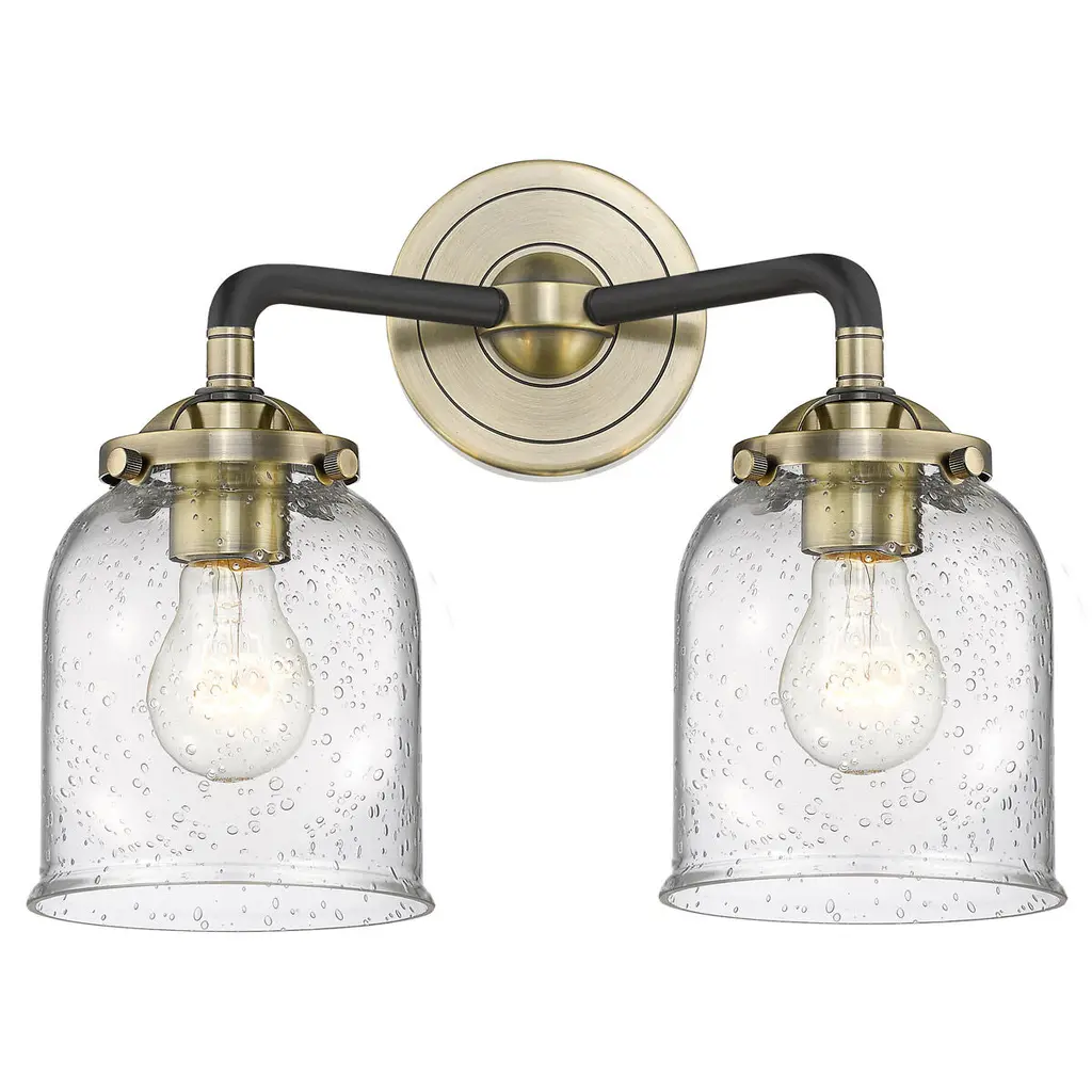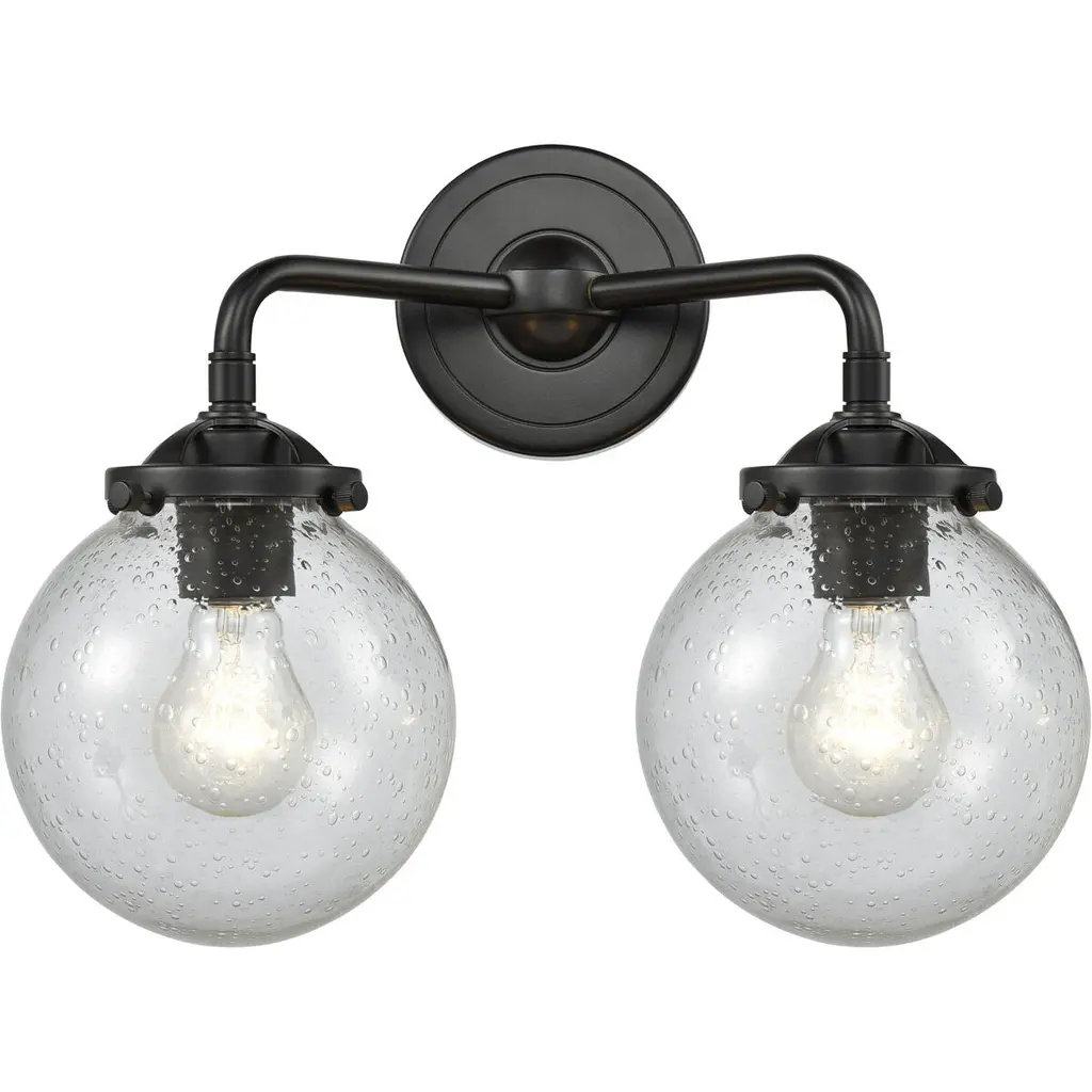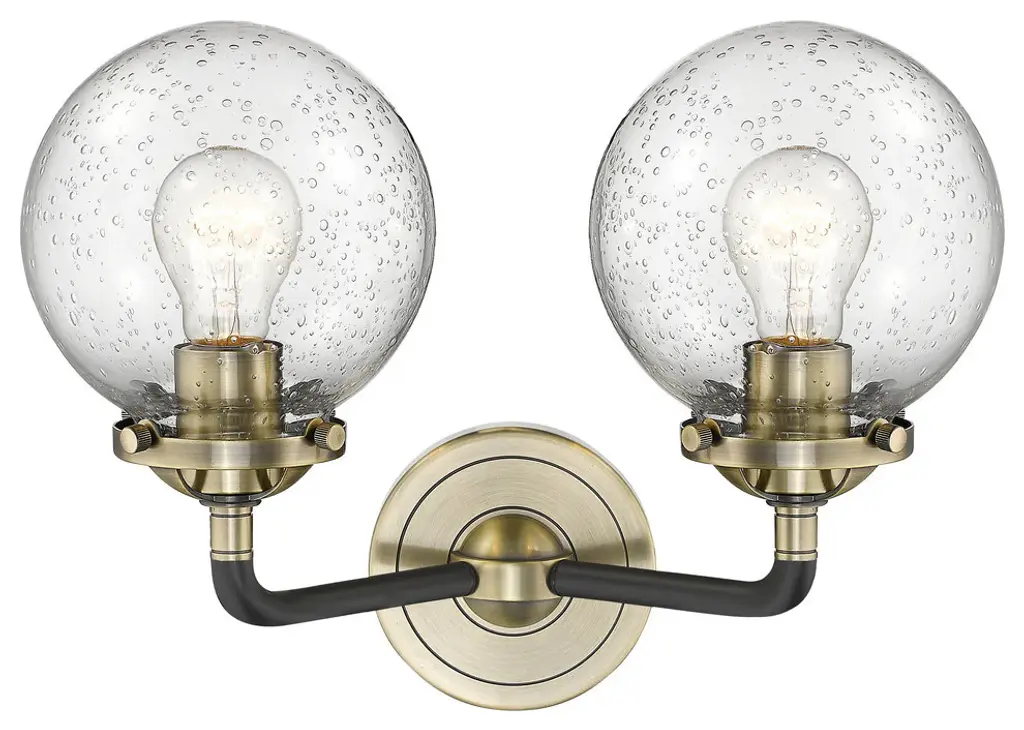 INNOVATIONS LIGHTING 284-2W-BAB-G204-LED Baldwin 2 Light Sconce part of the Nouveau Collection. The Baldwin 2 Light Sconce is part of the Nouveau Collection. Collection: Nouveau. Material: Steel, Cast Brass, Glass. Accent Color: Matte Black. Metal Finish(Body): Black Antique Brass. Metal Finish(Canopy/Backplate): Black Antique Brass. Dimension(in): 14(W) x 11(H) x 7.25(Ext). Bulb: (2)3.5 Watt LED Vintage Medium Base Bulb Included,Dimmable. Color Temperature: 2700. Color Rendering Index(CRI): 82. Lumens): 350. Voltage: 120. Glass: Seedy Baldwin/Seeded. Shade Shape: Globe. Shade Material: Glass. Shade Size(in): 6 X 5.75. Shade Fitter Measurement: 3.25 inch Fitter. Canopy Dimension(in): 4.5. Backplate Dimension(in): 4.5x0.75. Fixture can be hung with bulbs facing up or down. UL/CUL Damp Rated. Warranty: 2 Year Finish, Lifetime Electrical.