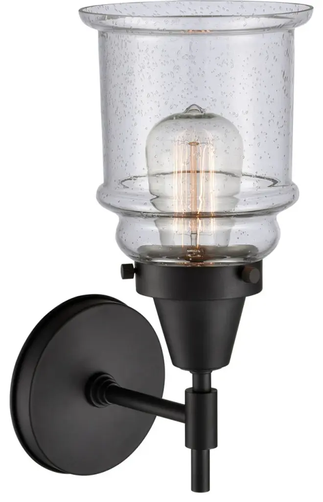 INNOVATIONS LIGHTING 447-1W-BK-G184-LED Caden 1 Light 9 inch Sconce. Innovations Lighting Caden 1 Light 9 inch Matte Black Sconce. Metal Finish (Body): Matte Black. Metal Finish (Canopy/Backplate): Matte Black. Glass or Metal Shade Color: Seedy. Material: Steel, Glass. Shade Material: Glass. Dimension(in): 12.5(H) x 6(W) x 8.25(Ext). Backplate Dimension(in): 0.875(D) x 5(Dia). Shade Size(in): 7.25(H) x 6(Dia). Bulb: (1) 3.5 Watt LED Vintage Medium Base Bulb Included. Voltage: 120. Dimmable: Yes. Color Temperature(Kelvin): 2700. CRI: 82. Lumens: 350. Glass Type: Seeded. Glass or Metal Shade Shape: Cone. Shade Fitter Measurement: 3.25 inch Fitter. ADA Compliant: No. Style: Retro, Industrial. Ul Certification Type: Damp Location. Warranty: 2 Year Finish, Lifetime Electrical.