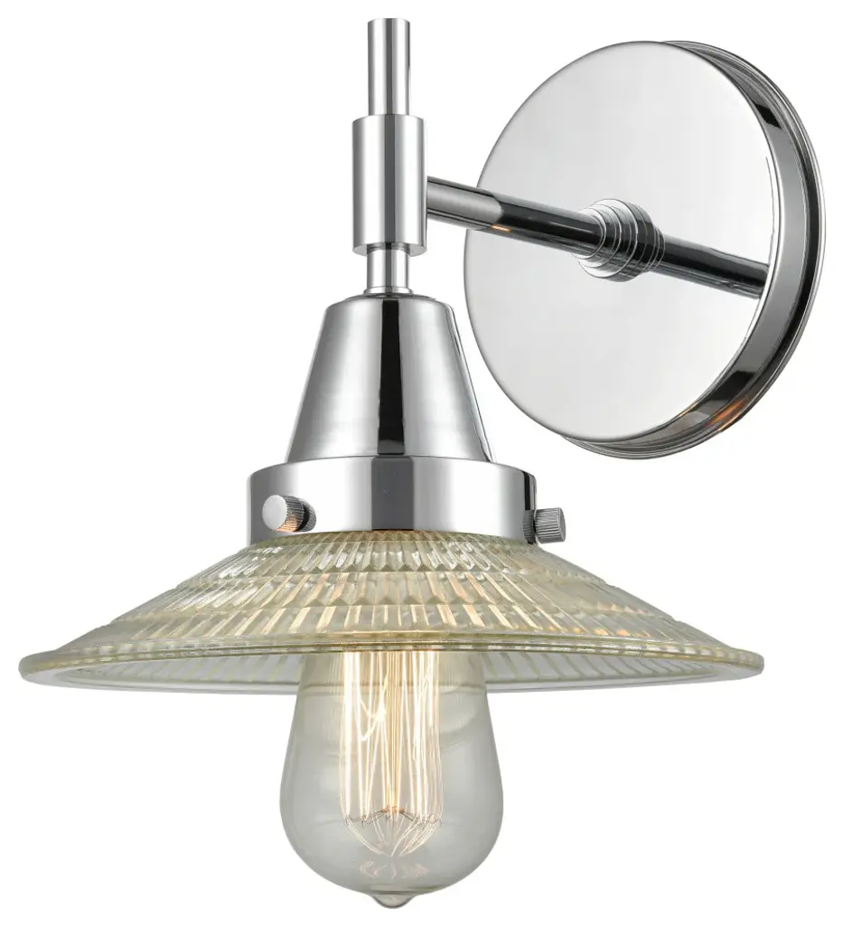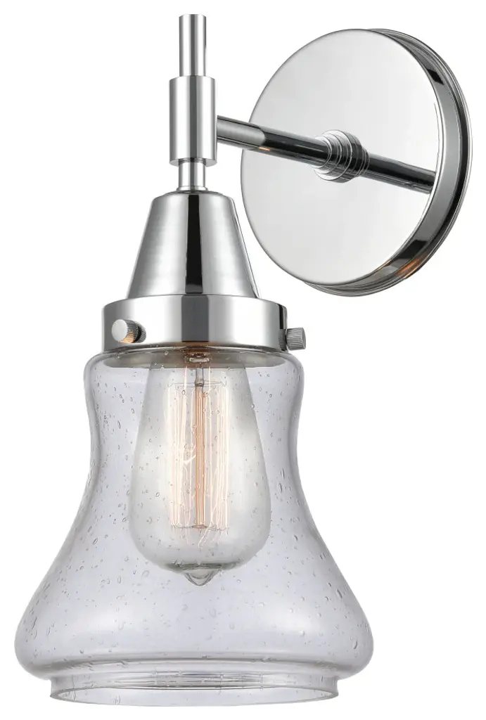 INNOVATIONS LIGHTING 447-1W-PC-G182-LED Caden 1 Light 9 inch Sconce. Innovations Lighting Caden 1 Light 9 inch Polished Chrome Sconce. Metal Finish (Body): Polished Chrome. Metal Finish (Canopy/Backplate): Polished Chrome. Glass or Metal Shade Color: Clear. Material: Steel, Glass. Shade Material: Glass. Dimension(in): 12.5(H) x 6(W) x 8.25(Ext). Backplate Dimension(in): 0.875(D) x 5(Dia). Shade Size(in): 7.25(H) x 6(Dia). Bulb: (1) 3.5 Watt LED Vintage Medium Base Bulb Included. Voltage: 120. Dimmable: Yes. Color Temperature(Kelvin): 2700. CRI: 82. Lumens: 350. Glass Type: Transparent . Glass or Metal Shade Shape: Cone. Shade Fitter Measurement: 3.25 inch Fitter. ADA Compliant: No. Style: Retro, Industrial. Ul Certification Type: Damp Location. Warranty: 2 Year Finish, Lifetime Electrical.