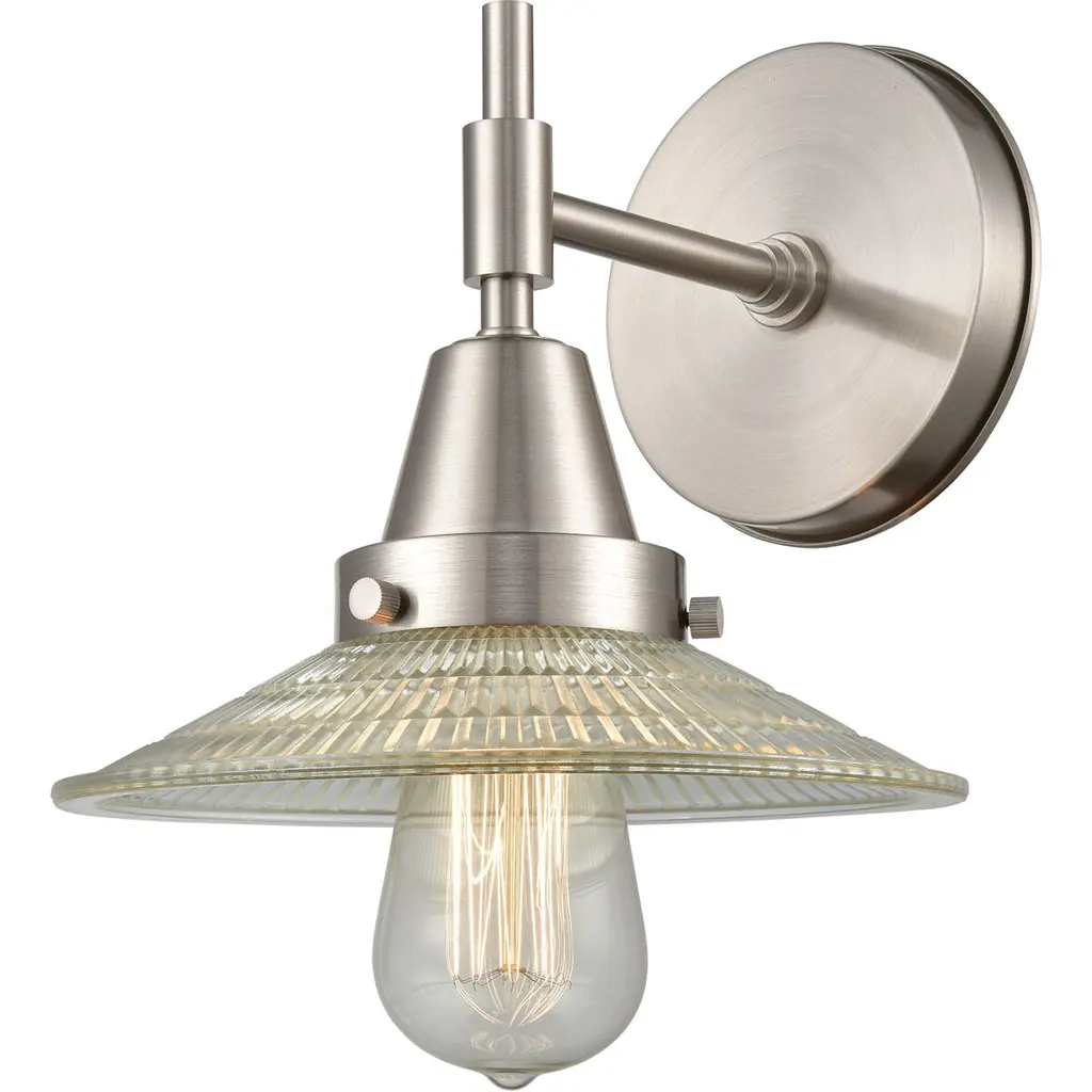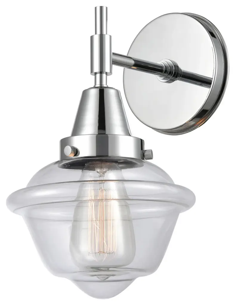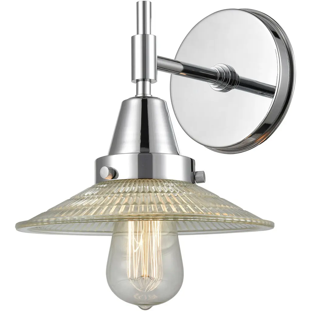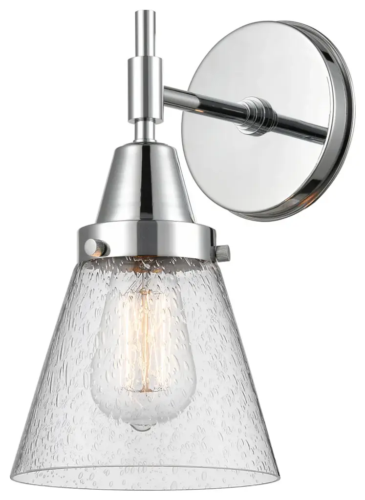 INNOVATIONS LIGHTING 447-1W-PC-G2-LED Caden 1 Light 9 inch Sconce. Innovations Lighting Caden 1 Light 9 inch Polished Chrome Sconce. Metal Finish (Body): Polished Chrome. Metal Finish (Canopy/Backplate): Polished Chrome. Glass or Metal Shade Color: Clear. Material: Steel, Glass. Shade Material: Glass. Dimension(in): 7.25(H) x 9(W) x 9.75(Ext). Backplate Dimension(in): 0.875(D) x 5(Dia). Shade Size(in): 2(H) x 9(Dia). Bulb: (1) 3.5 Watt LED Vintage Medium Base Bulb Included. Voltage: 120. Dimmable: Yes. Color Temperature(Kelvin): 2700. CRI: 82. Lumens: 350. Glass Type: Transparent . Glass or Metal Shade Shape: Cone. Shade Fitter Measurement: 3.25 inch Fitter. ADA Compliant: No. Style: Retro, Industrial. Ul Certification Type: Damp Location. Warranty: 2 Year Finish, Lifetime Electrical.